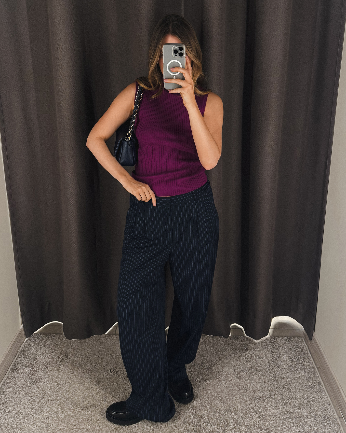 Стильные брюки OUI темно-синего цвета в вертикальную узкую полосу. Модель с завышенной талией на скрытой застежке, на защипах, имеются врезные карманы. Брюки можно сочетать с топом, рубашкой, блузой, джемпером, кардиганом, жакетом и жилетом.