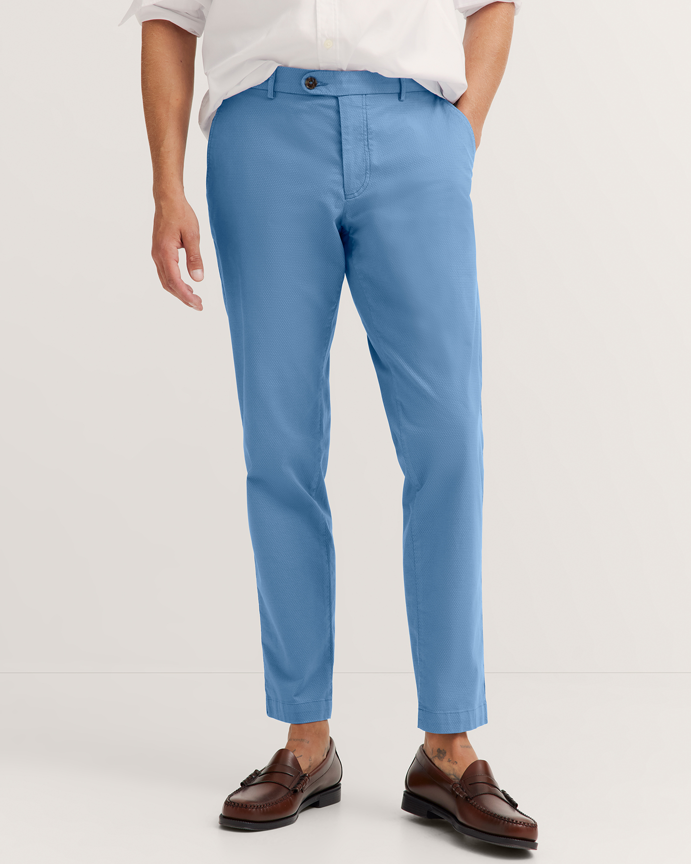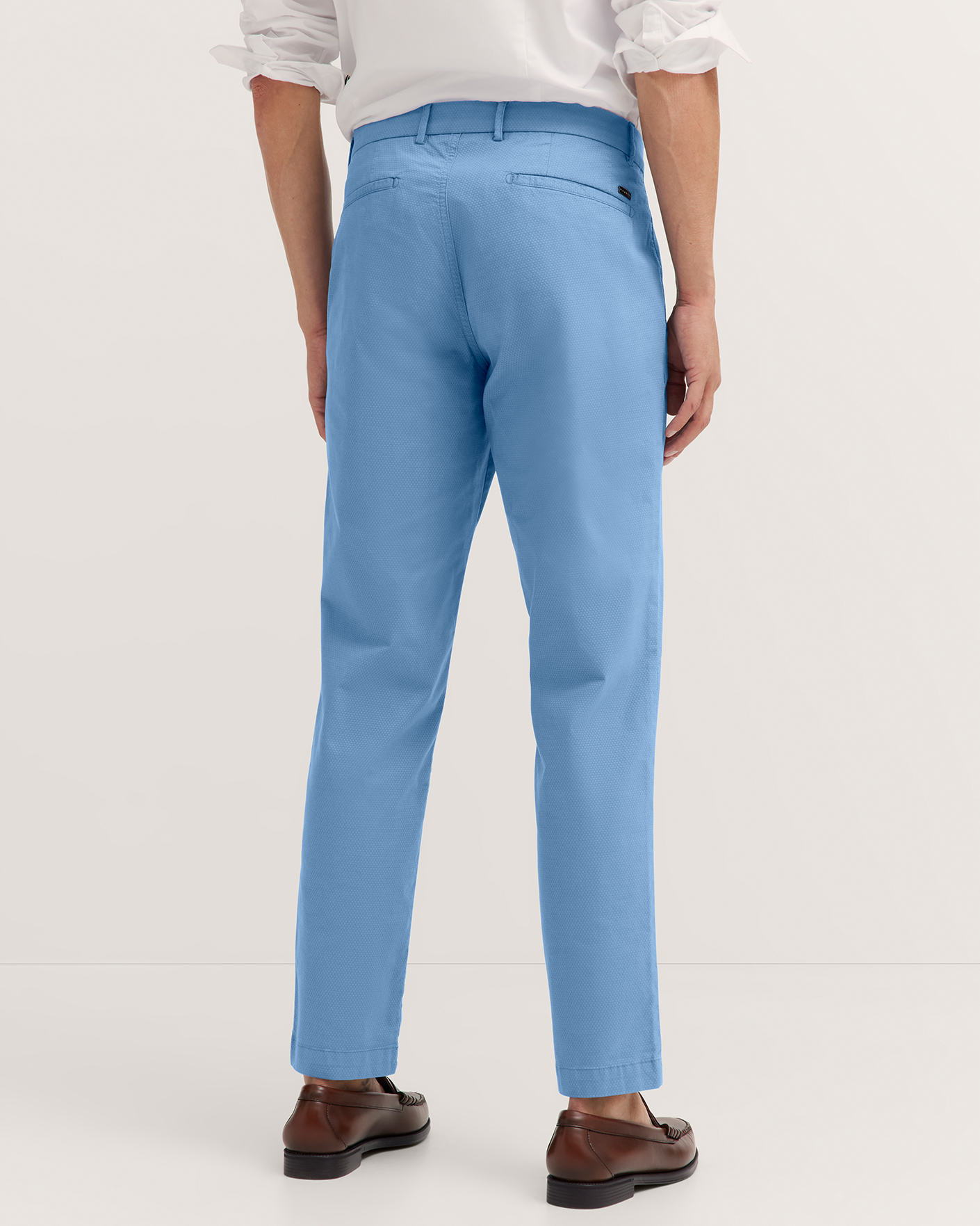 Брюки-чиносы Bugatti голубого цвета в мелкий оптический рисунок. Хлопковая модель на стандартной застежке, врезные карманы по бокам и сзади. Чиносы можно сочетать с рубашкой, джемпером, кардиганом, пиджаком, жилетом.