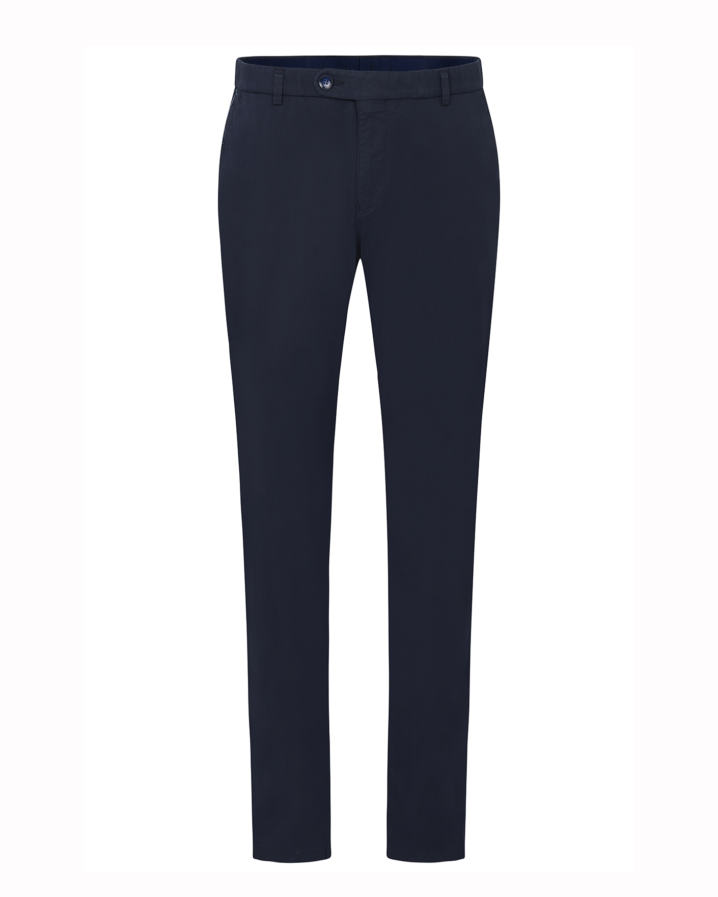 Брюки-чиносы Bugatti темно-синего цвета в строчный рисунок. Хлопковая модель на стандартной застежке, врезные карманы по бокам и сзади на пуговице. Чиносы можно сочетать с рубашкой, джемпером, кардиганом, пиджаком, жилетом.