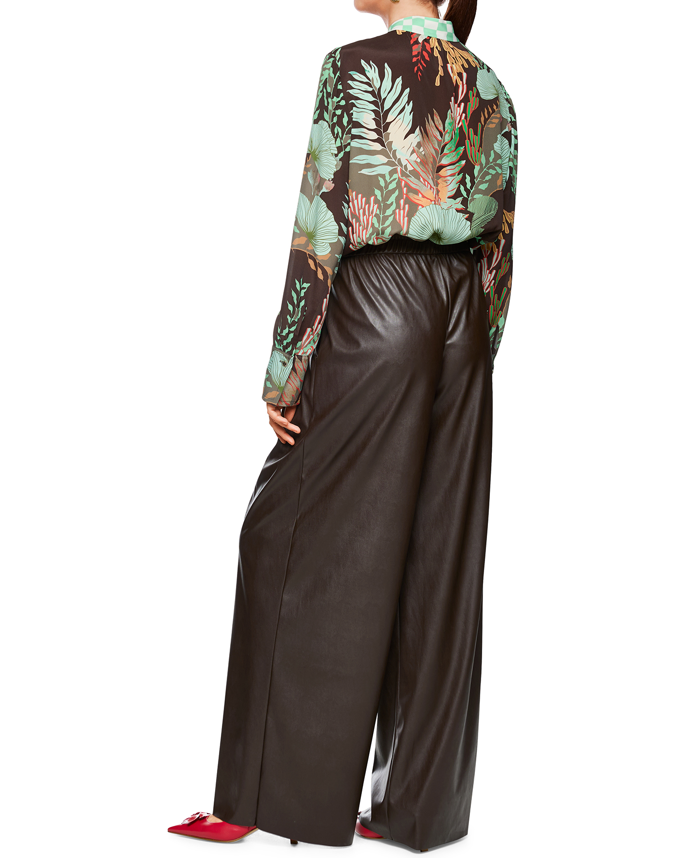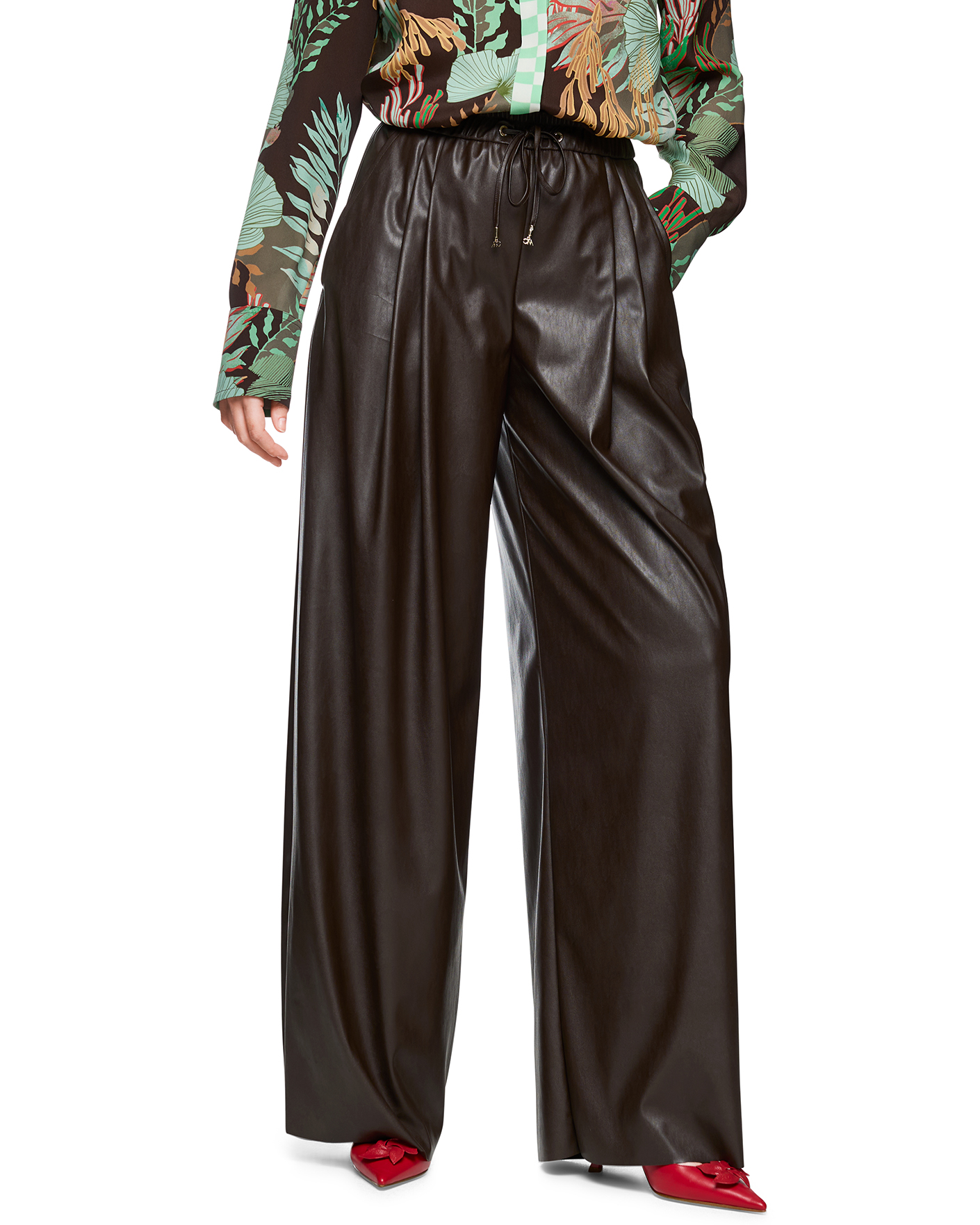 Идеальные брюки-джоггеры Marc Cain Collection коричневого цвета с покрытием. Модель с завышенной талией на эластичном поясе в складку и вставном шнурке. Без застежки, имеются врезные карманы по бокам. Джоггеры станут идеальным решением на каждый день.