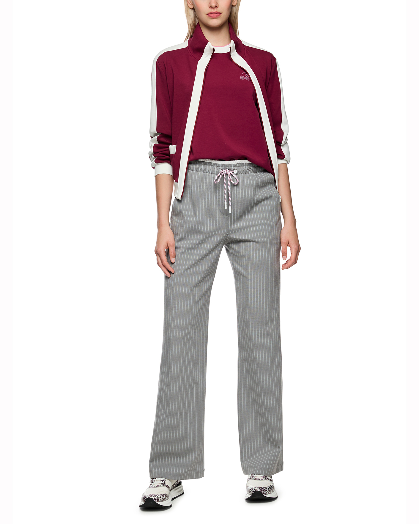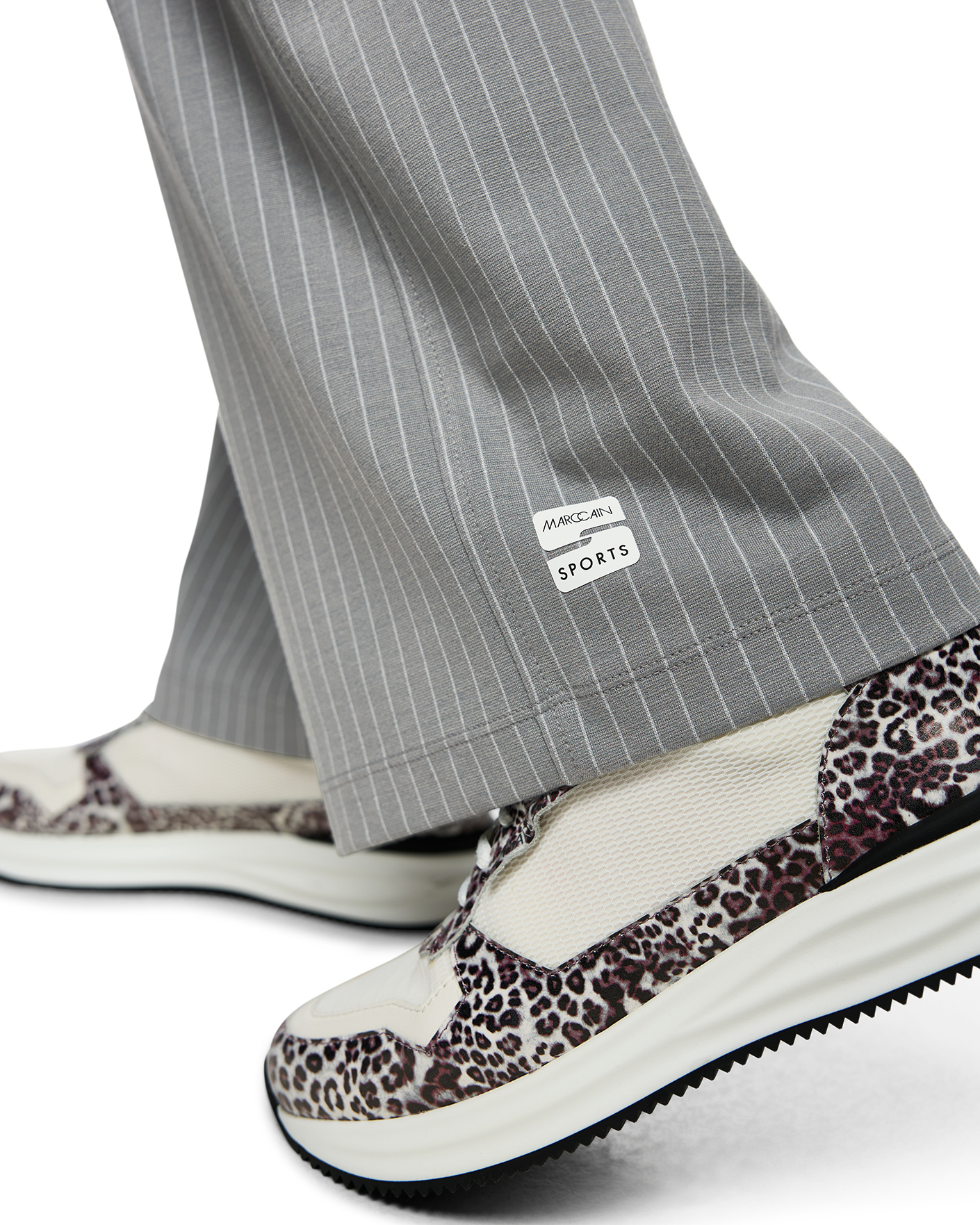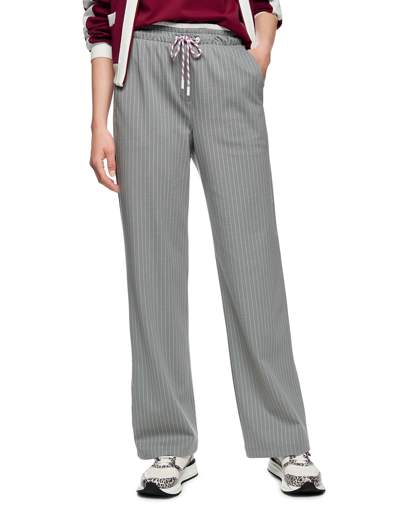 Брюки-джоггеры Marc Cain Sport серого цвета в узкую вертикальную полосу. Модель с завышенной талией на эластичном поясе со вставным шнурком, имеются врезные карманы по бокам. Джоггеры отлично впишутся в ваш гардероб.