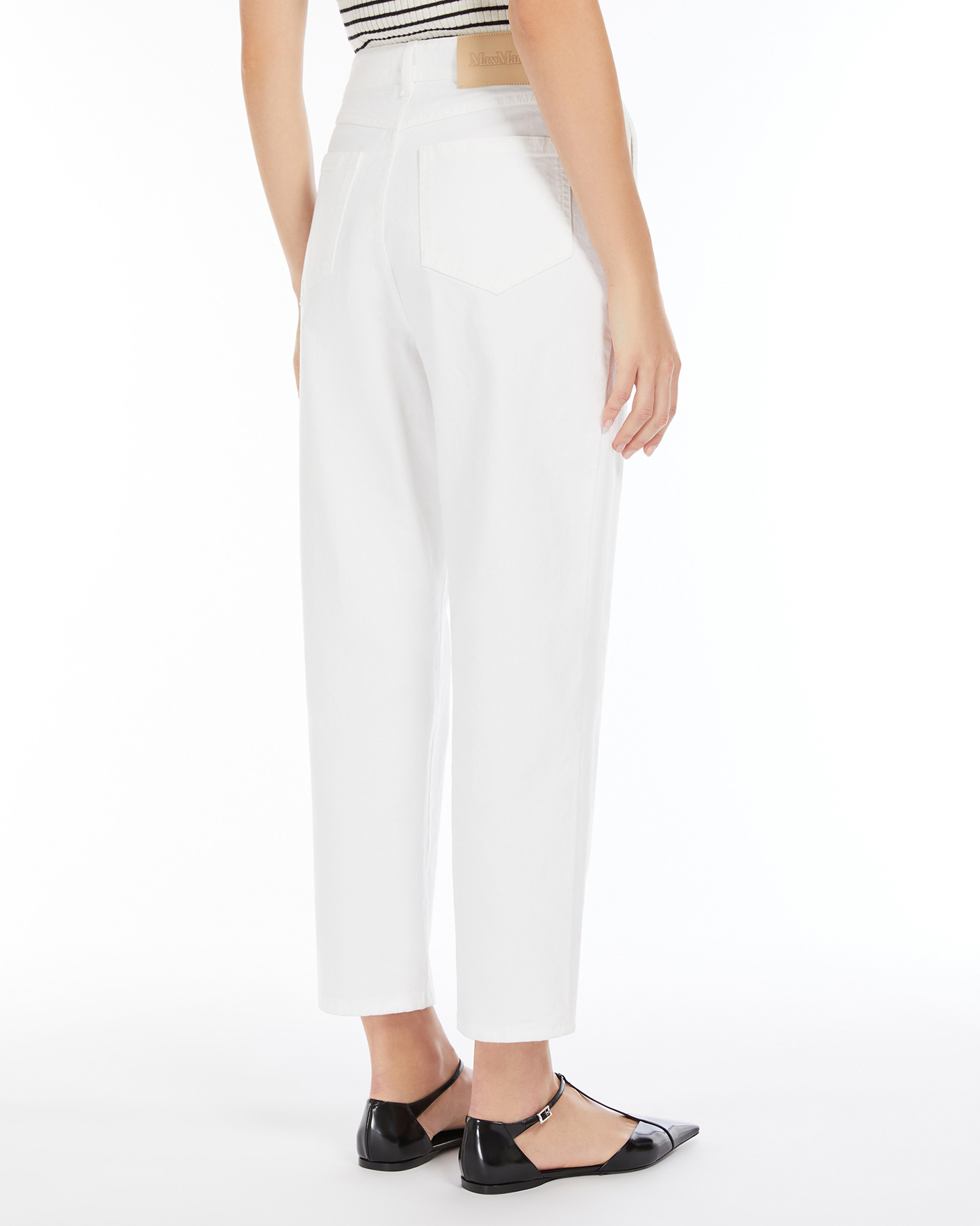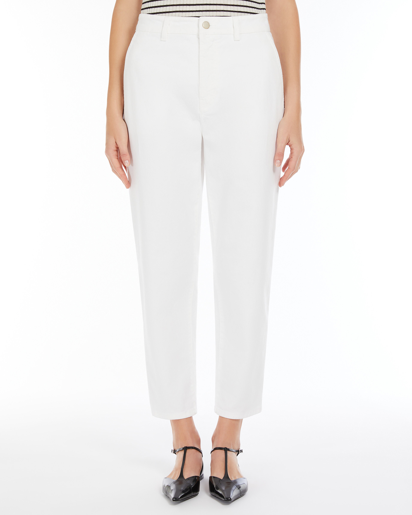 Зауженные капри Max Mara Studio белого цвета. Хлопковая модель с завышенной талией на стандартной застежке, карманы по бокам и накладные сзади. Капри отлично впишутся в ваш гардероб.