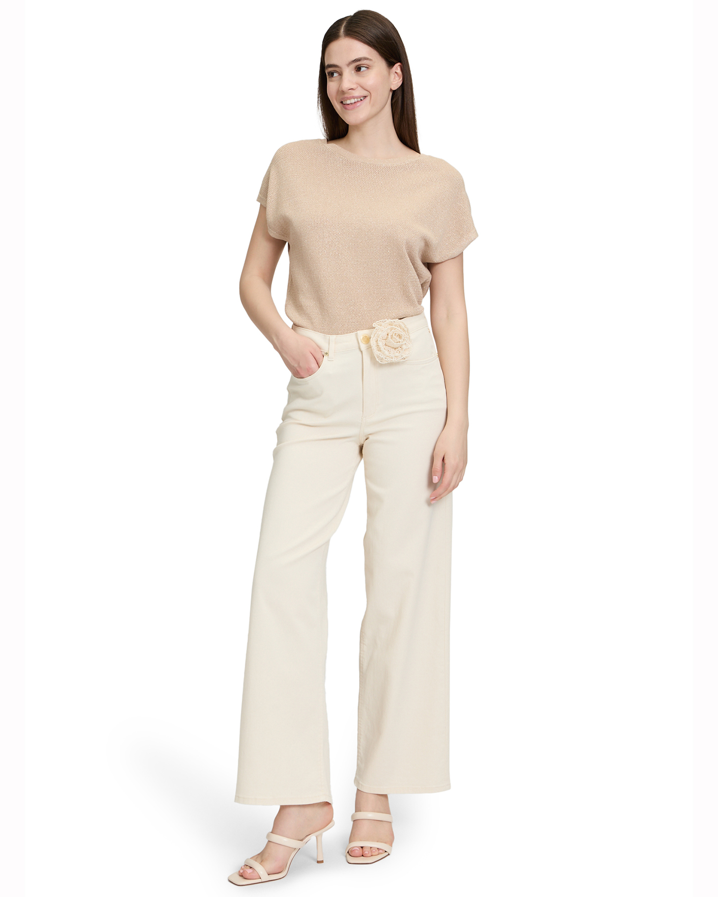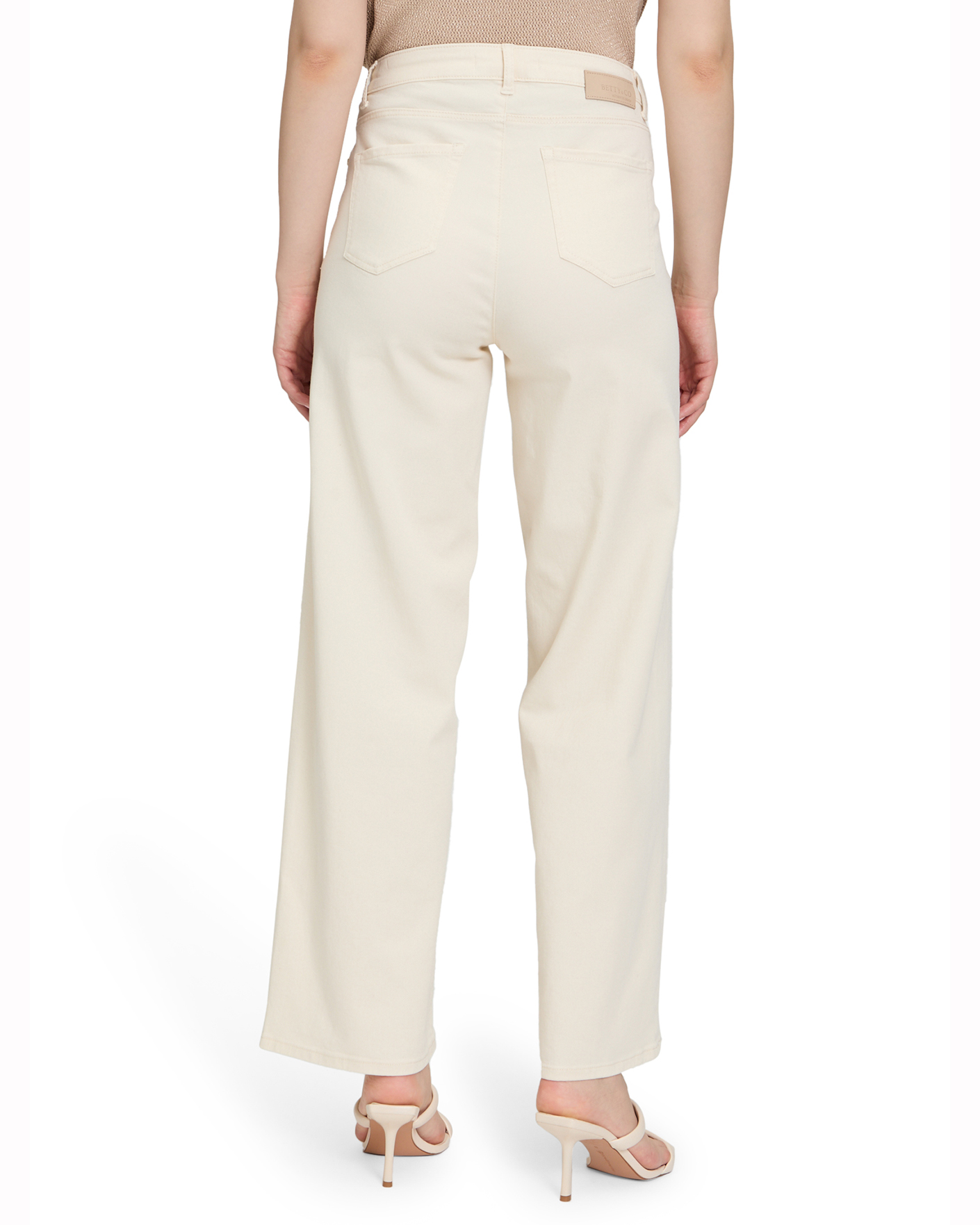 Джинсы Betty&Co молочного цвета с декором в виде ажурного цветка на талии. Хлопковая модель с завышенной талией на стандартной застежке, карманы по бокам и накладные сзади. Джинсы - база на каждый день.