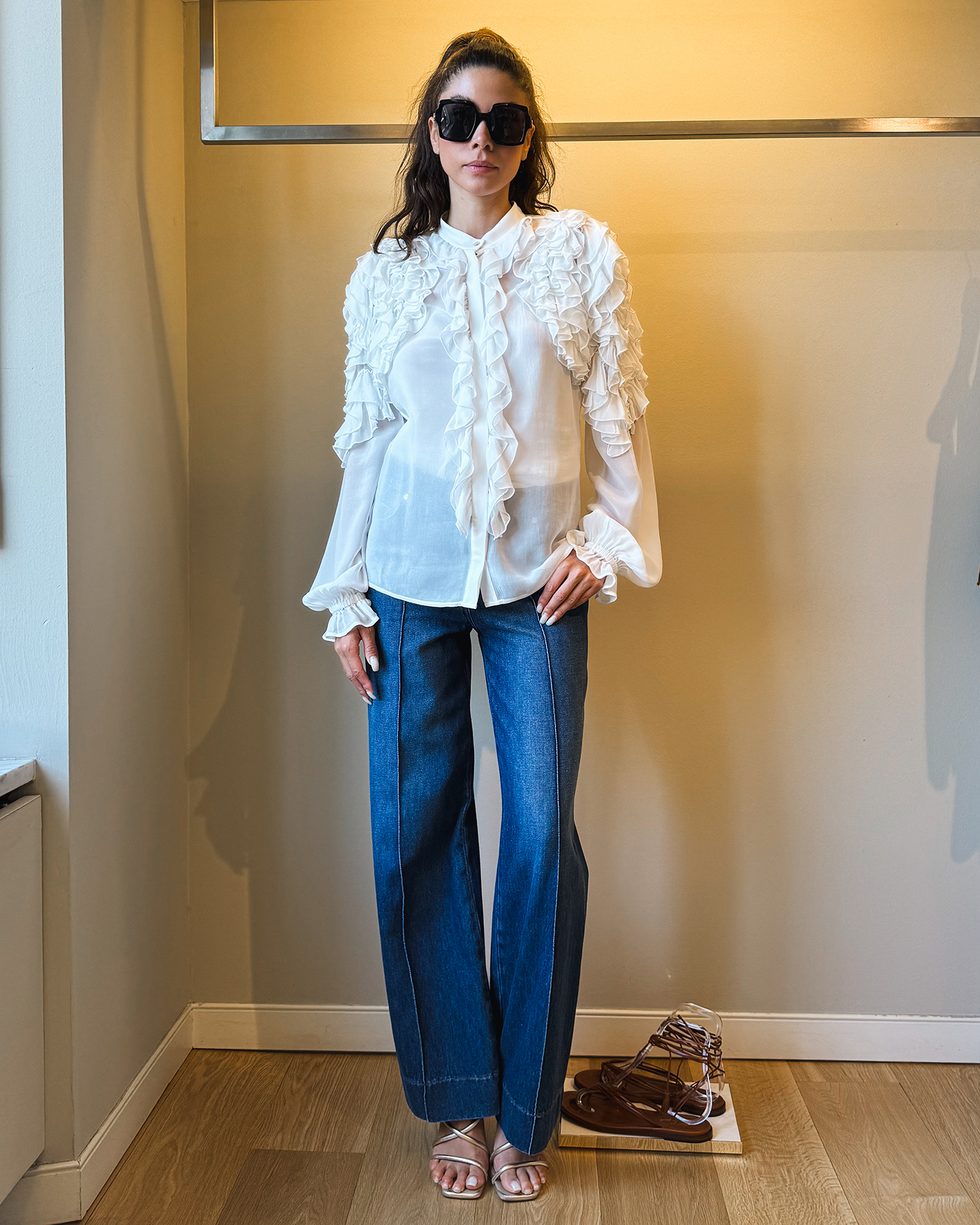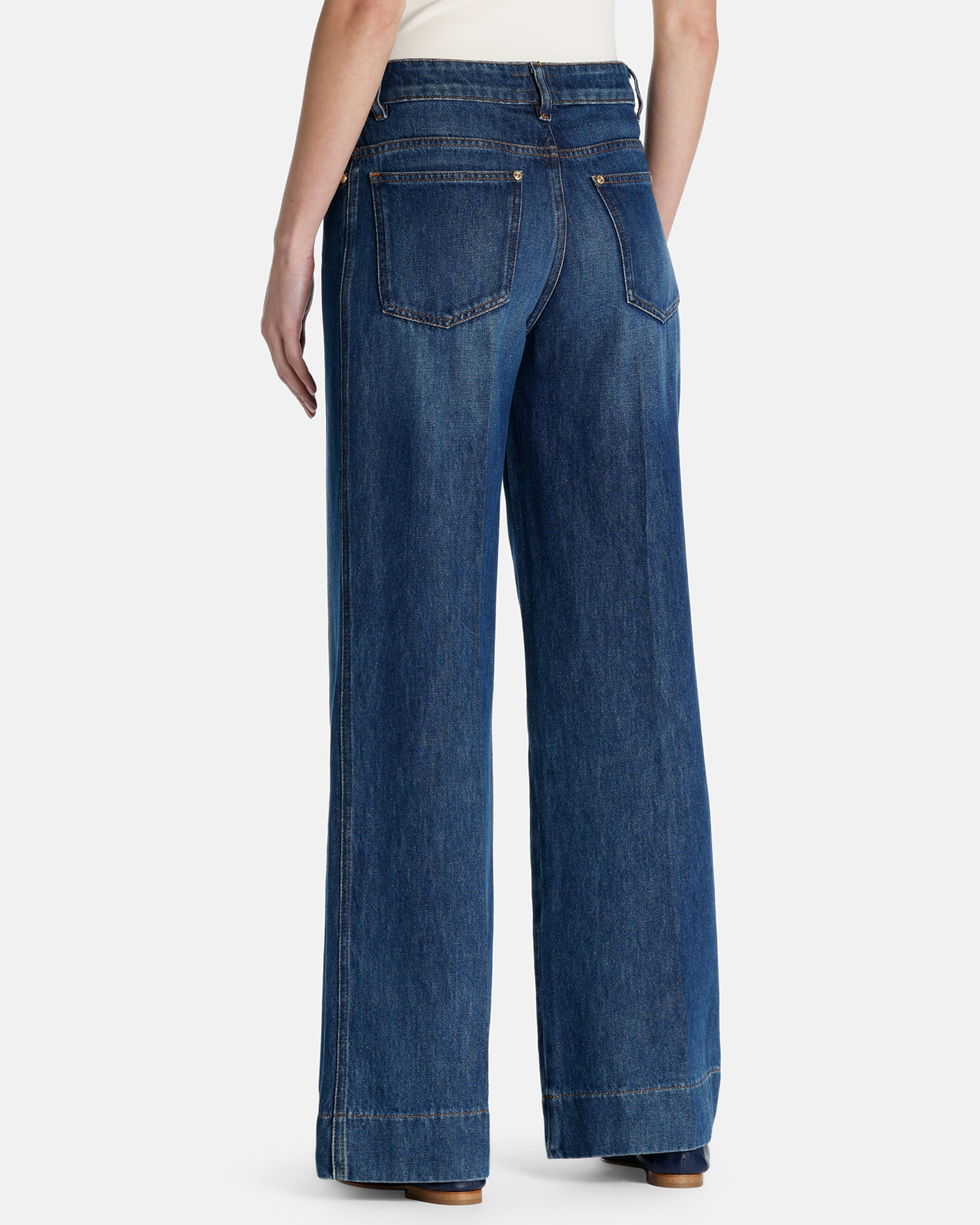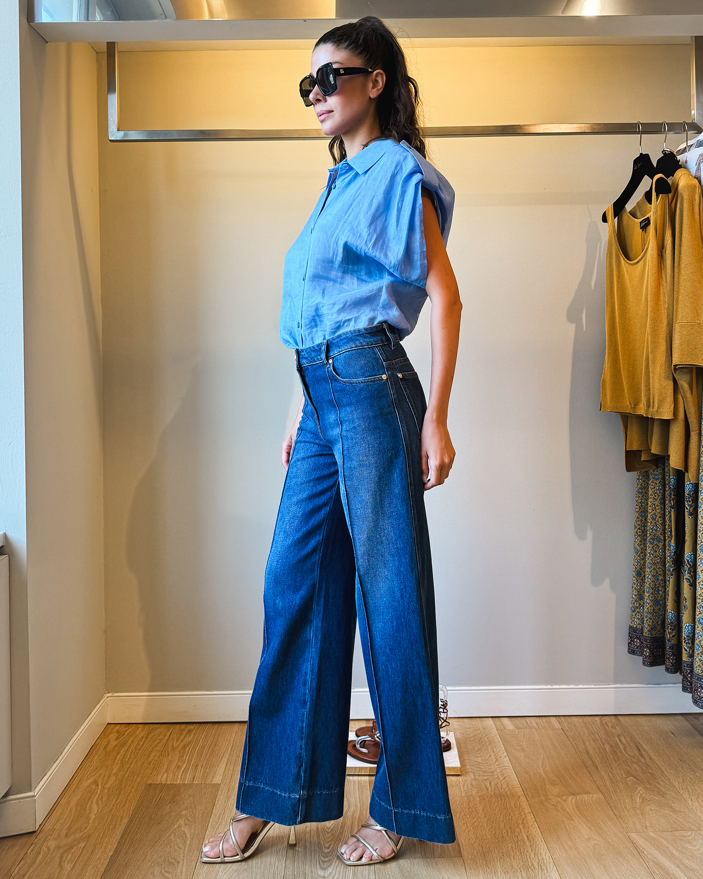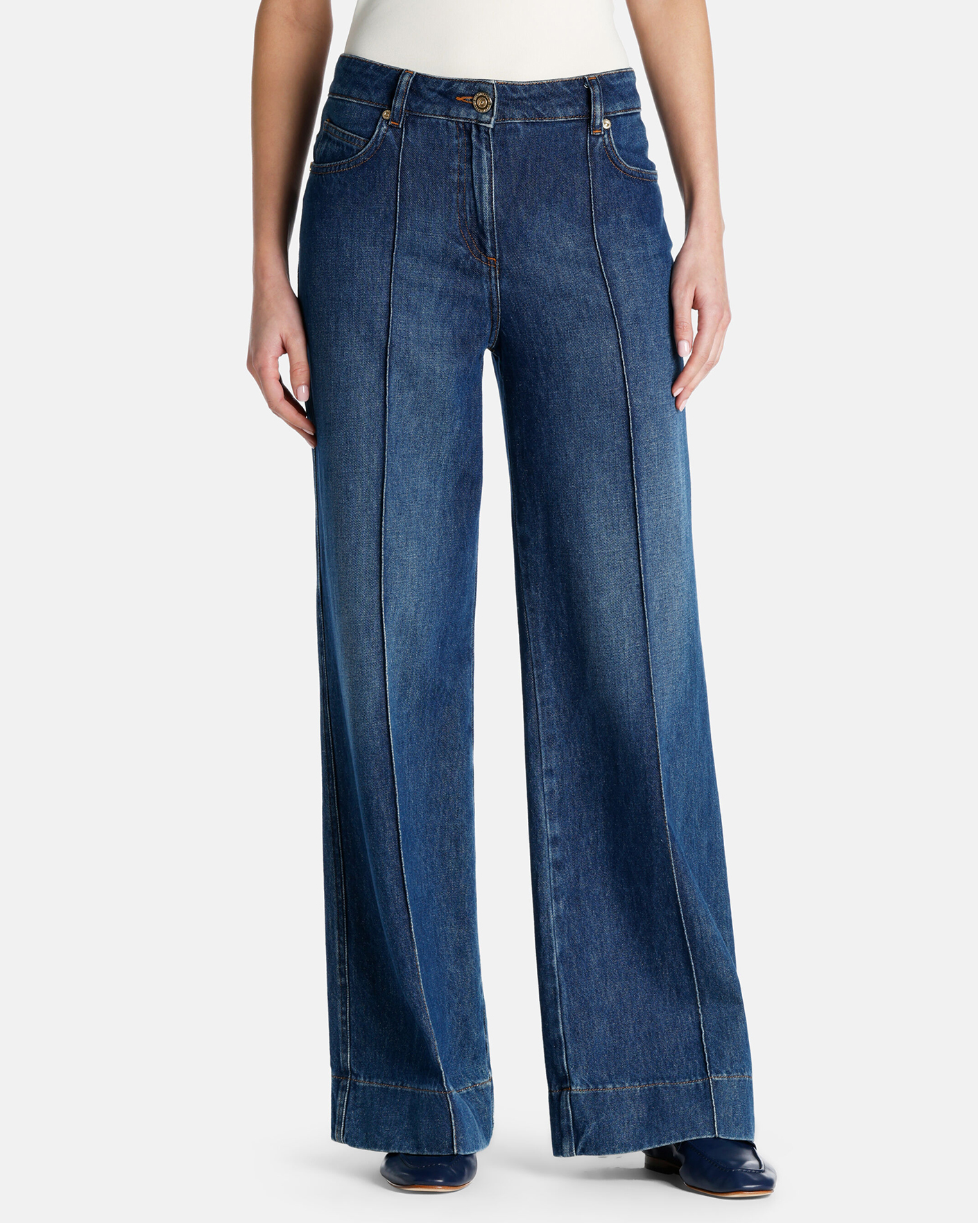 Джинсы Luisa Spagnoli синего цвета из 100% хлопка. Модель на стандартной застежке, карманы по бокам и сзади, а также выделенные стрелки. Джинсы - база на каждый день.