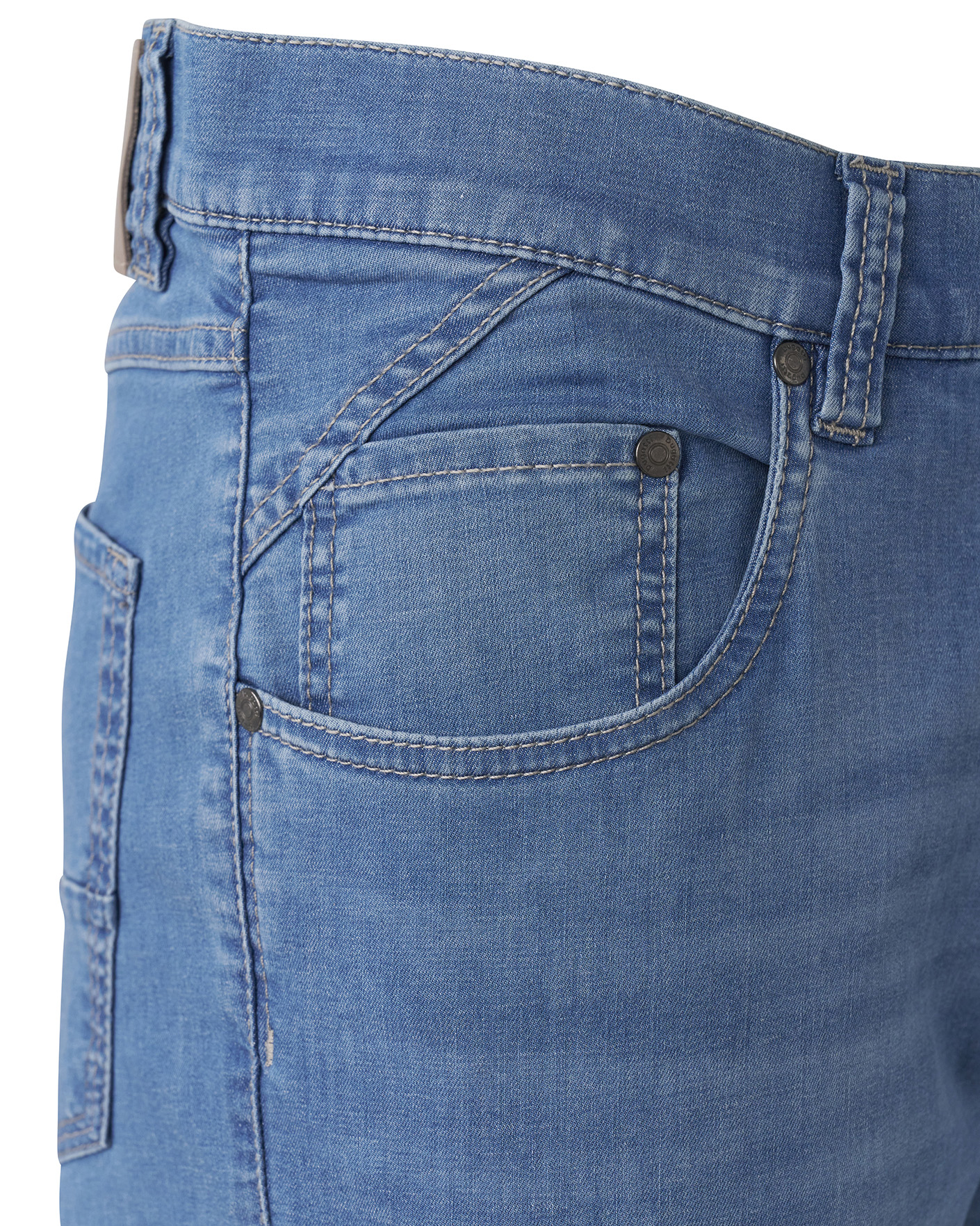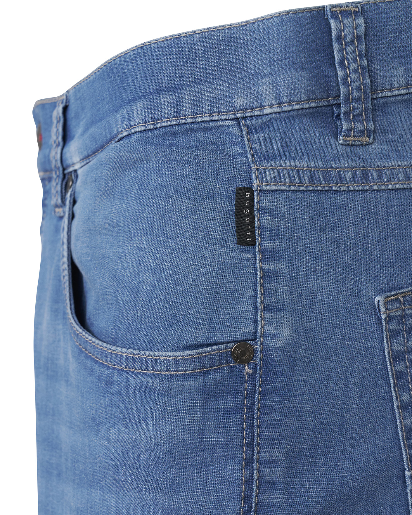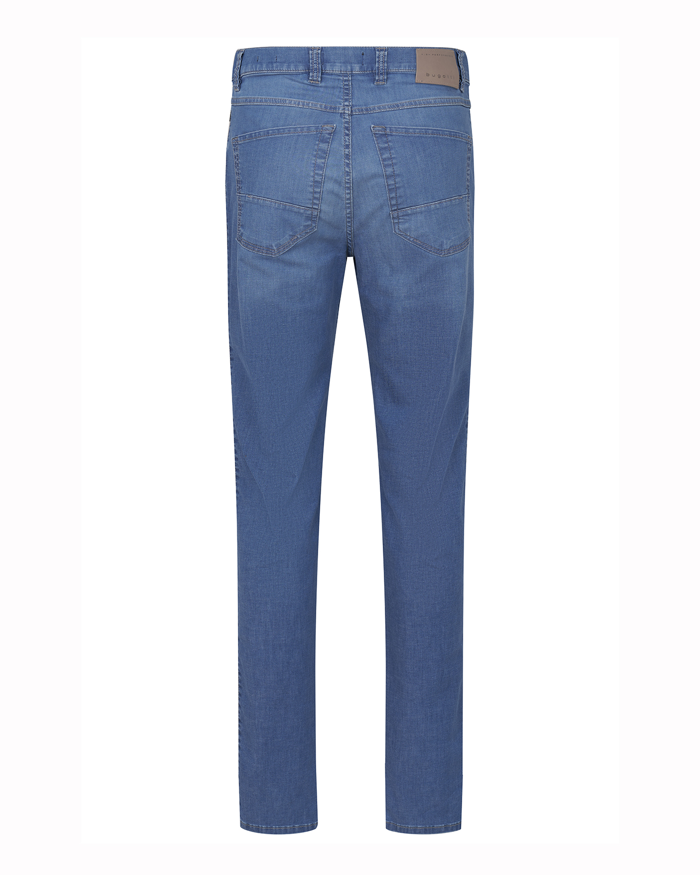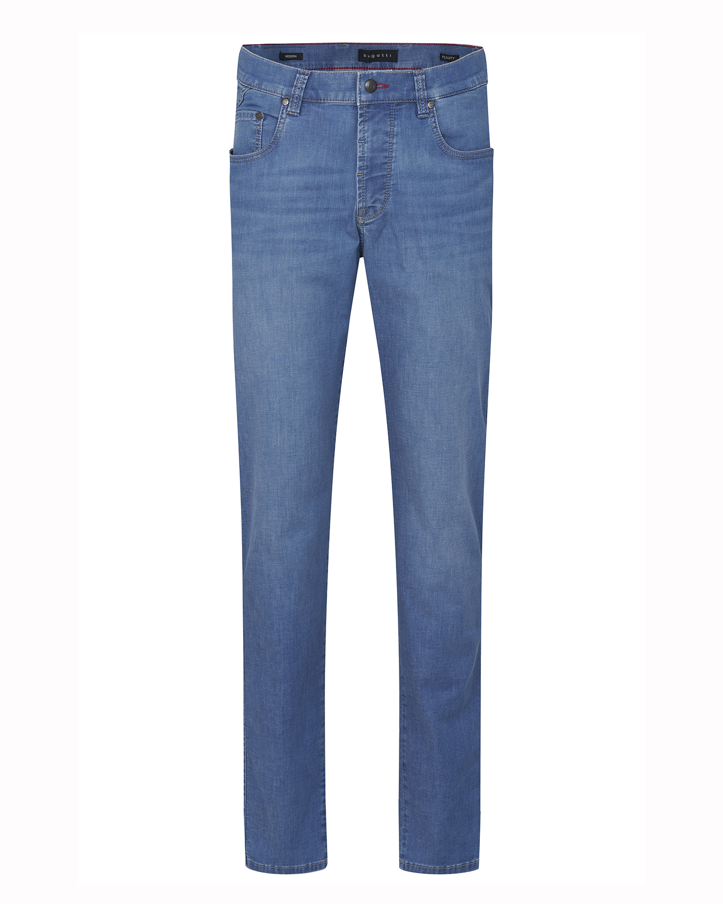 Джинсы Bugatti голубого цвета в строчный рисунок. Хлопковая модель на стандартной застежке, врезные карманы по бокам, накладные сзади. Джинсы отлично впишутся в повседневный гардероб.