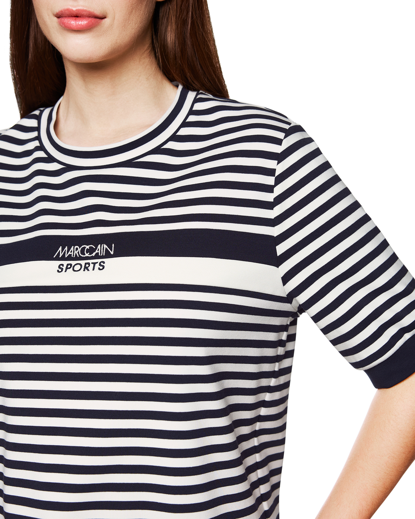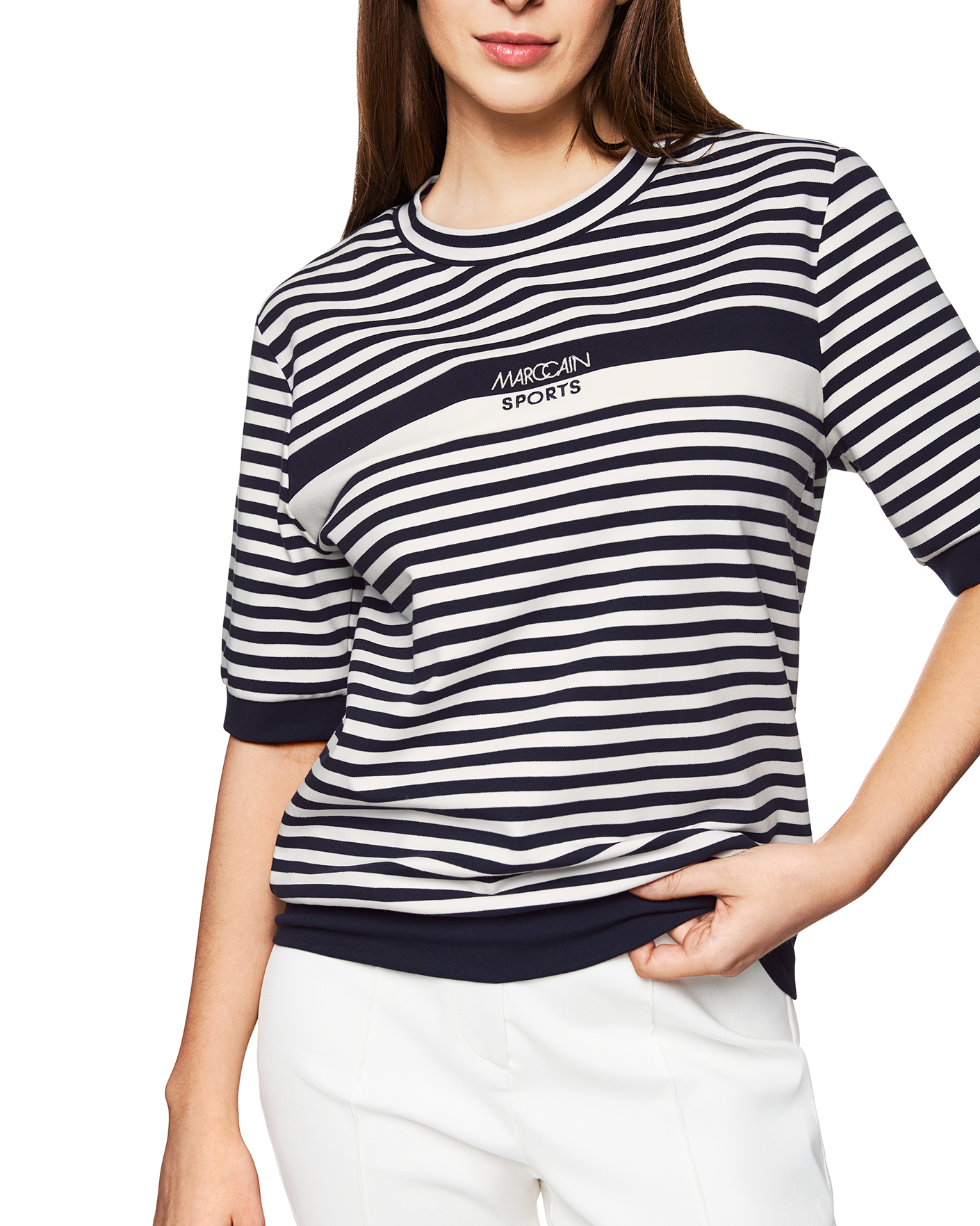Футболка Marc Cain Sport бело-синего цвета в горизонтальную полосу. Модель с круглым вырезом и короткими рукавами. Футболка - универсальная вещь на каждый день.