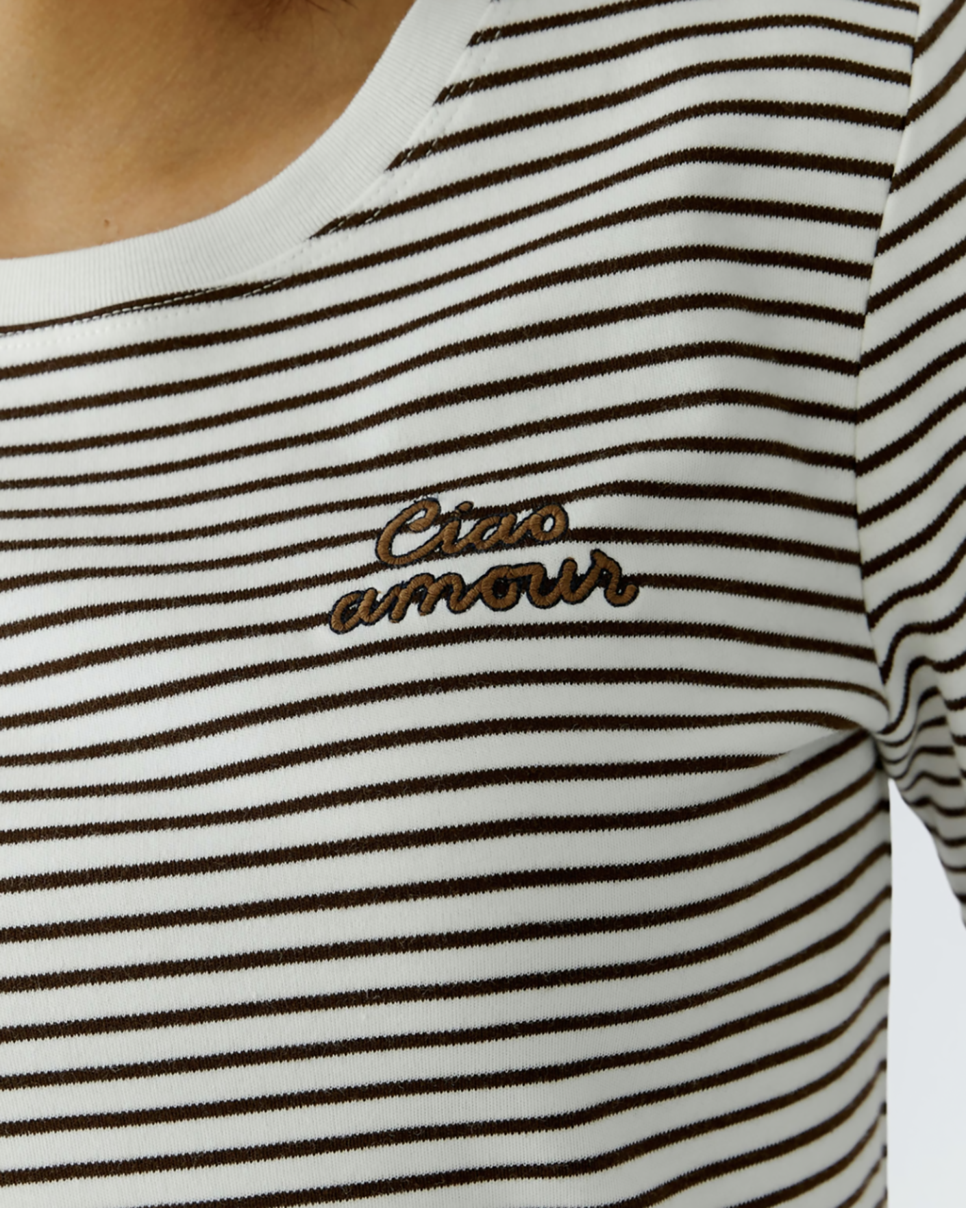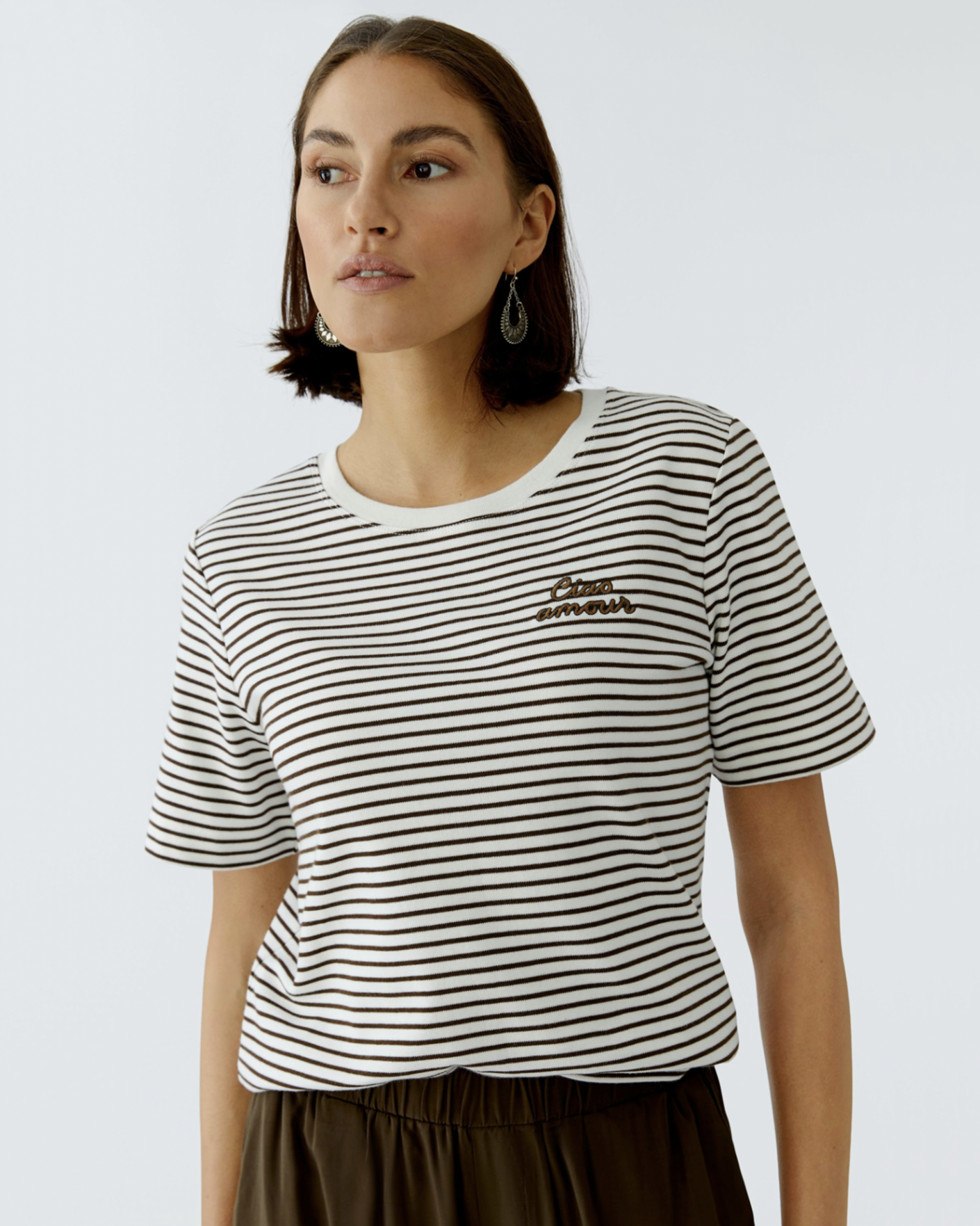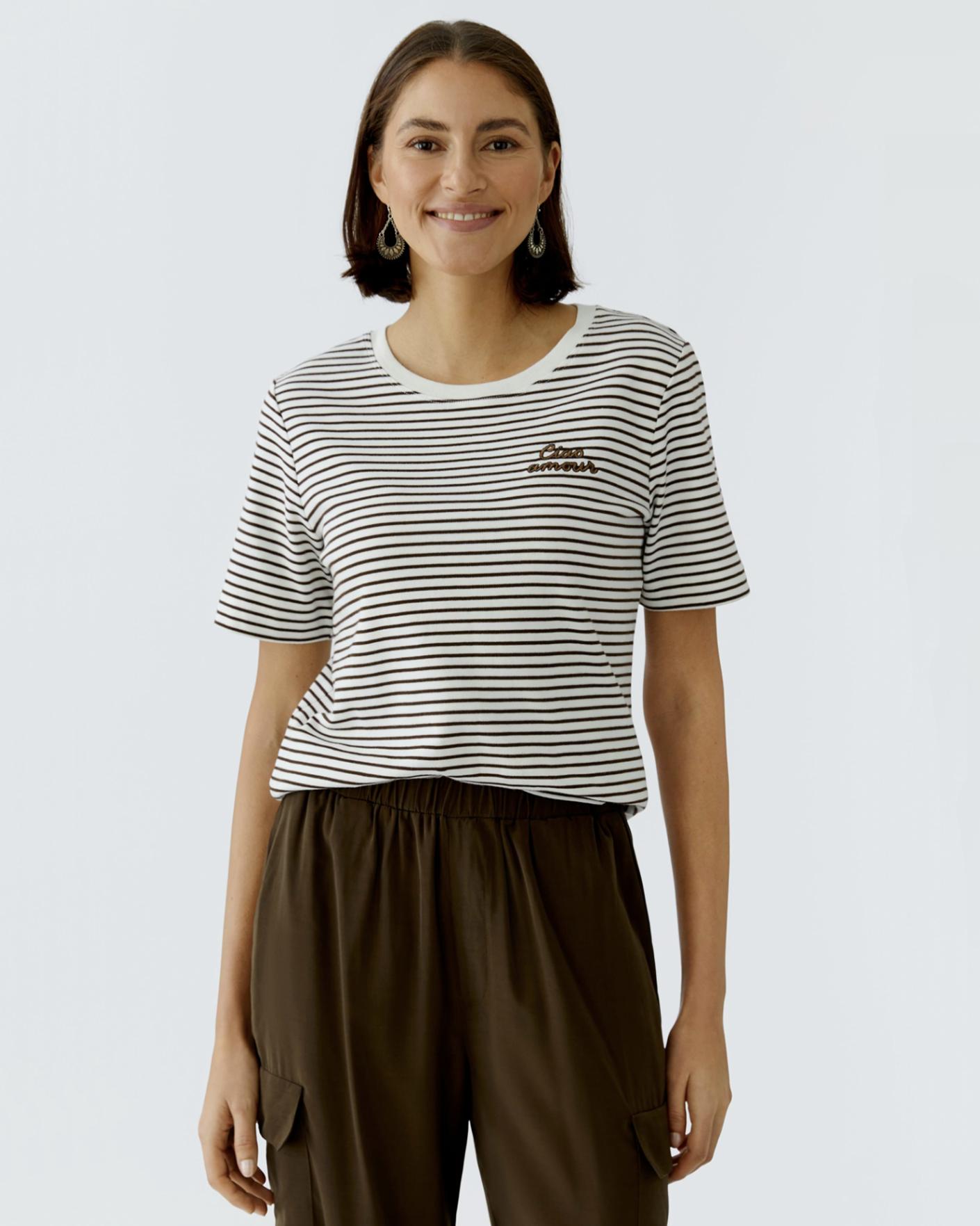 Футболка OUI бело-коричневого цвета в горизонтальную полосу и аккуратной нашивкой. Модель из 100% хлопка, круглый вырез, короткие рукава. Футболка отлично впишется в повседневный гардероб.