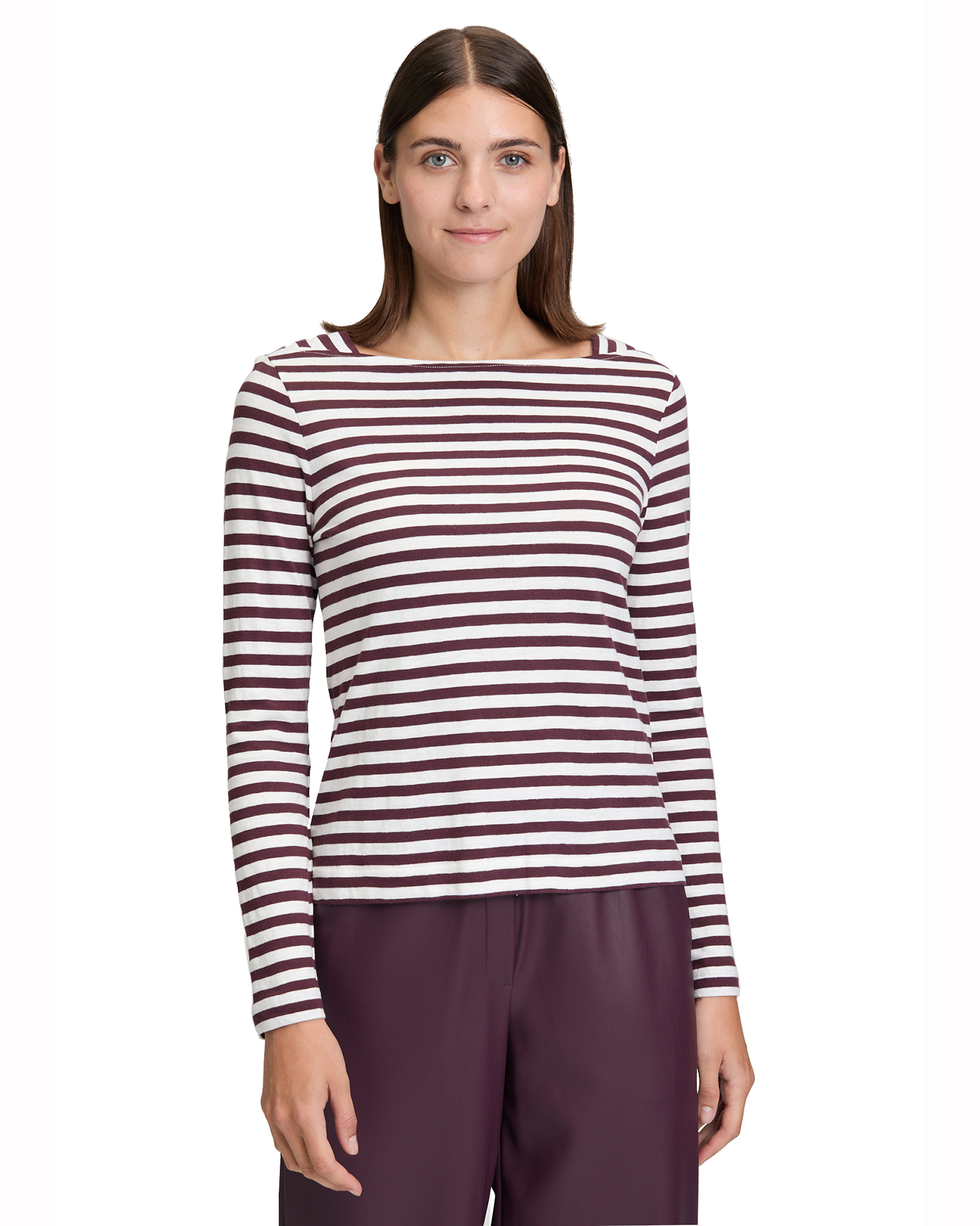 Футболка Betty&Co бело-бордового цвета в горизонтальную полосу. Модель из 100% хлопка, вырез - лодочка, длинные рукава. Футболка отлично сочетается с любым гардероб.