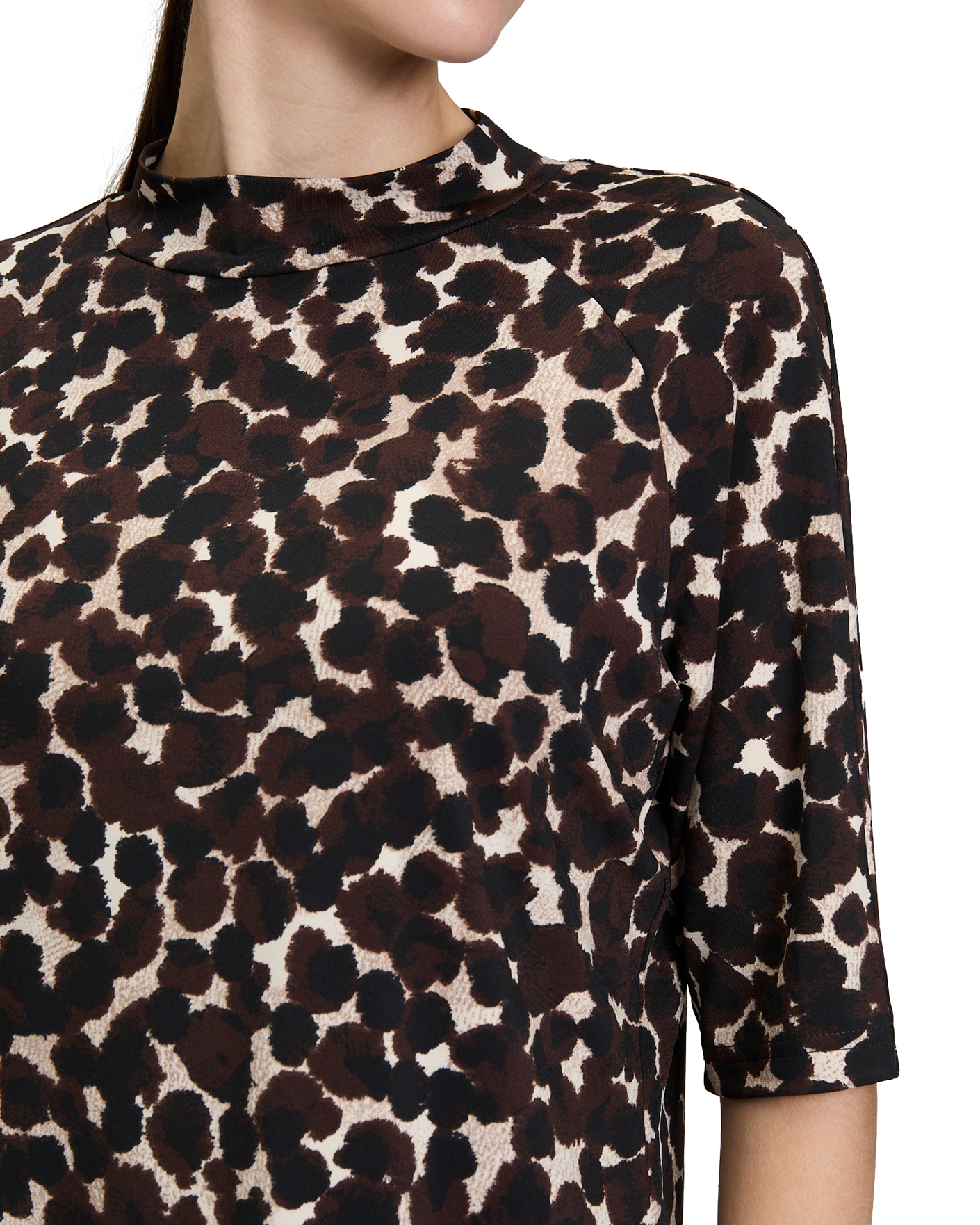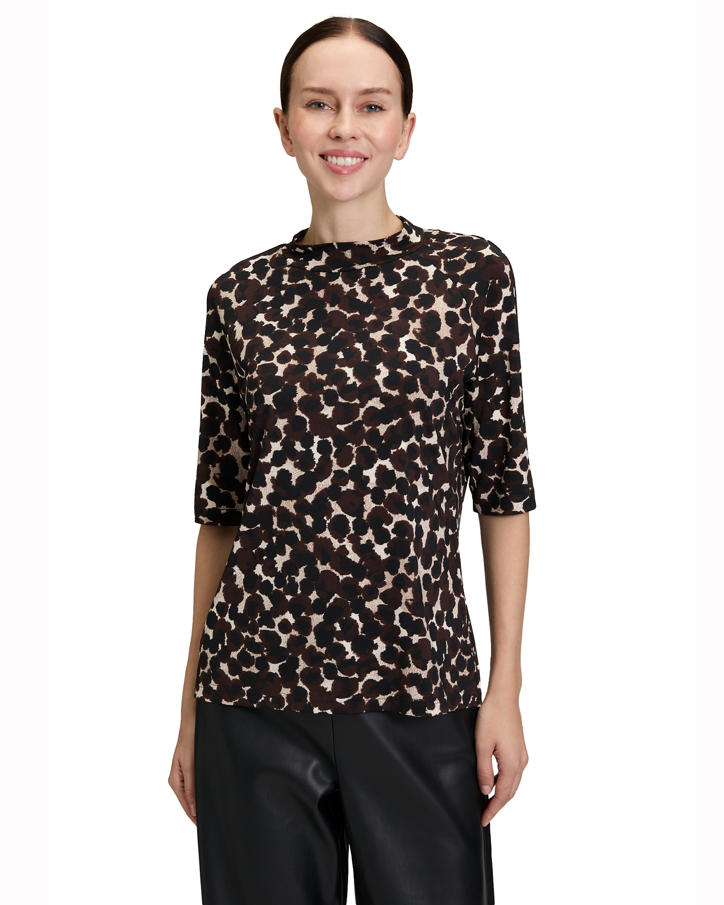 Футболка Betty Barclay коричневого цвета в абстрактный принт. Модель с небольшим воротником-стойка и короткими рукавами. Футболка - база на каждый день.