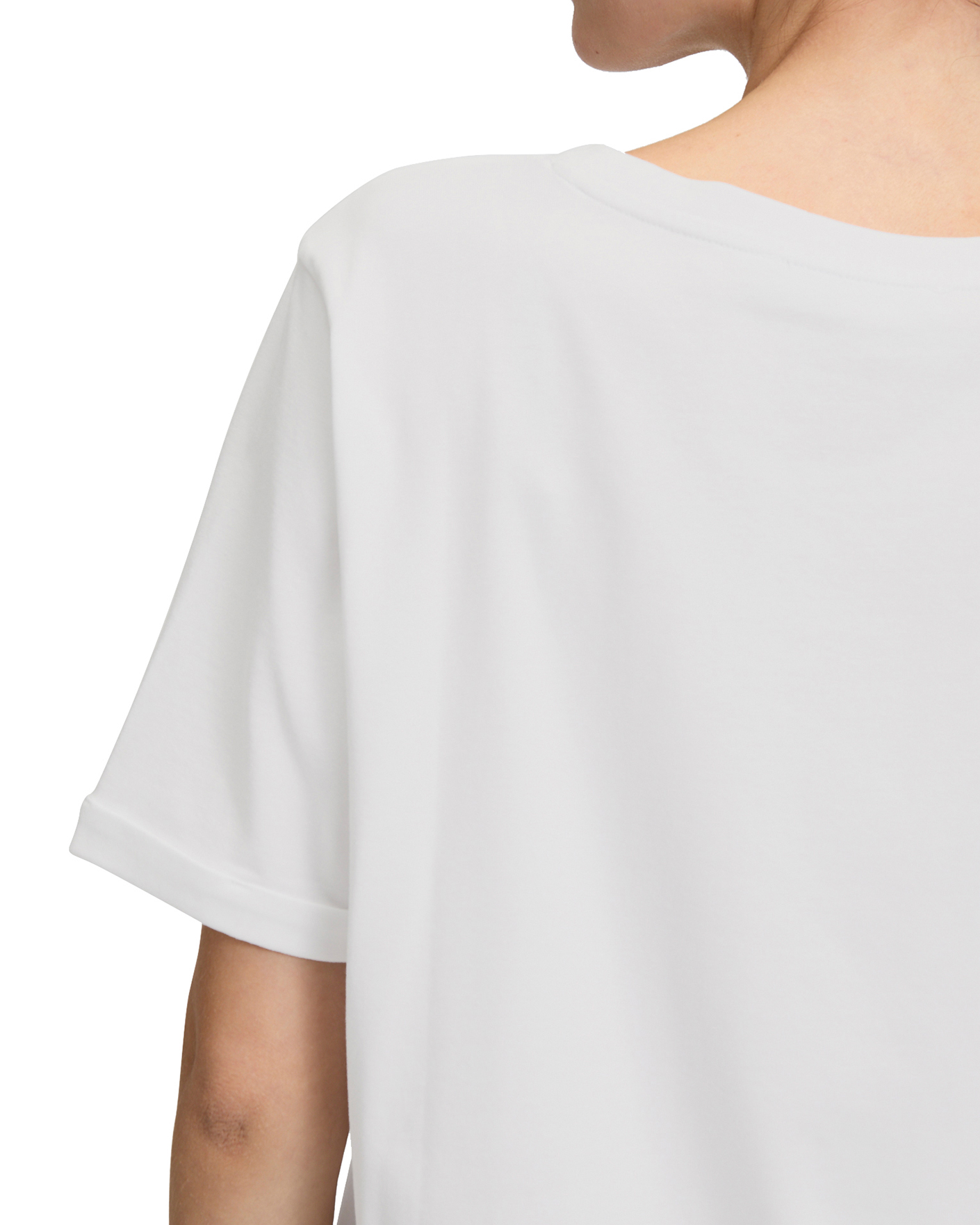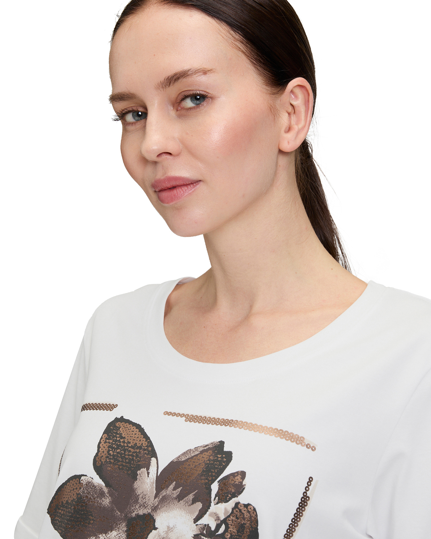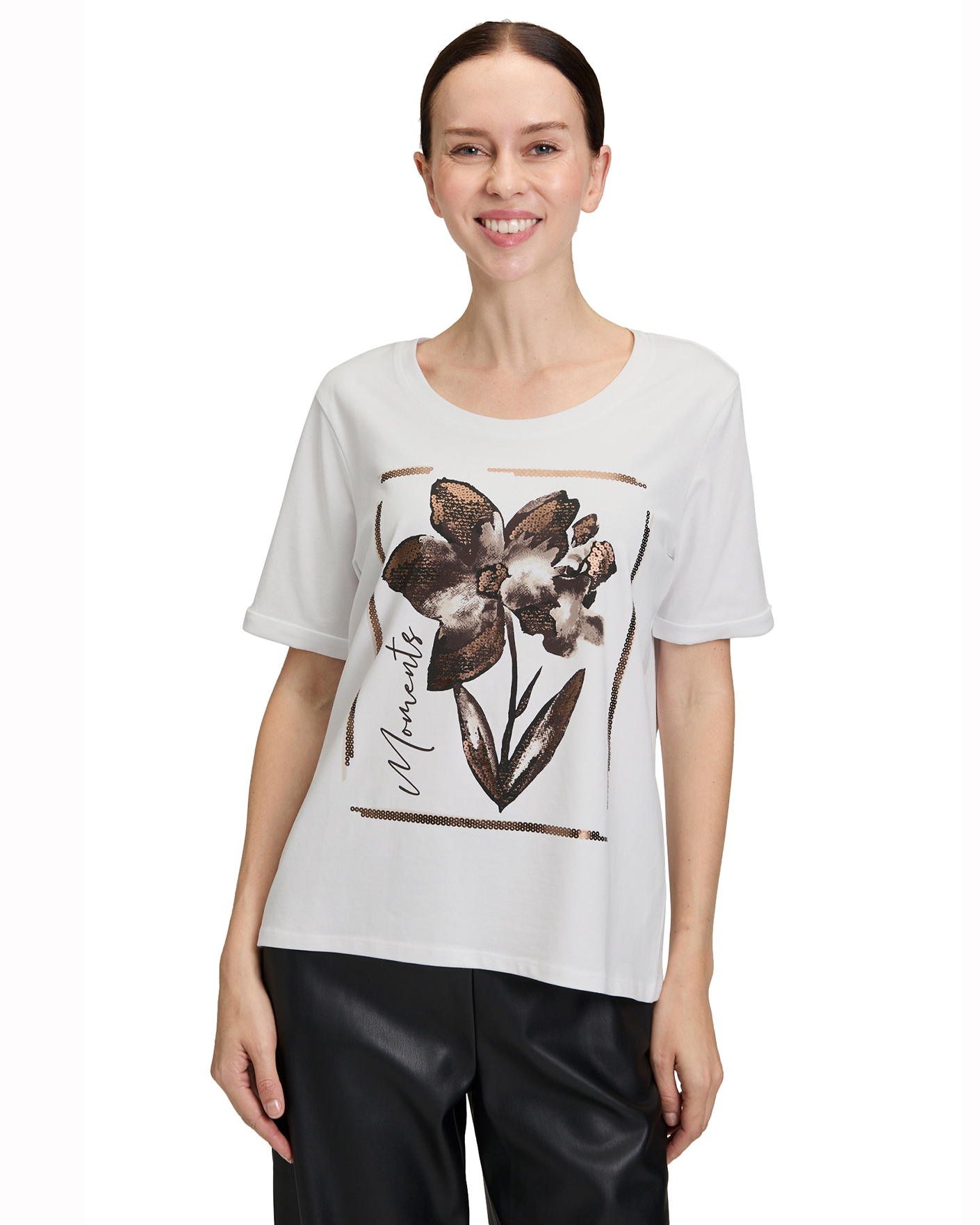 Футболка Betty Barclay белого цвета с цветочным принтом и декором в виде пайеток. Хлопковая модель с круглым вырезом и короткими рукавами с отворотами. Футболка отлично впишется в повседневный гардероб.