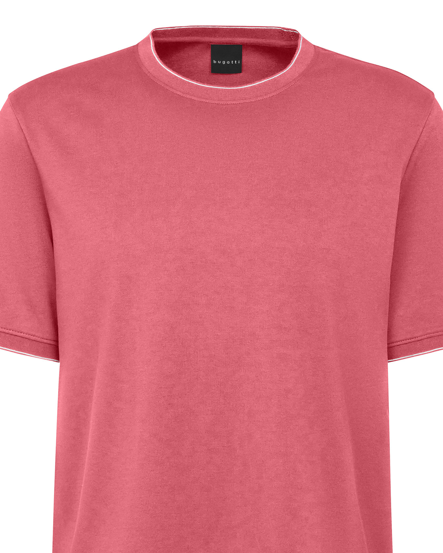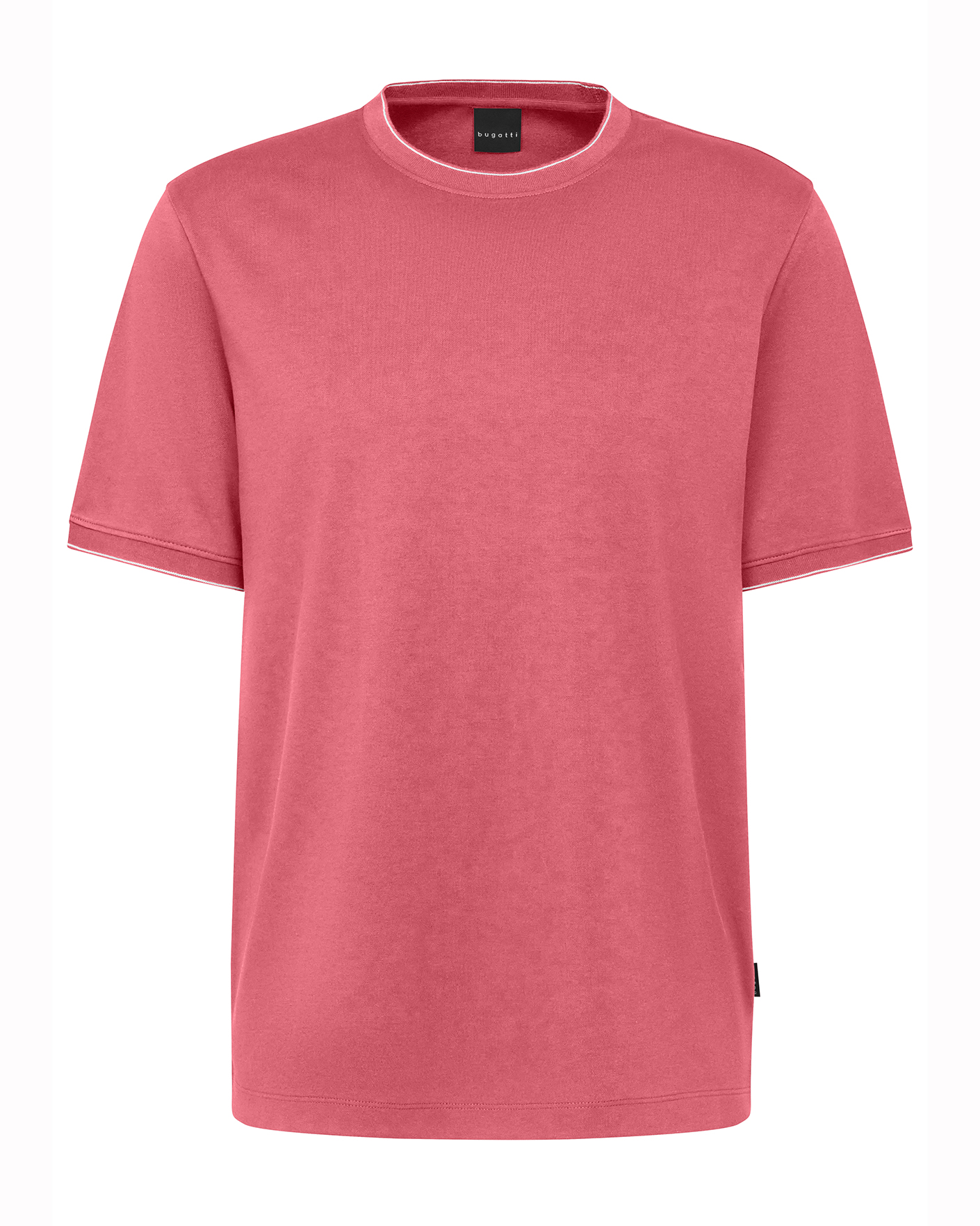 Футболка Bugatti красного цвета в мелкий строчный рисунок. Модель прямого кроя, круглый вырез и короткие рукава на тонкой ребристой резинке. Футболка - универсальная вещь на каждый день.