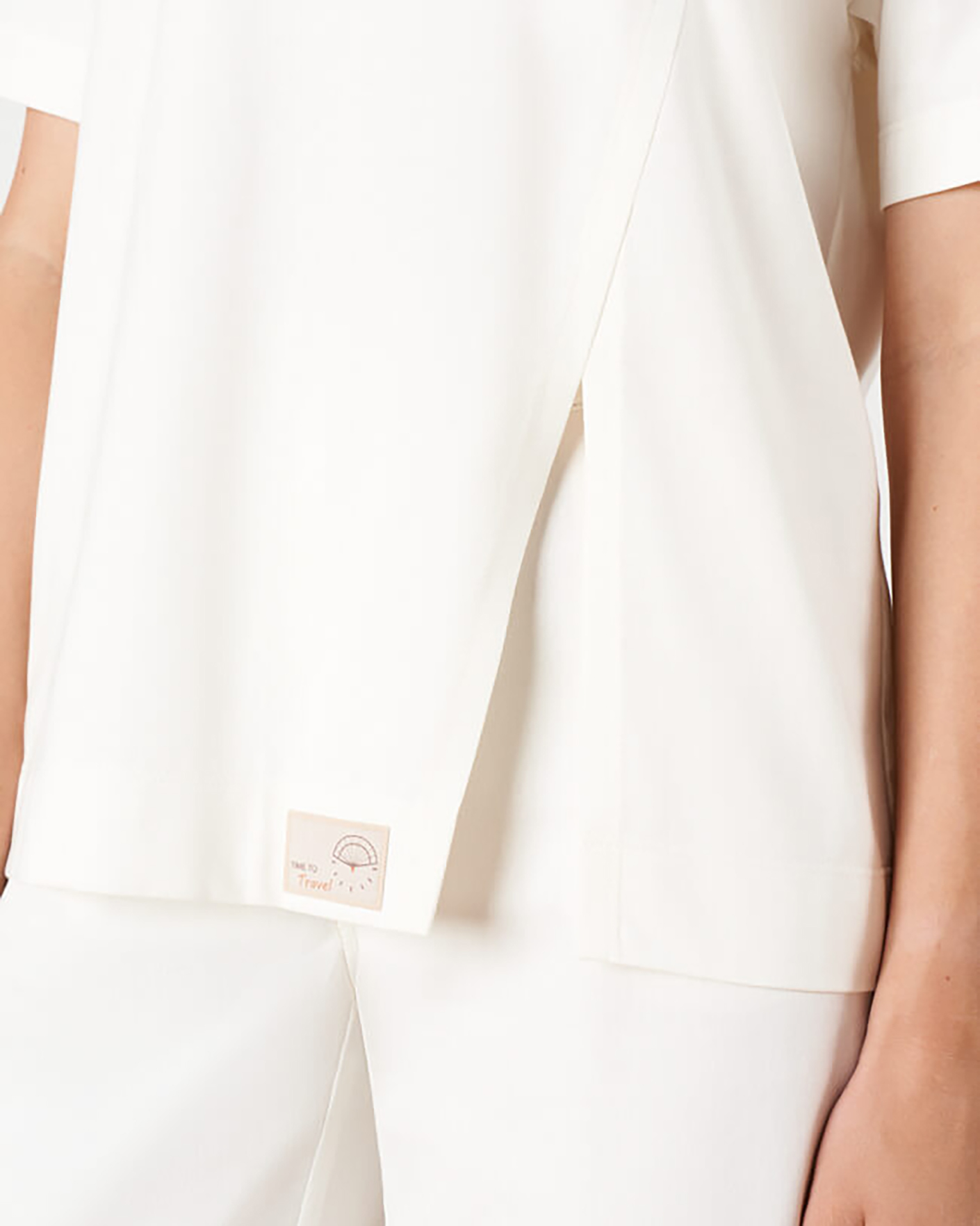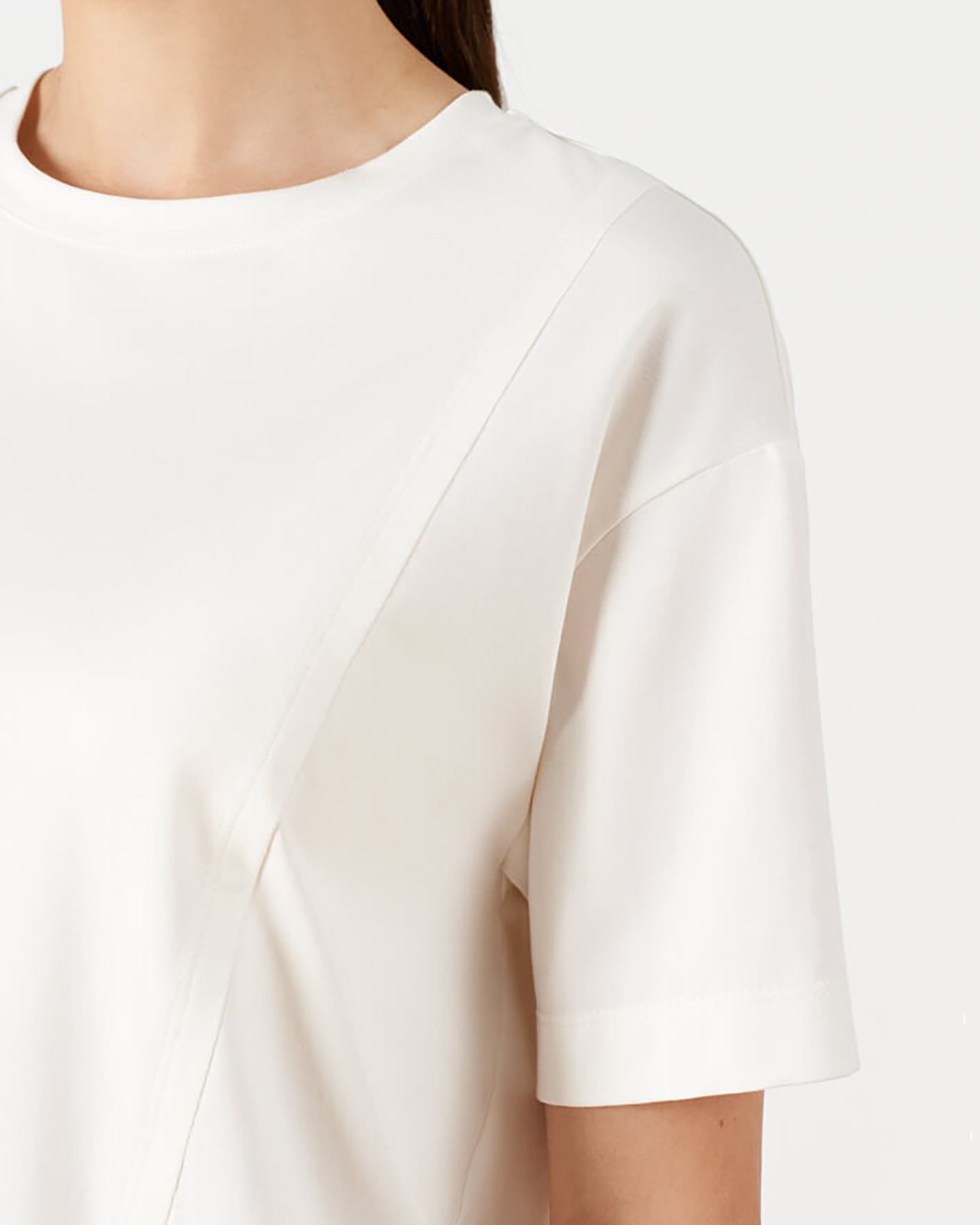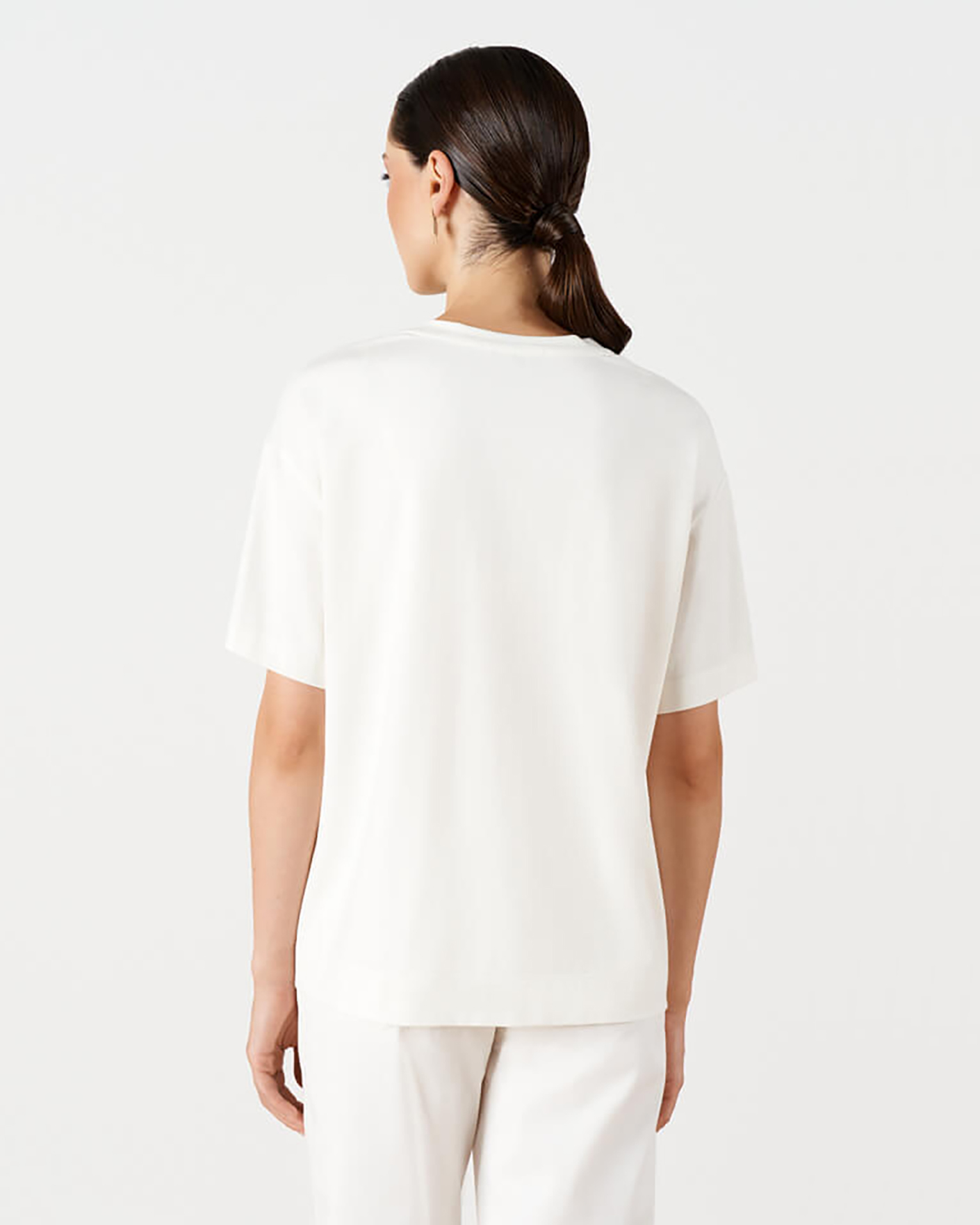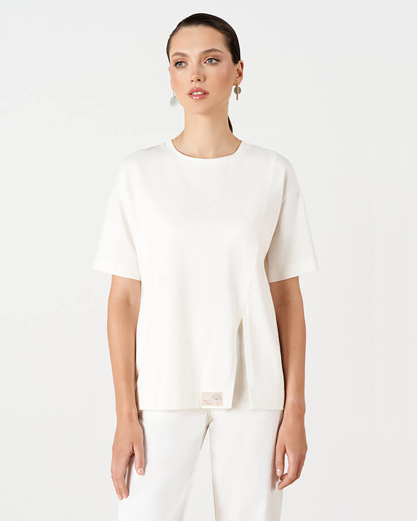 Футболка Nelva молочного цвета прямого кроя. Хлопковая модель с круглым вырезом, короткими рукавами, по низу выполнен деликатный разрез. Футболка - универсальная вещь на каждый день.