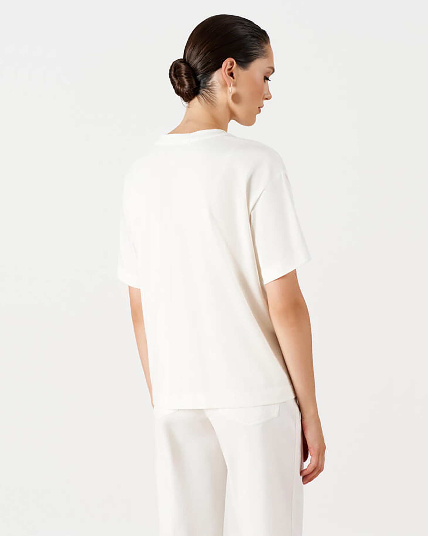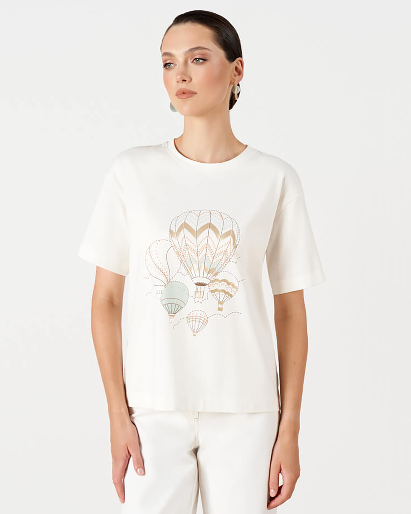 Футболка Nelva молочного цвета с принтом в виде воздушного шара. Хлопковая модель с круглым вырезом, короткими рукавами. Футболка - универсальная вещь на каждый день.