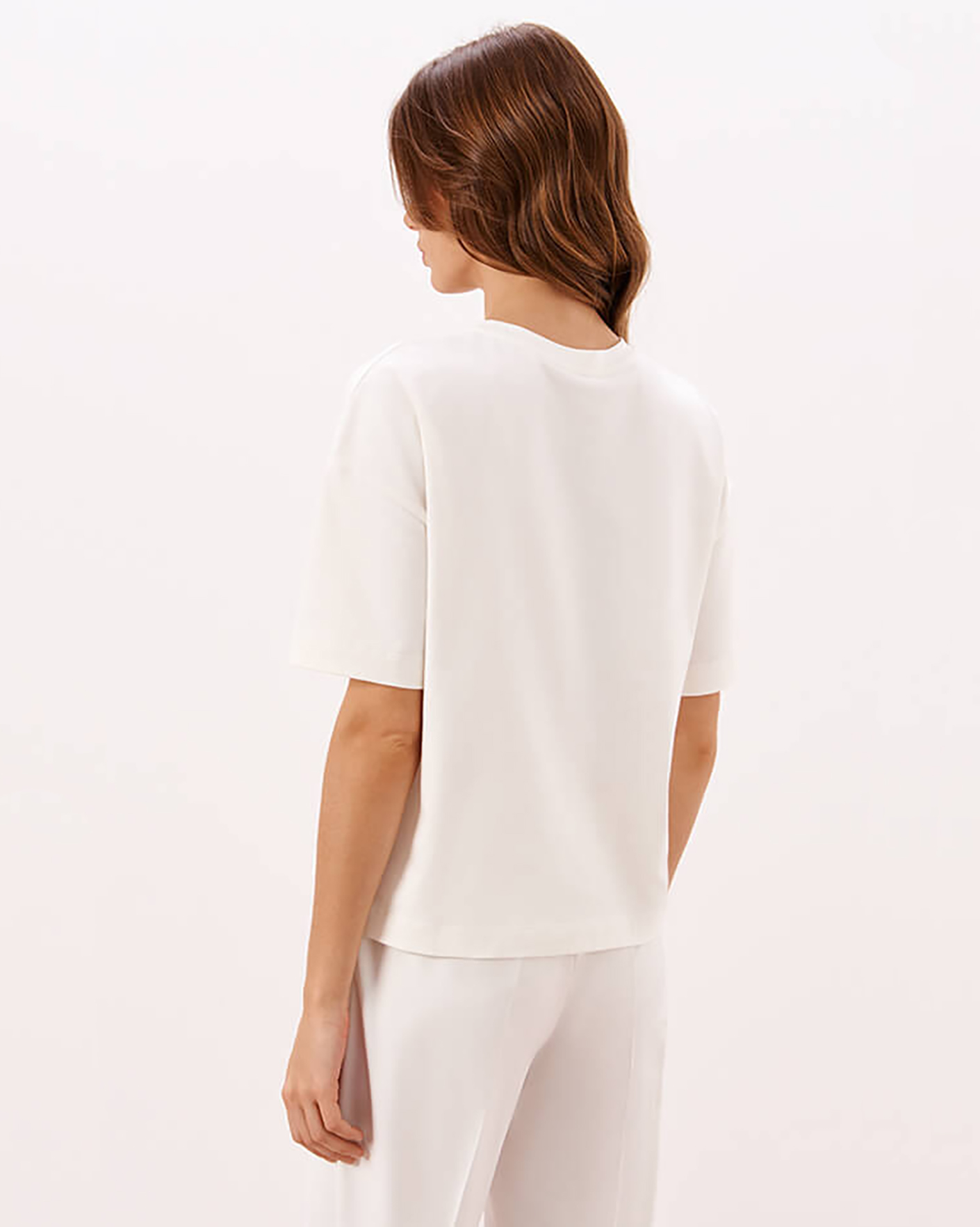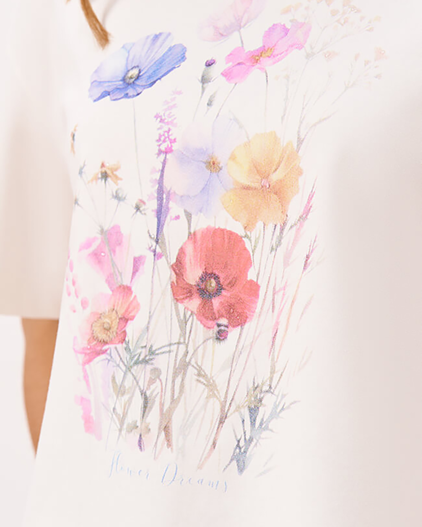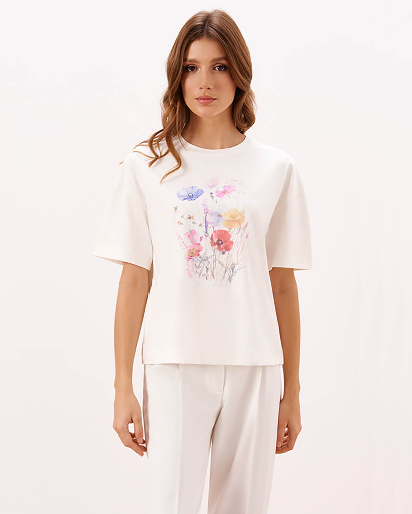 Футболка Nelva молочного цвета с цветочным принтом по центру. Хлопковая модель с круглым вырезом, короткими рукавами. Футболка - универсальная вещь на каждый день.