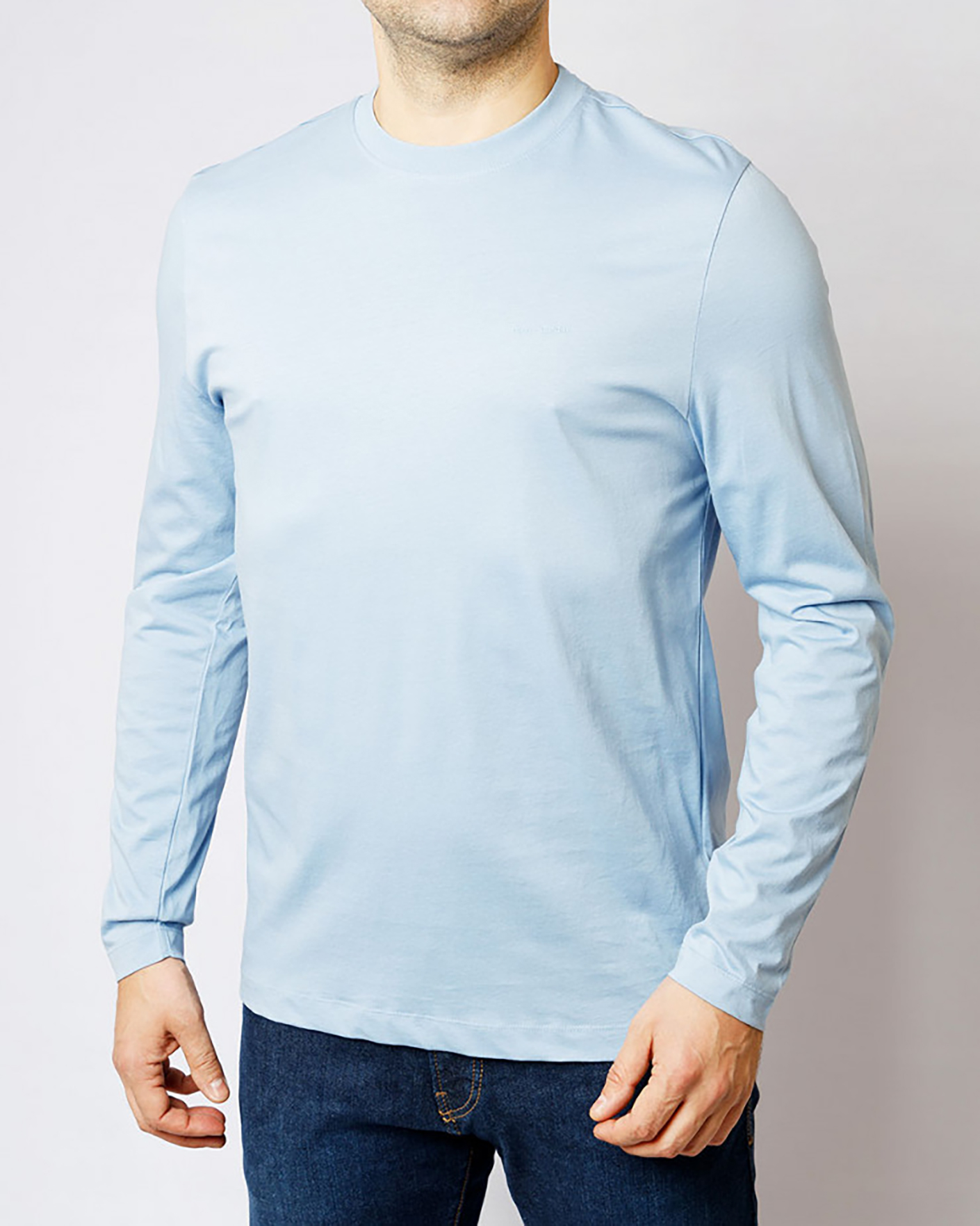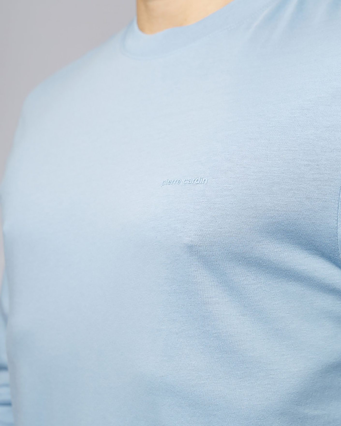 Футболка Pierre Cardin серо-голубого цвета с небольшим логотипом на груди в тон. Модель из 100% хлопка, круглый вырез, длинные рукава. Футболку можно сочетать с любым гардеробом.