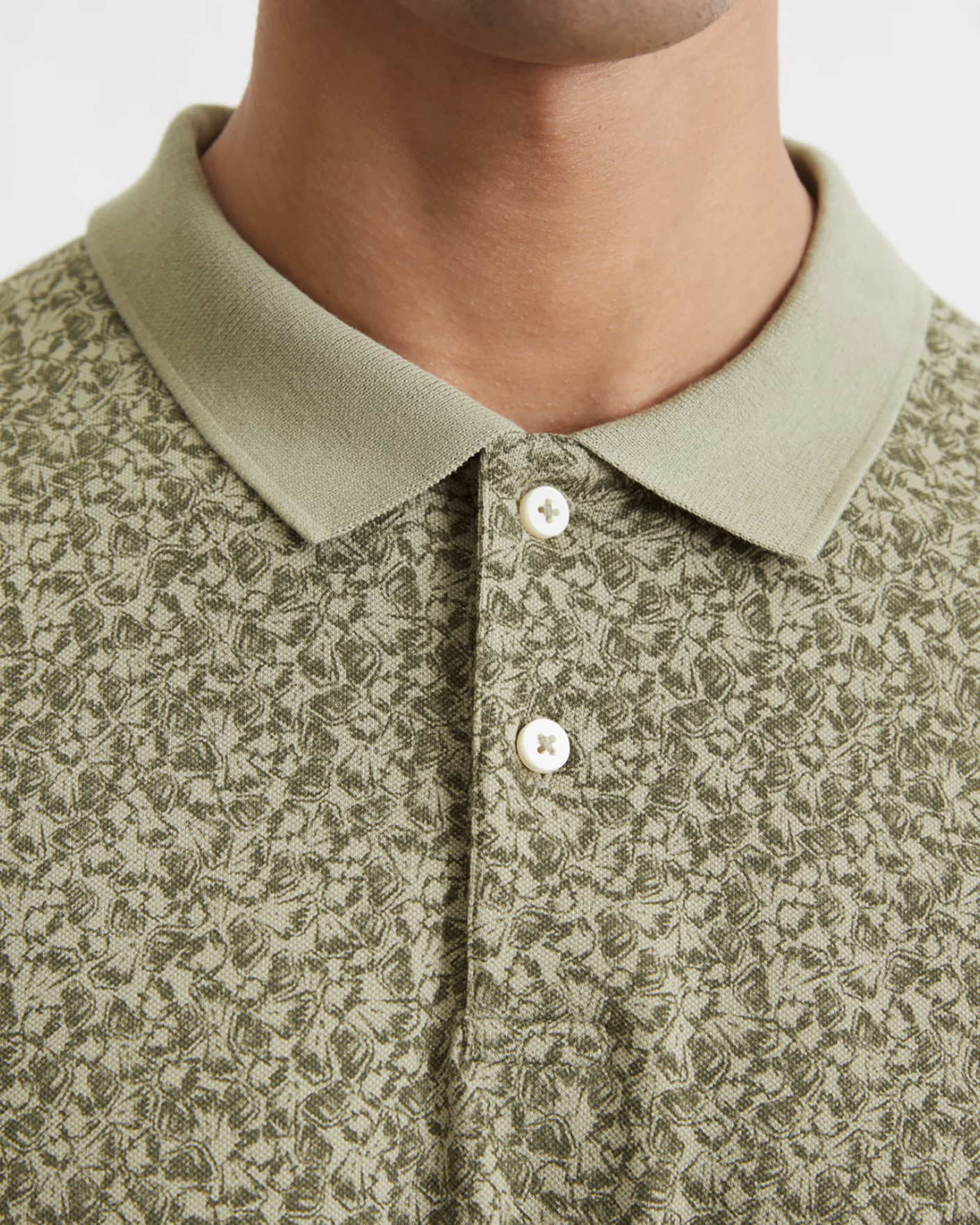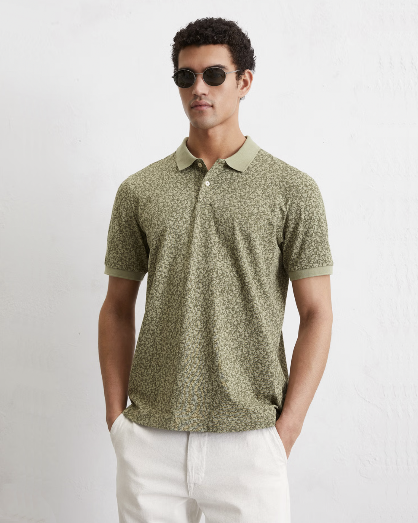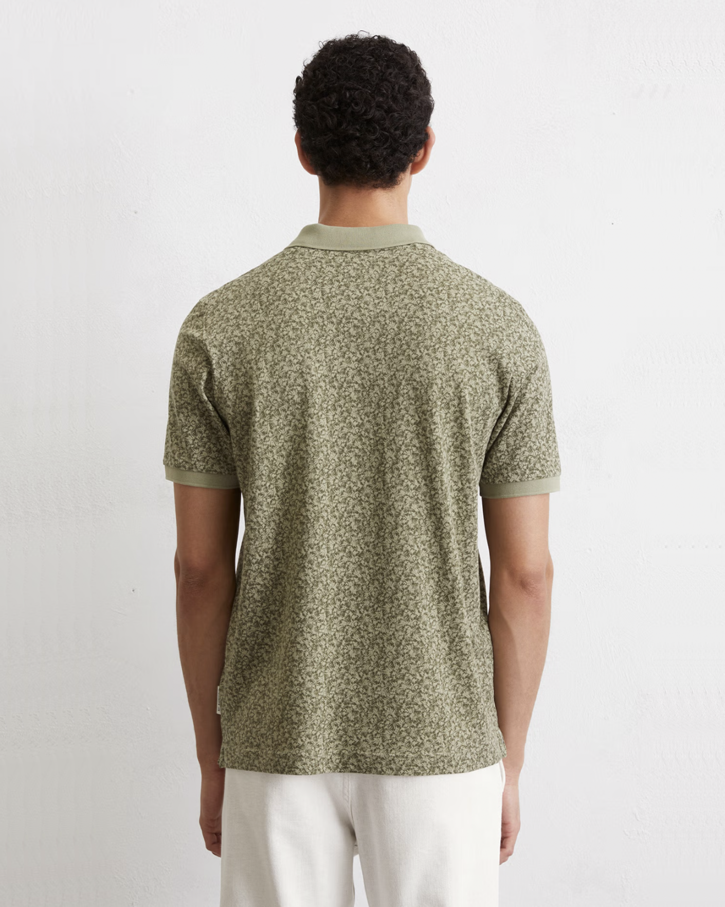 Футболка-поло Marc O'Polo цвета хаки в мелкий цветочный и строчный рисунок. Хлопковая модель с отложным воротником с планкой на две пуговицы, короткие рукава с однотонной манжетой на резинке. Футболка-поло отлично впишется в повседневный гардероб.
