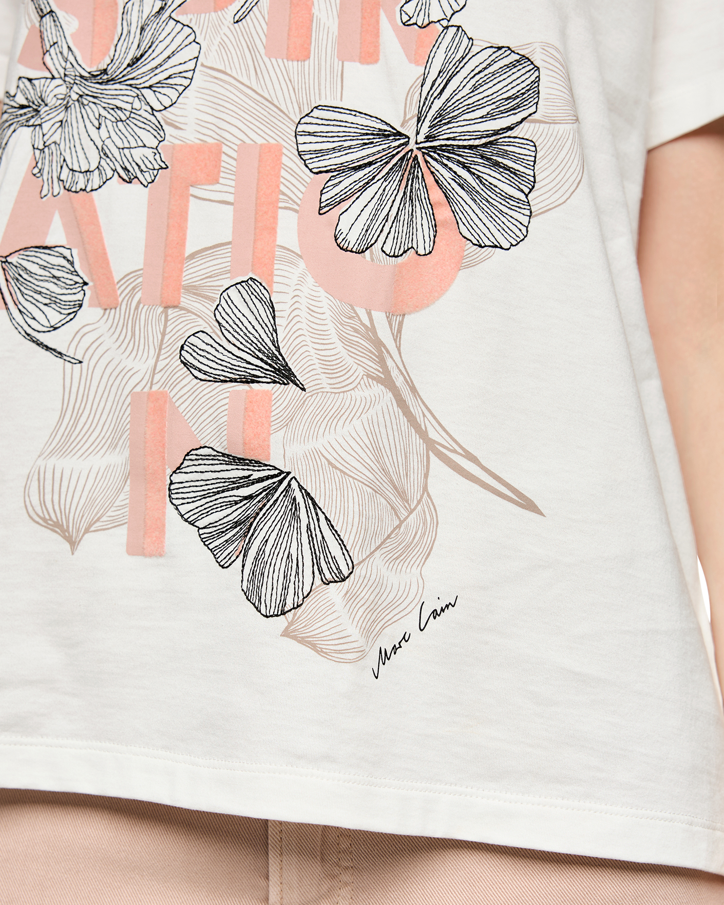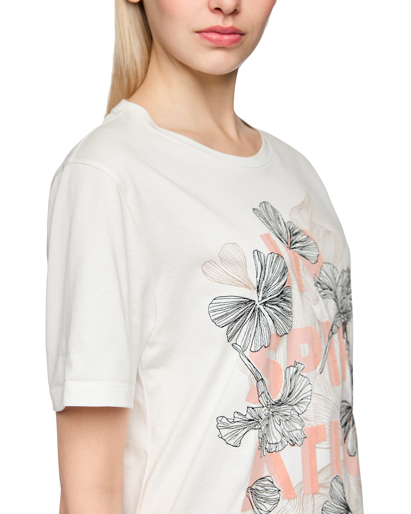 Полуприталенная футболка Marc Cain Collection белого цвета с цветочным принтом. Модель с круглым вырезом и короткими рукавами. Футболку можно сочетать с жакетом, кардиганом, юбкой и брюками.