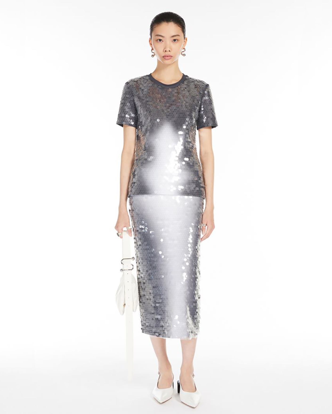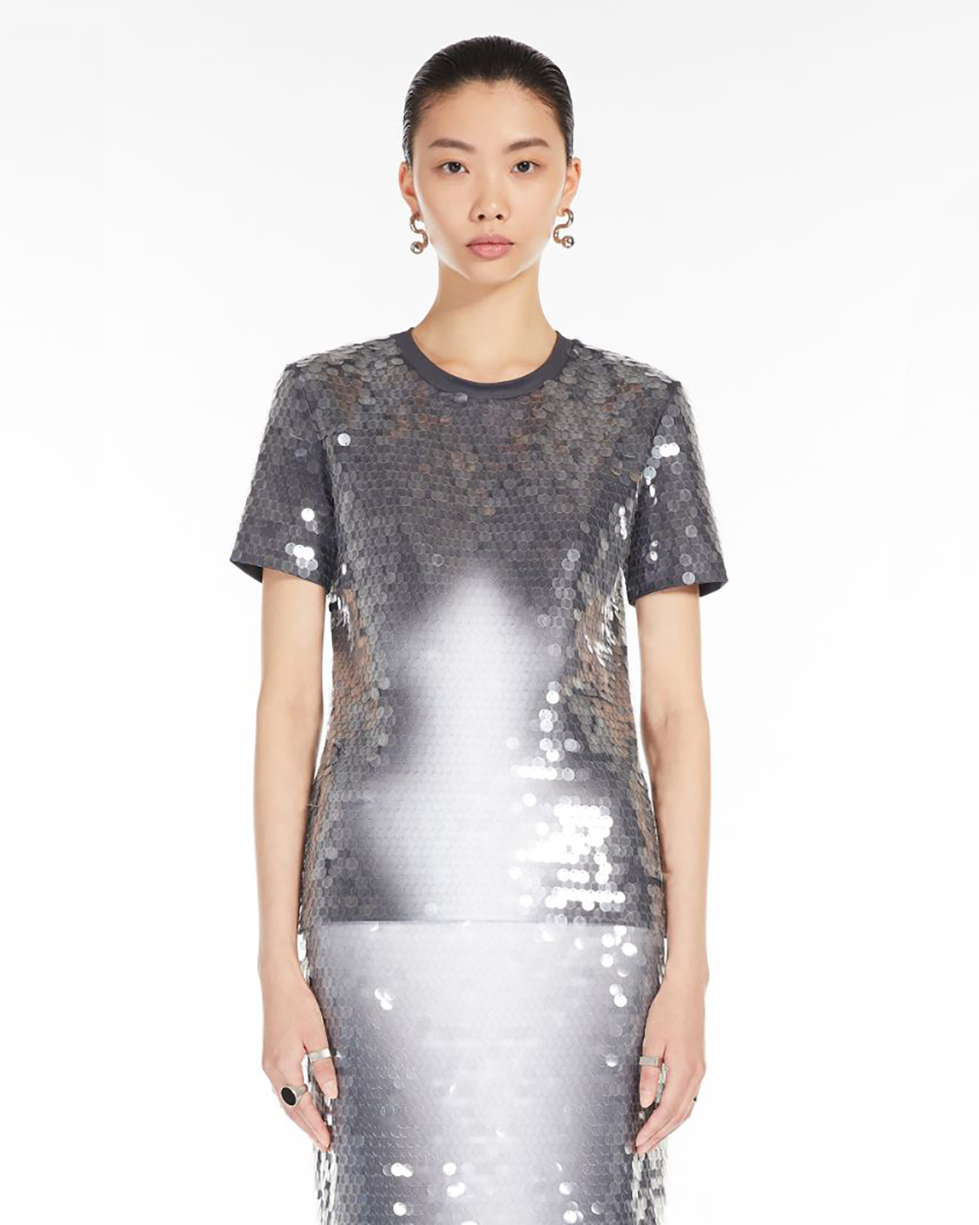 Стильная футболка Sportmax серого цвета с крупными пайетками. Модель с круглым вырезом и короткими рукавами. Футболка станет фаворитом вашего гардероба.