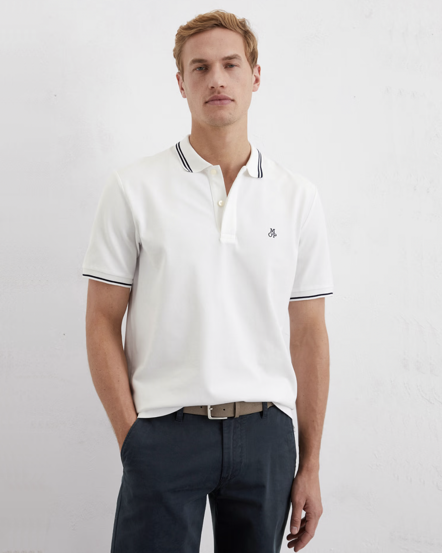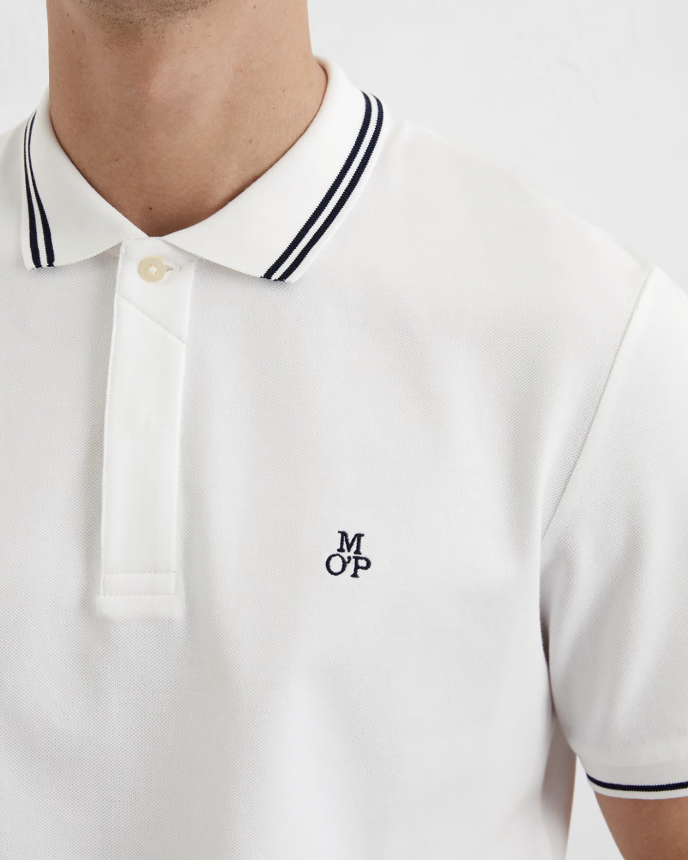 Футболка-поло Marc O'Polo белого цвета с небольшой вышивкой логотипа на груди. Модель из 100% хлопка, отложной воротник с контрастными полосами, планка на скрытые пуговицы. Короткий рукав с манжетами в контрастную полосу. Футболка-поло - идеальная альтернатива рубашке.