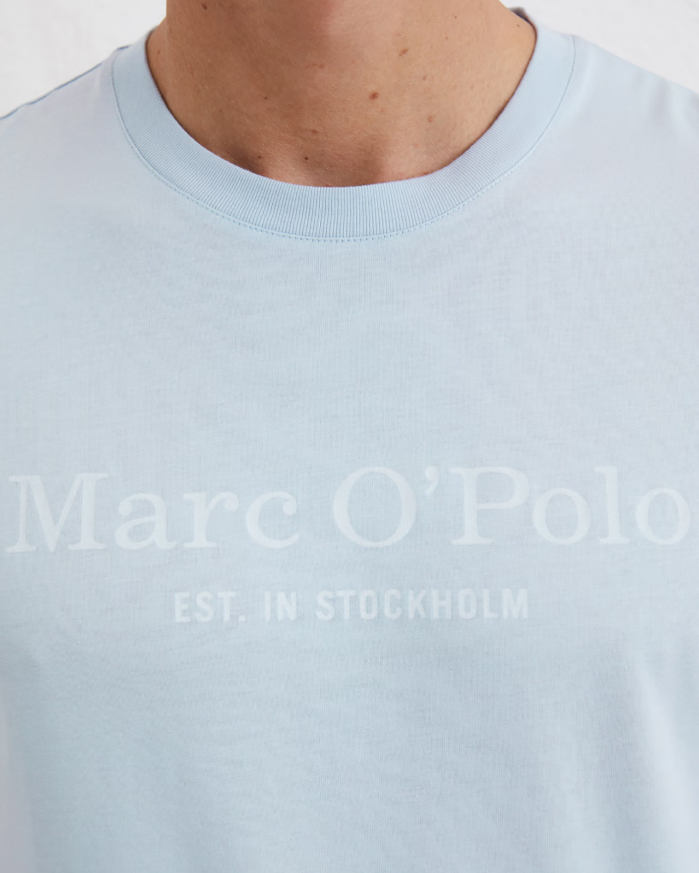 Футболка Marc O'Polo светло-голубого цвета с принтом в виде логотипа по центру. Модель прямого кроя, круглый вырез, короткий рукав, 100% хлопок. Футболка - универсальная вещь на каждый день.
