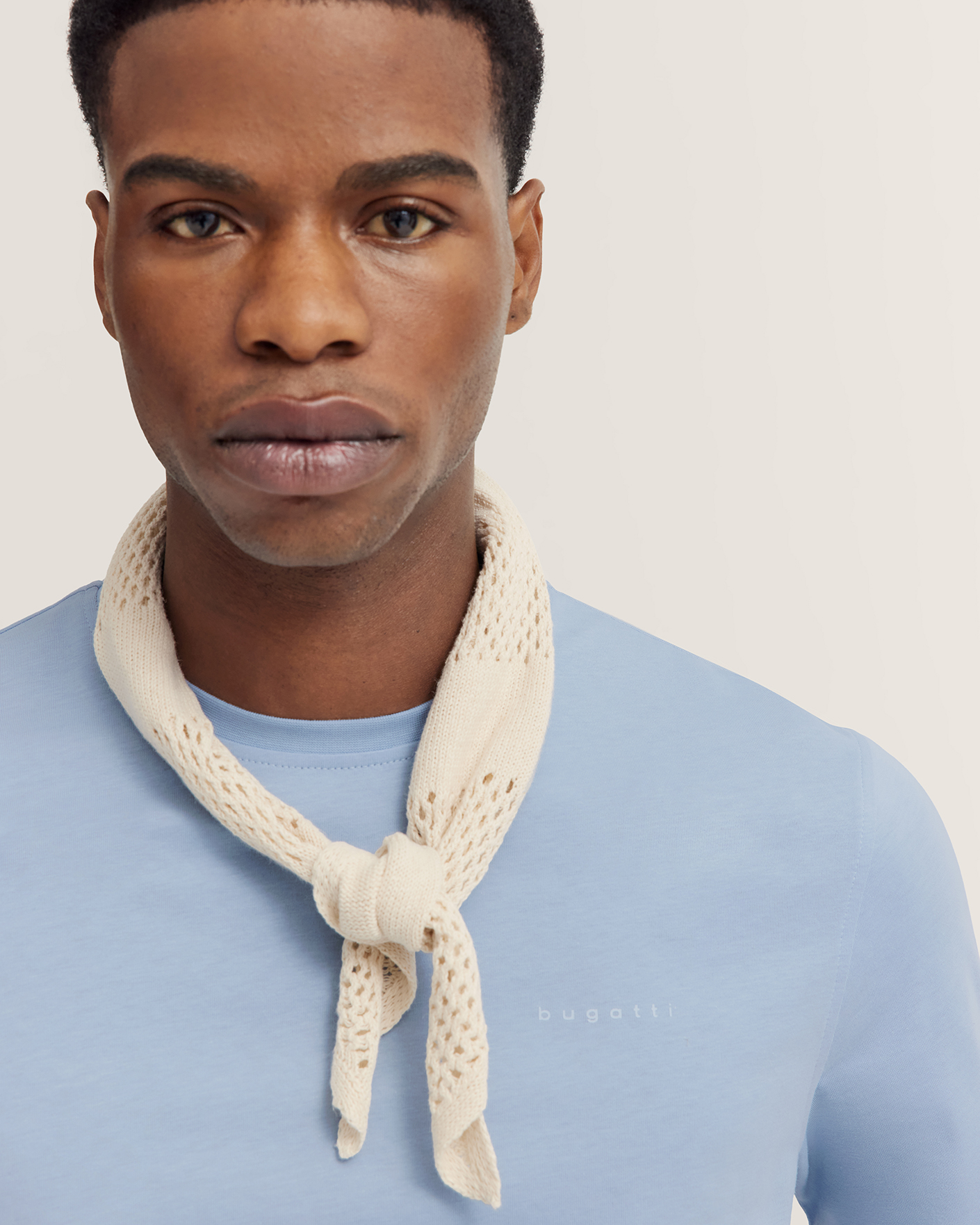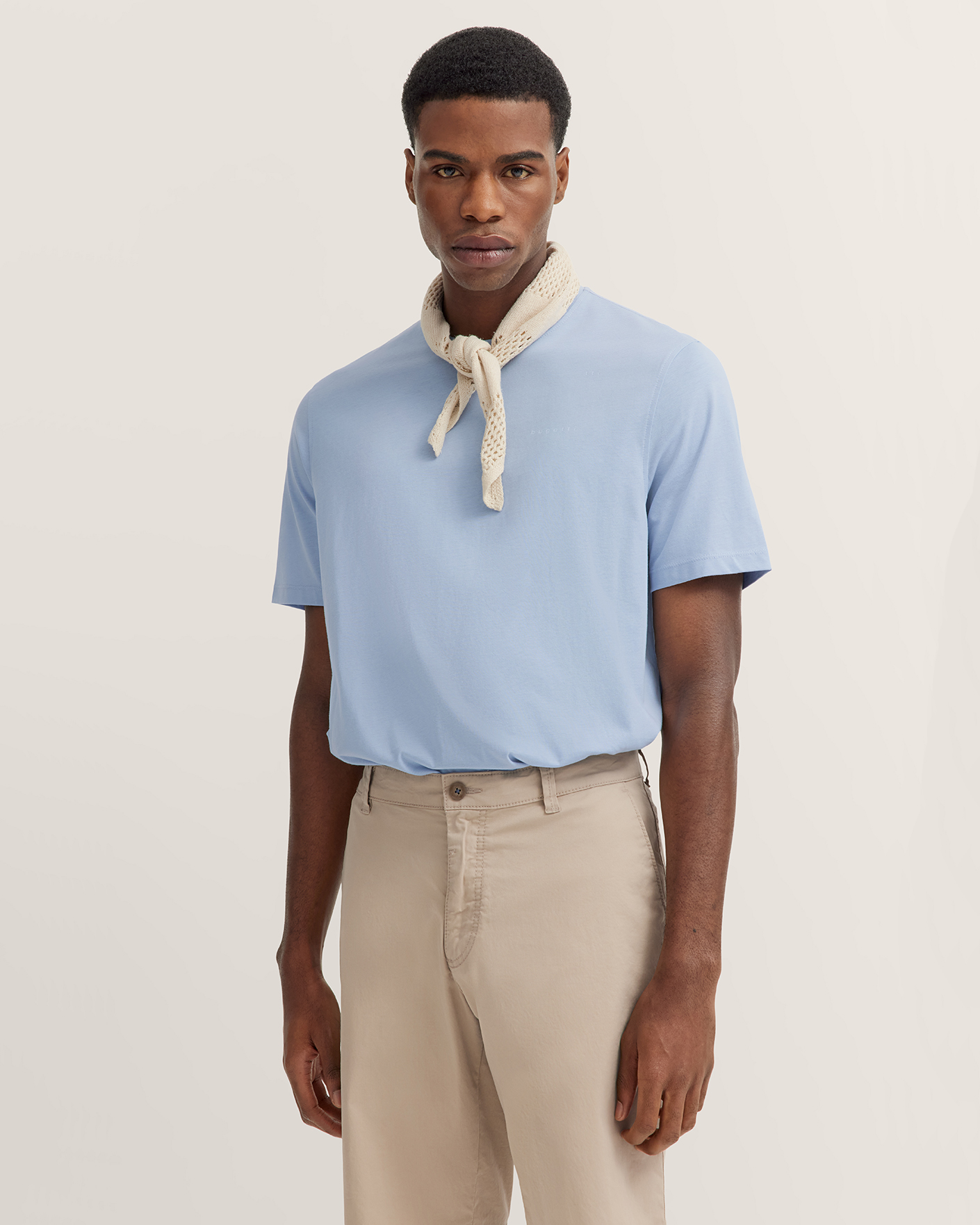 Футболка Bugatti голубого цвета с нагрудным логотипом в тон. Модель из 100% хлопка, прямой крой, круглый вырез, короткий рукав. Футболка - универсальная вещь на каждый день.