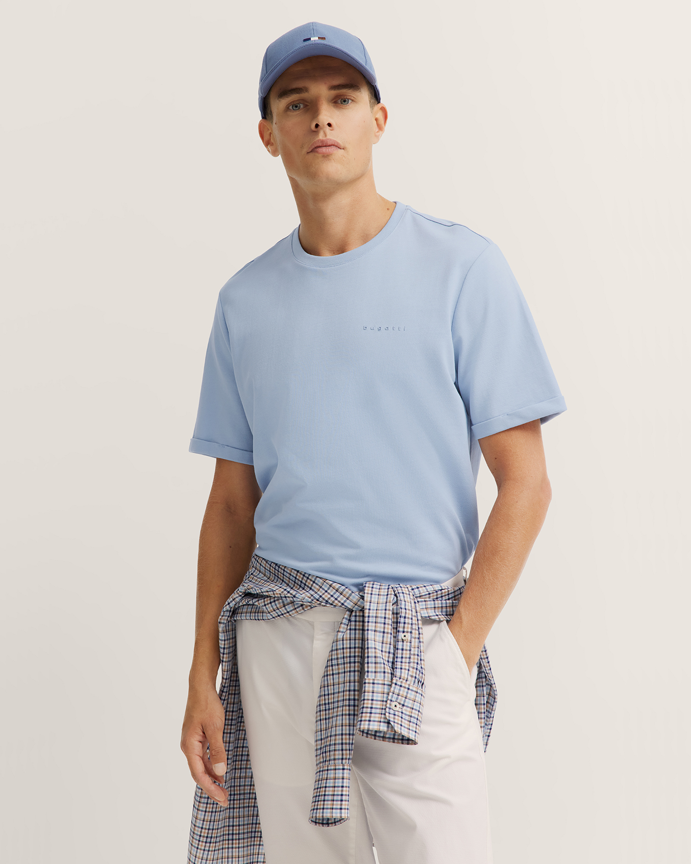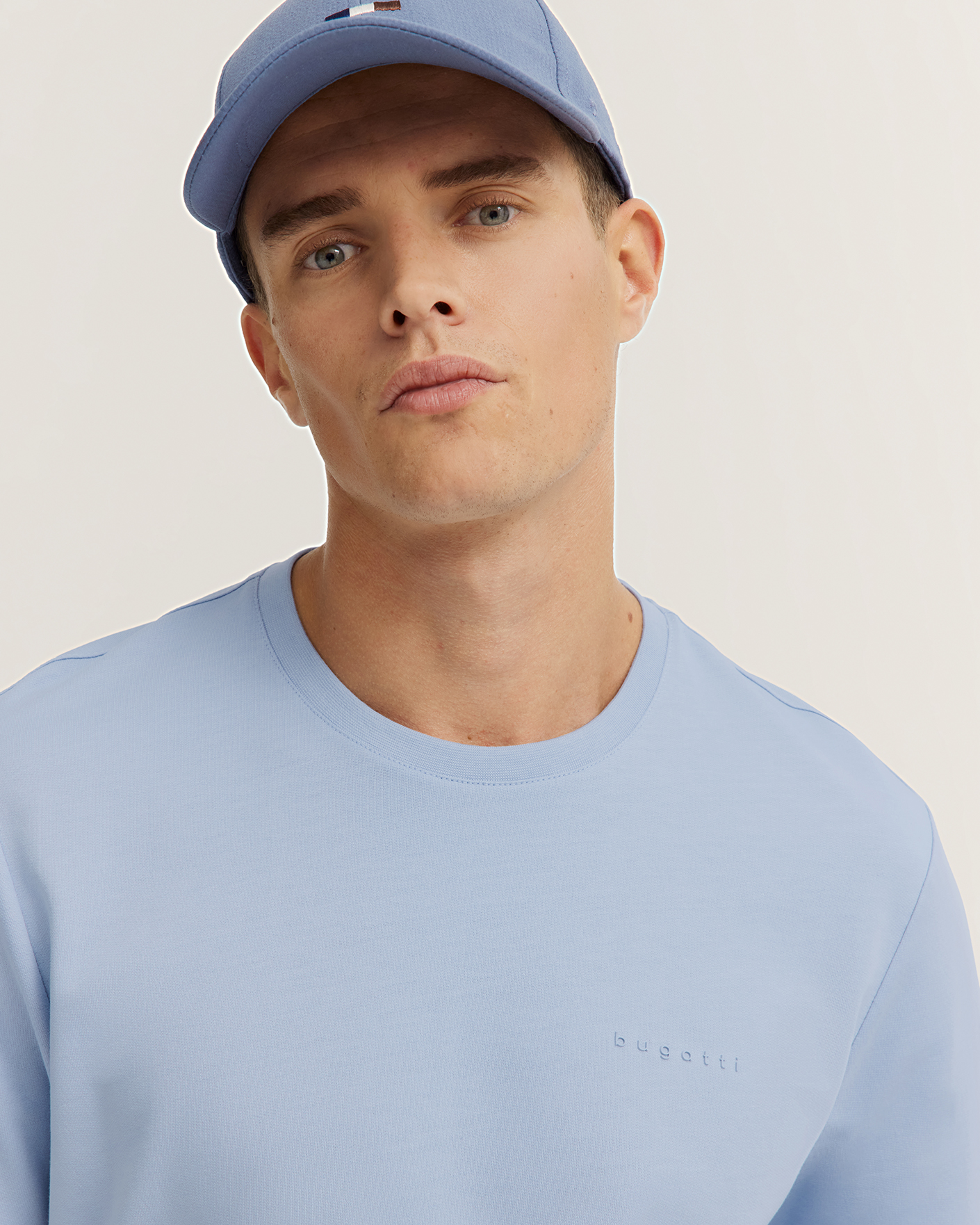 Футболка Bugatti голубого цвета с нагрудным логотипом в тон. Модель из 100% хлопка, прямой крой, круглый вырез, короткий рукав с отворотом. Футболка - универсальная вещь на каждый день.