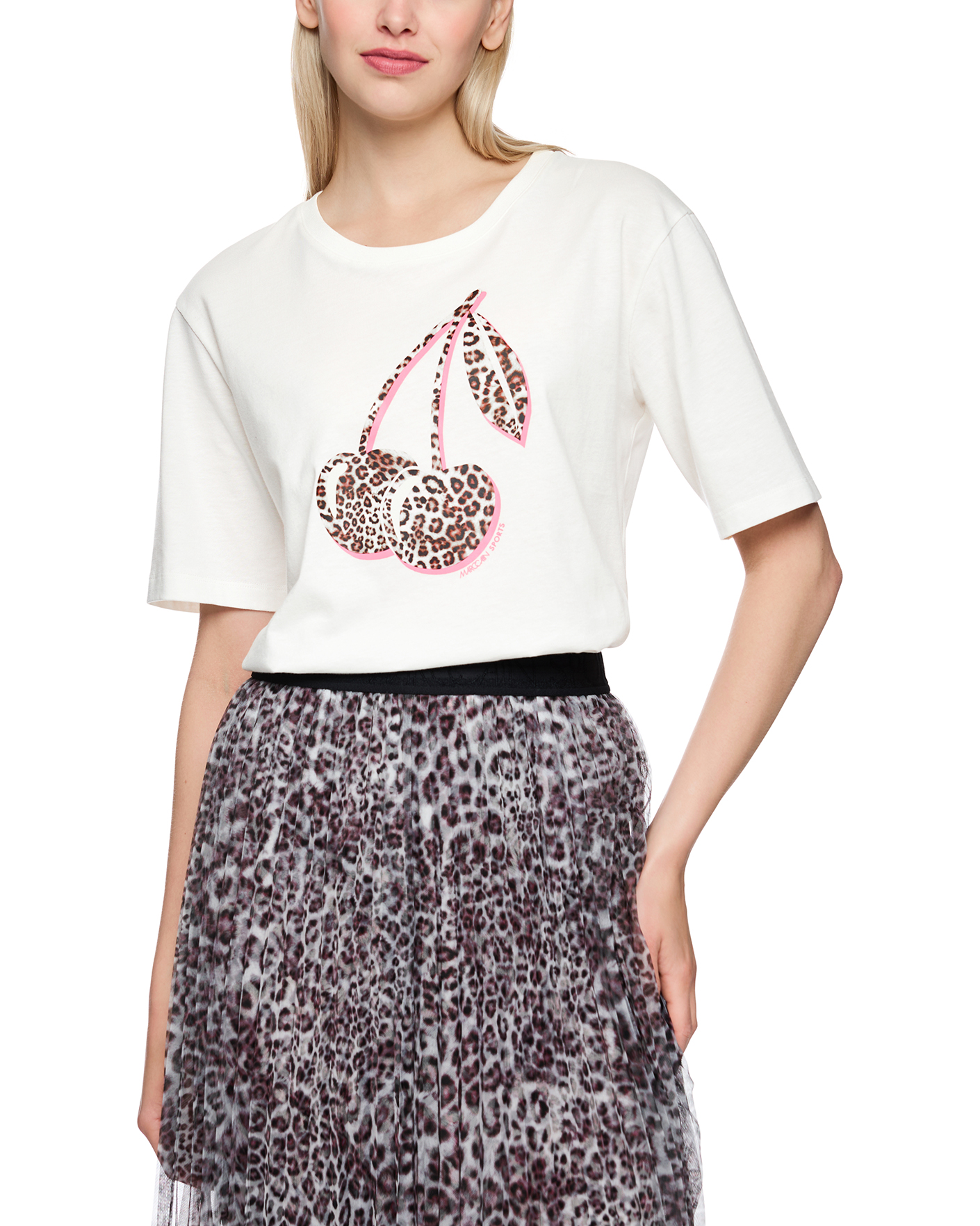 Футболка Marc Cain Sport белого цвета с принтом вишни. Модель из 100% хлопка, круглый вырез, короткие рукава. Футболка - универсальная вещь на каждый день.