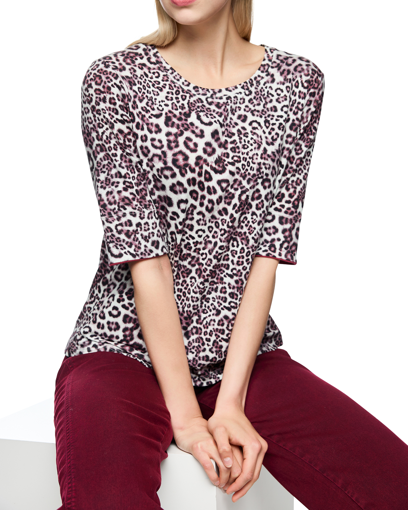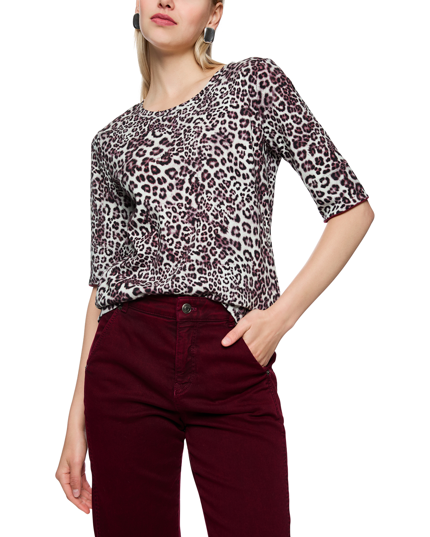 Футболка Marc Cain Sport бело-коричневого цвета в леопардовый рисунок. Хлопковая модель, круглый вырез, короткие рукава. Футболка - универсальная вещь на каждый день.
