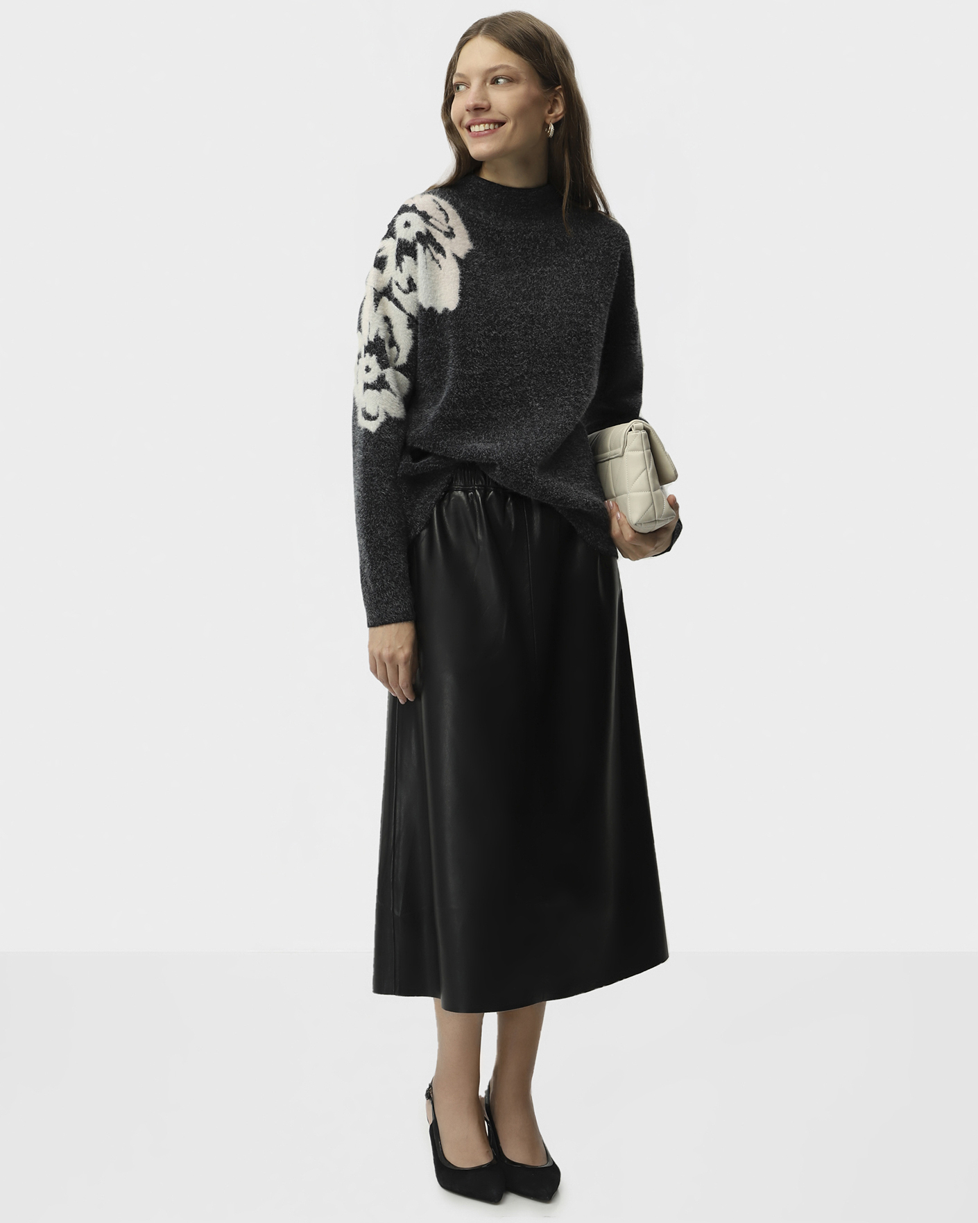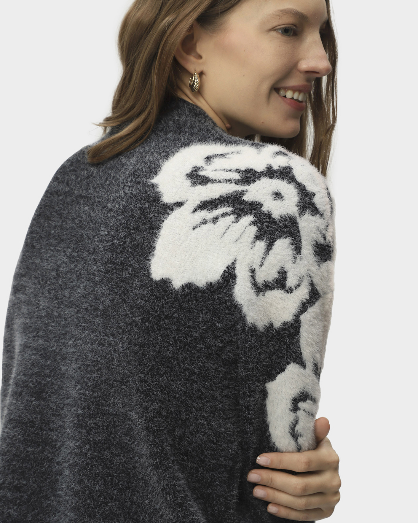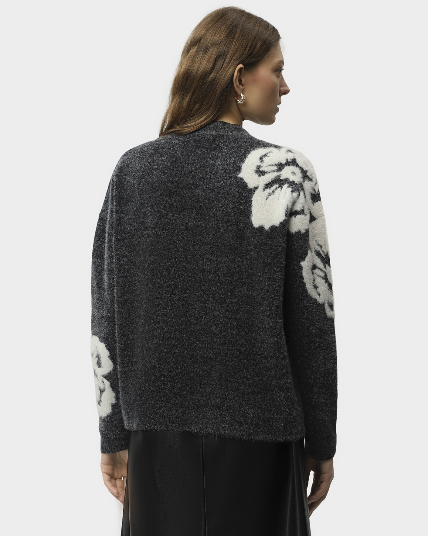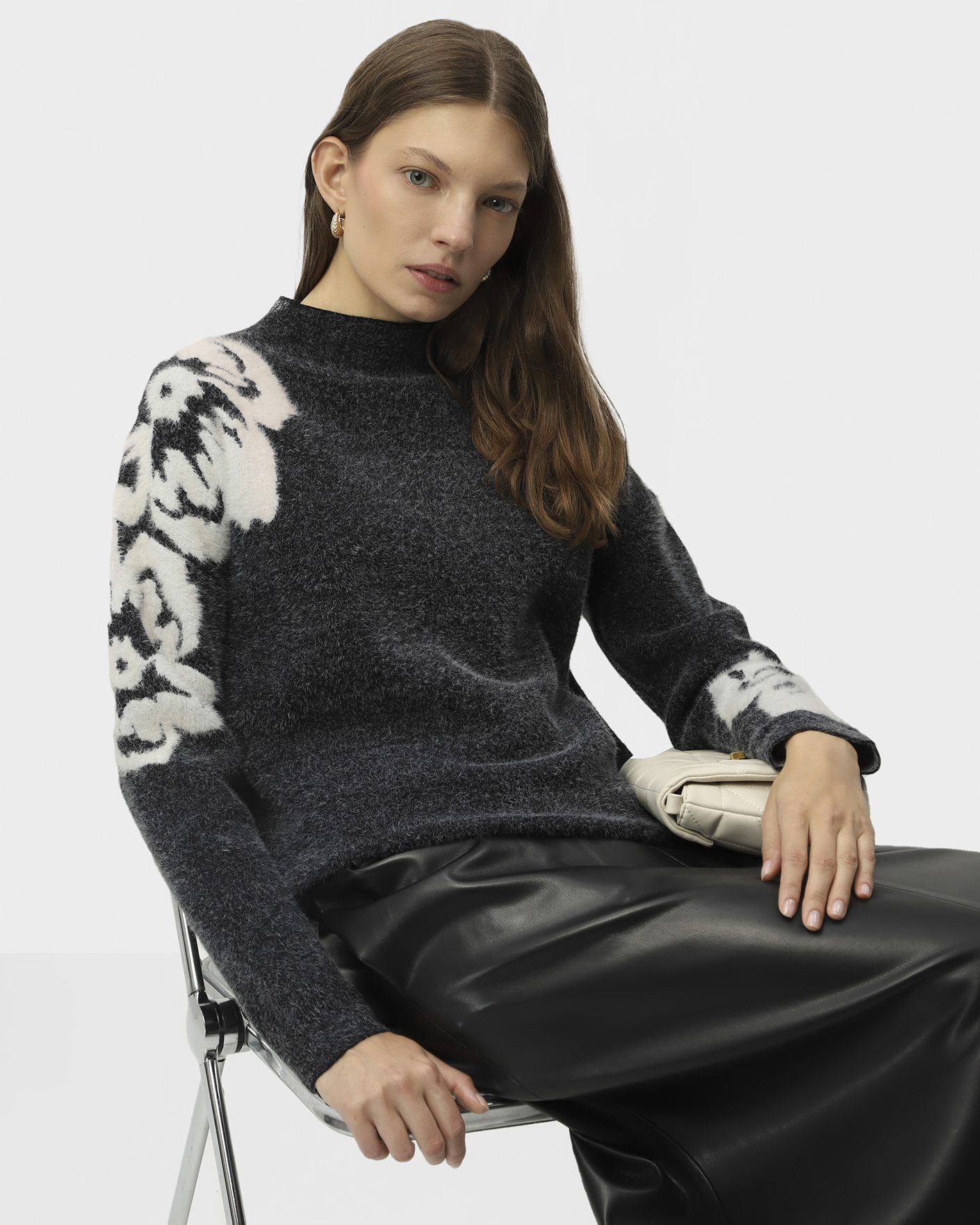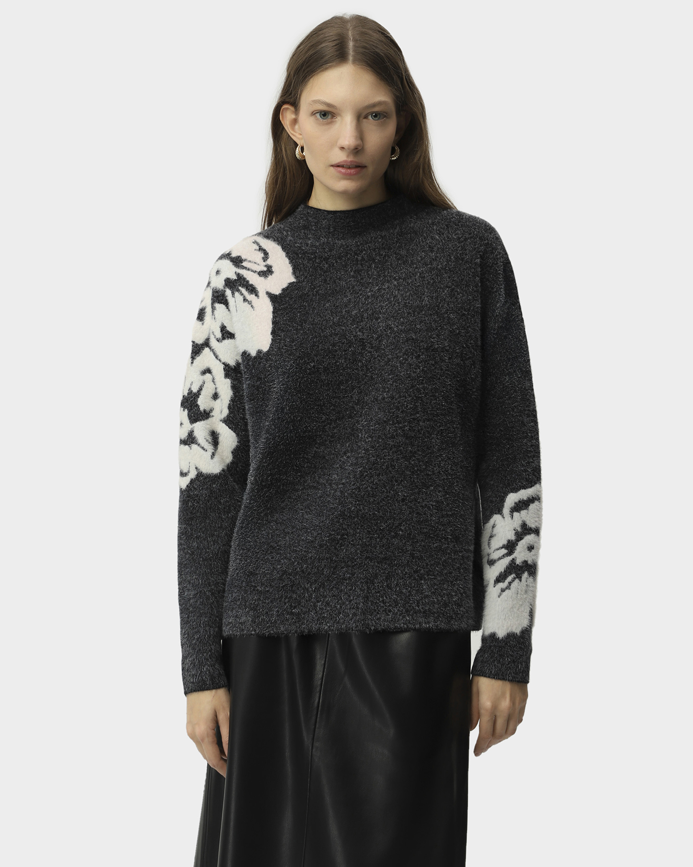Мягкий джемпер UNQ серо-черного цвета с текстурным цветком на плече и рукаве. Модель с небольшим воротником-стойка, спущенная линия плеча с рукавами. Джемпер станет фаворитом вашего гардероба.