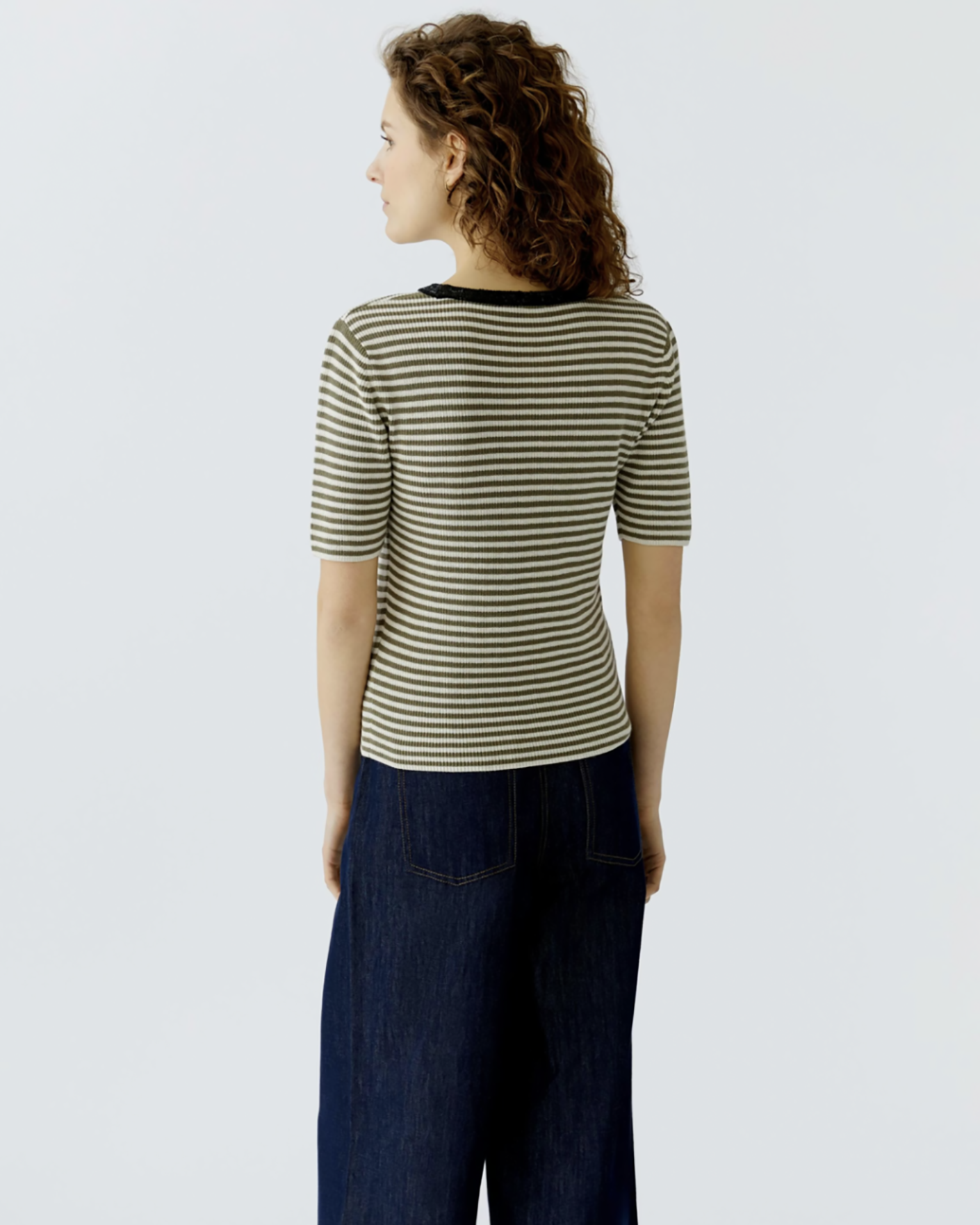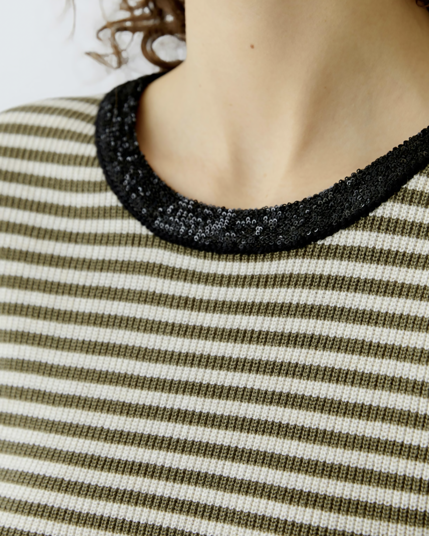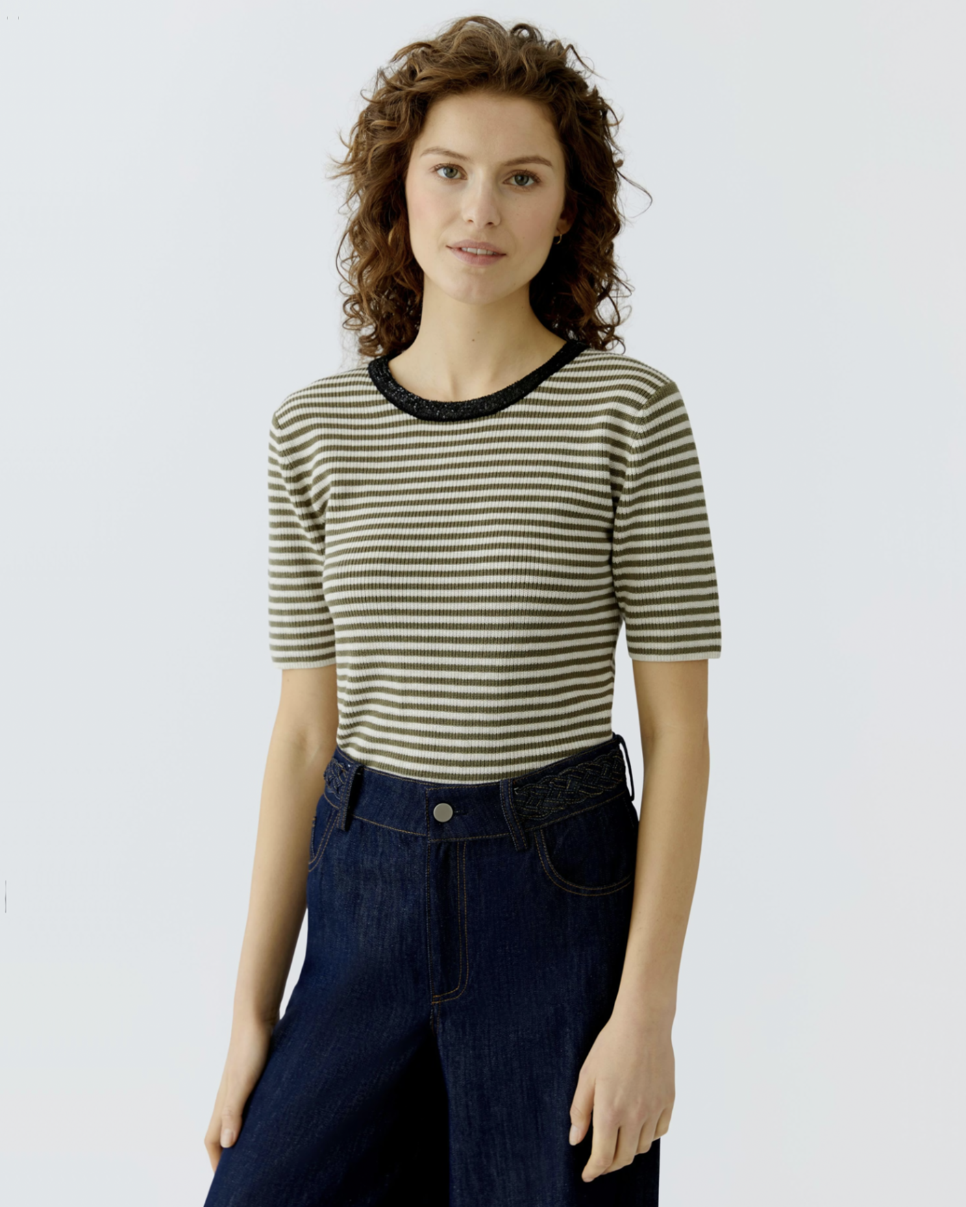 Джемпер OUI молочно-зеленого цвета в рубчик и горизонтальную полосу. Модель из 100% хлопка с круглым вырезом, декорированный пайетками, короткие рукава. Джемпер отлично впишется в ваш гардероб.