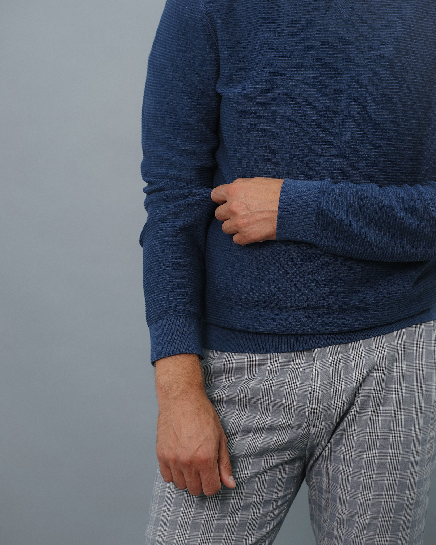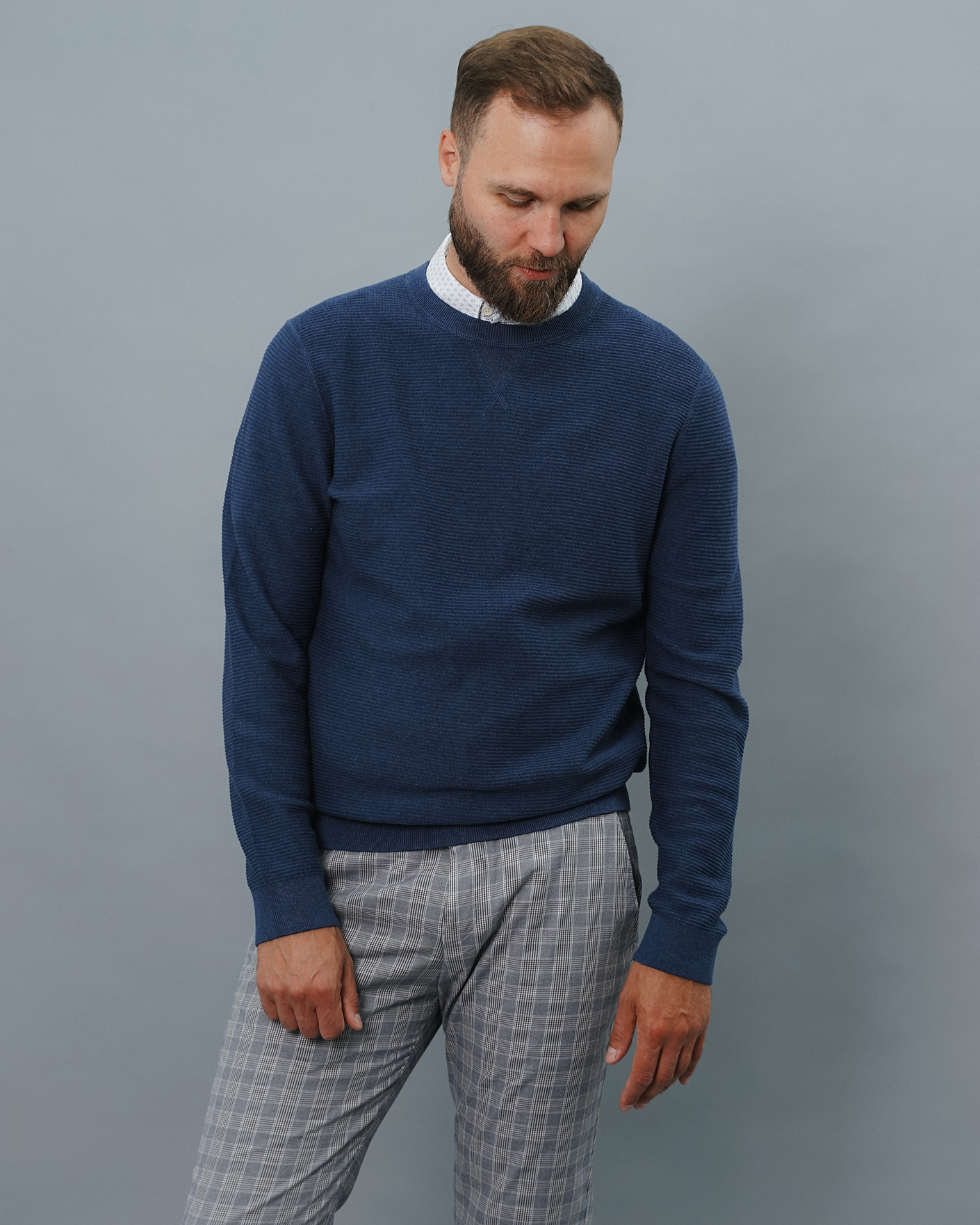 Джемпер Olymp темно-синего цвета в узкую горизонтальную вязку. Модель из 100% хлопка с круглым вырезом и длинными рукавами. Джемпер - универсальная вещь на каждый день.
