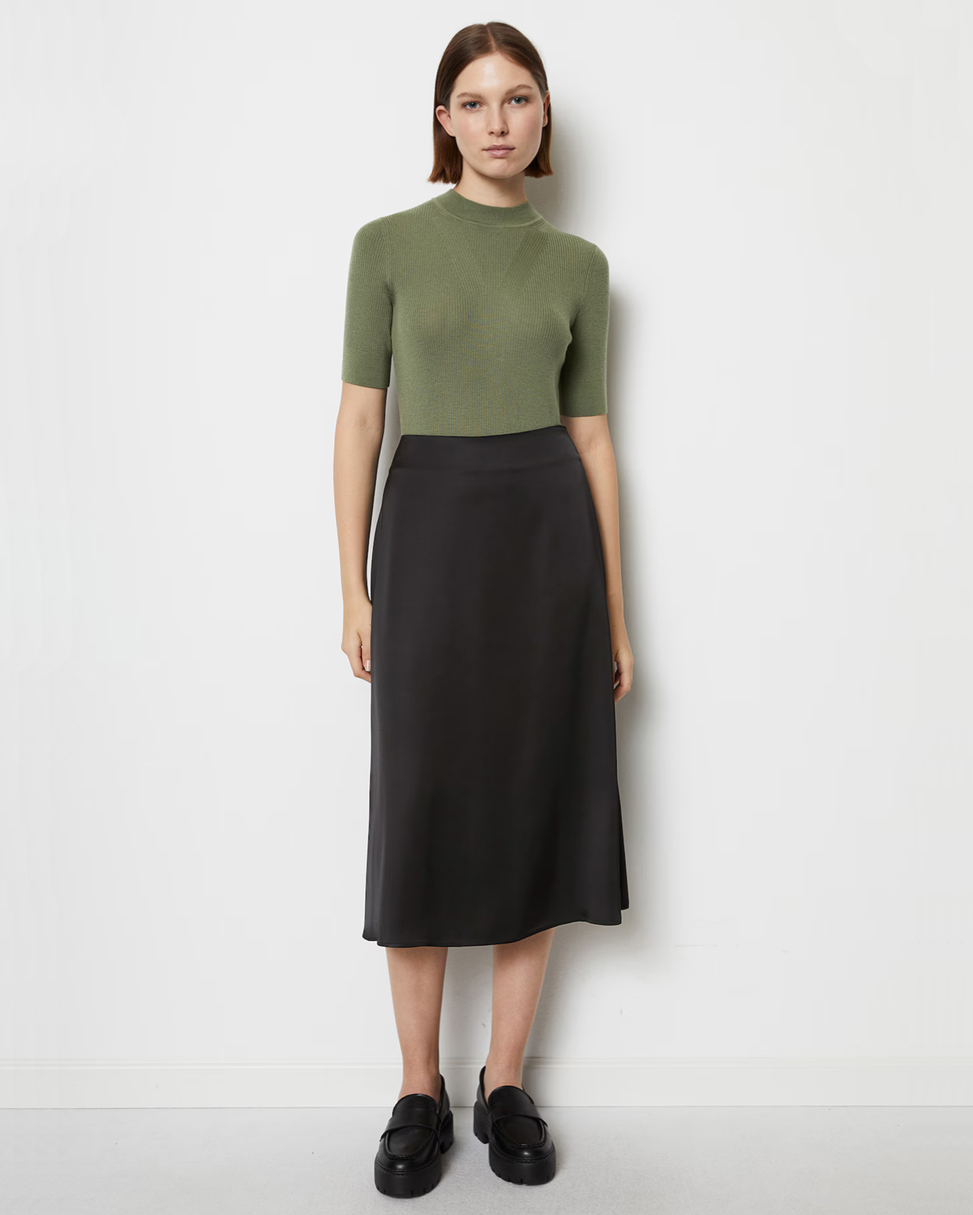 Приталенный джемпер Marc O'Polo цвета хаки в мелкий рубчик. Модель из 100% шерсти с небольшим воротником-стойка и короткими рукавами. Джемпер - универсальная вещь на каждый день.