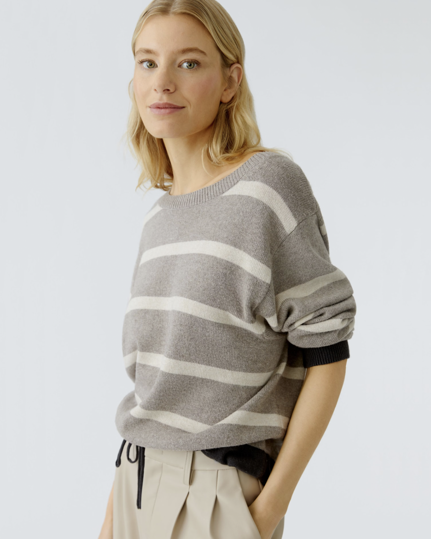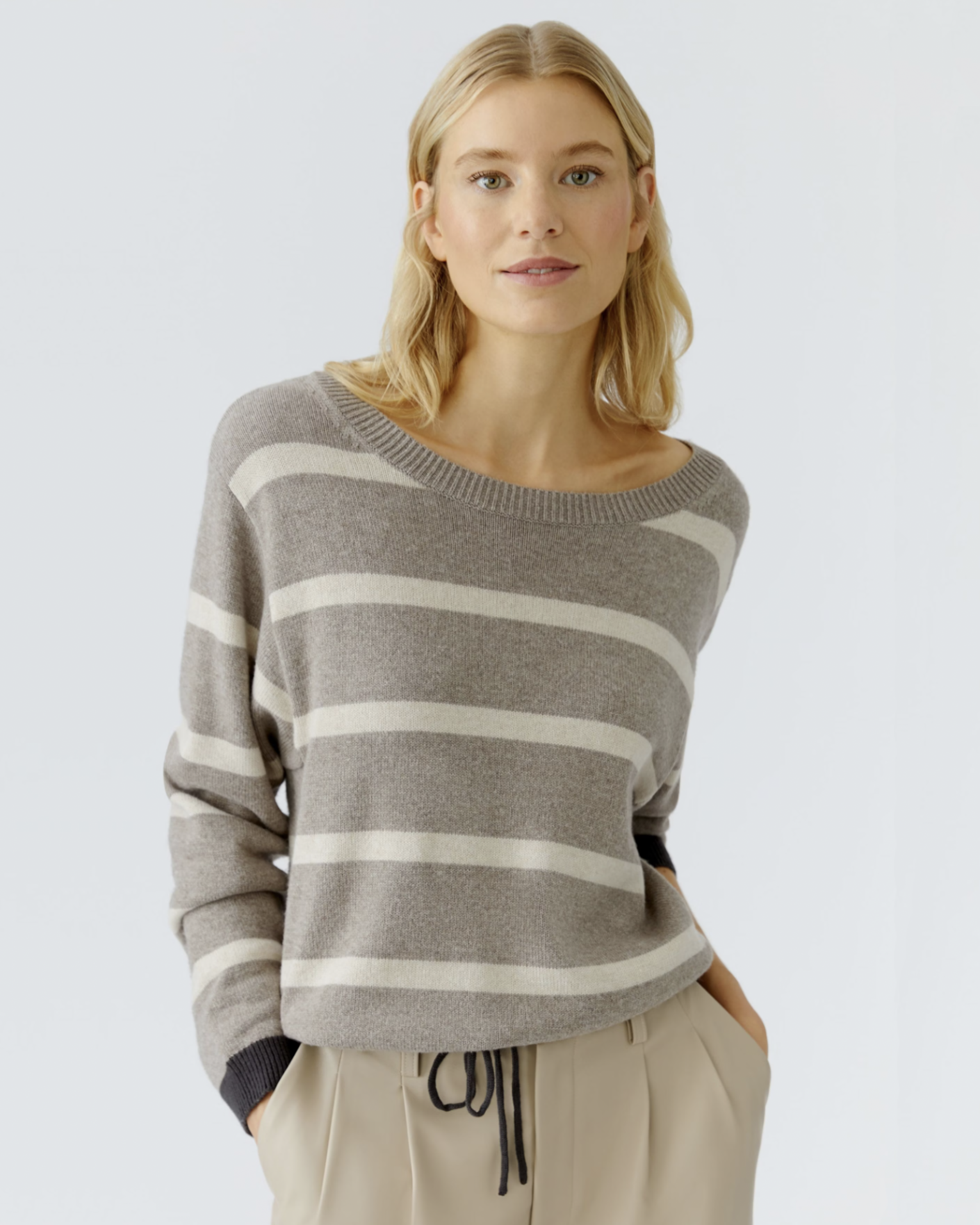 Свободный джемпер OUI бежево-коричневого цвета в горизонтальную полосу. Модель с круглым вырезом, длинные рукава, низ на вставной регулируемой кулиске. Джемпер отлично впишется в повседневный гардероб.