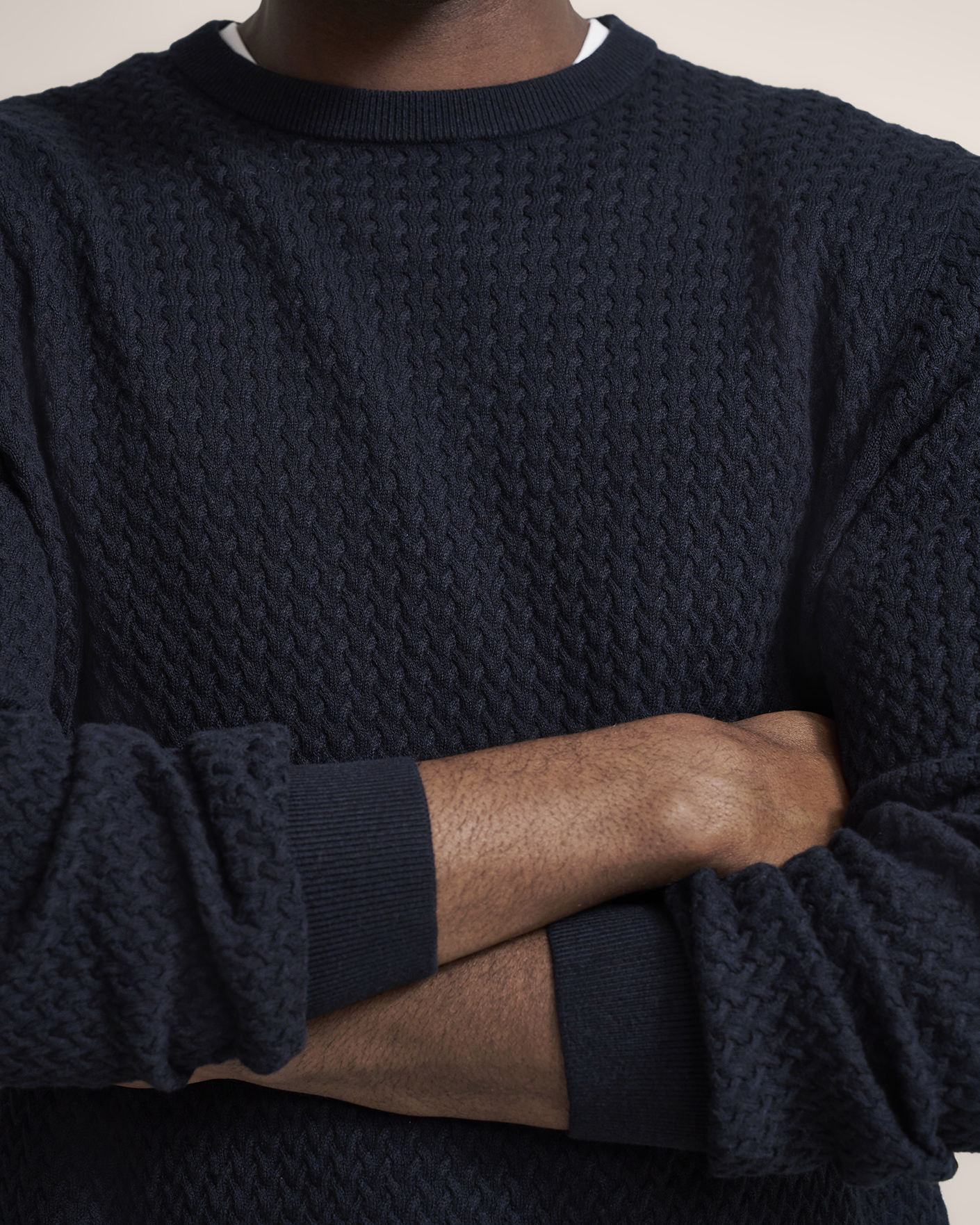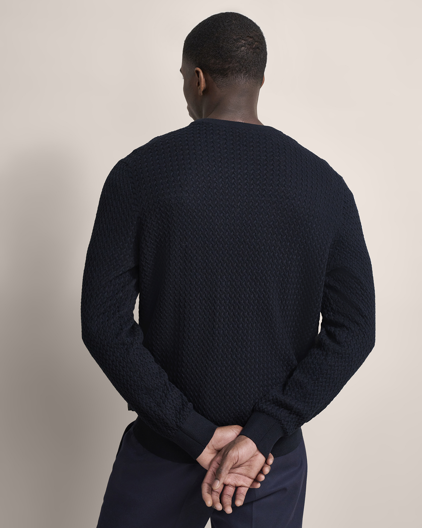Джемпер Bugatti темно-синего цвета в вертикальный текстурный рисунок. Модель выполнена из высококачественного хлопка с добавлением кашемира. Круглый вырез и длинные рукава. Джемпер - база на каждый день.