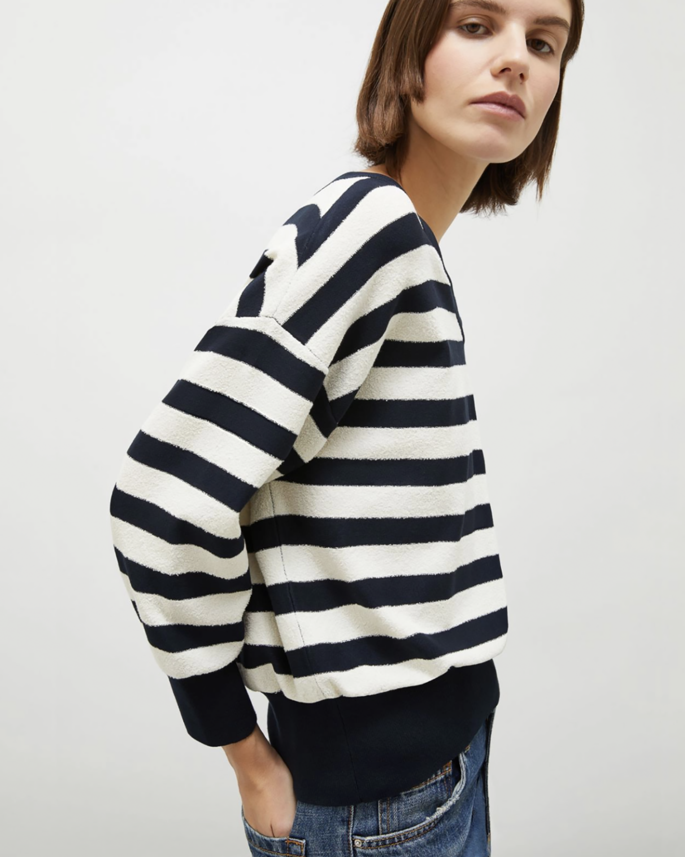 Свободный пуловер Marella бело-синего цвета в горизонтальную полосу из комбинированных текстур. Модель с V-образным вырезом, спущенная линия плеча, манжеты и низ на тонкой резинке. Пуловер отлично впишется в повседневный гардероб.