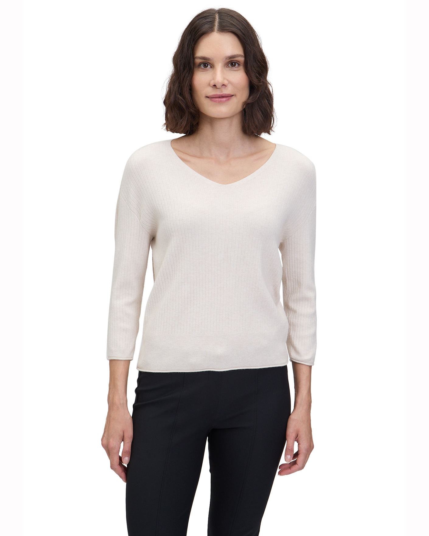 Полуприталенный пуловер Betty Barclay молочного цвета в вертикальную строчную полосу. Модель с V-образным вырезом и укороченными рукавами. Пуловер - универсальная вещь на каждый день.