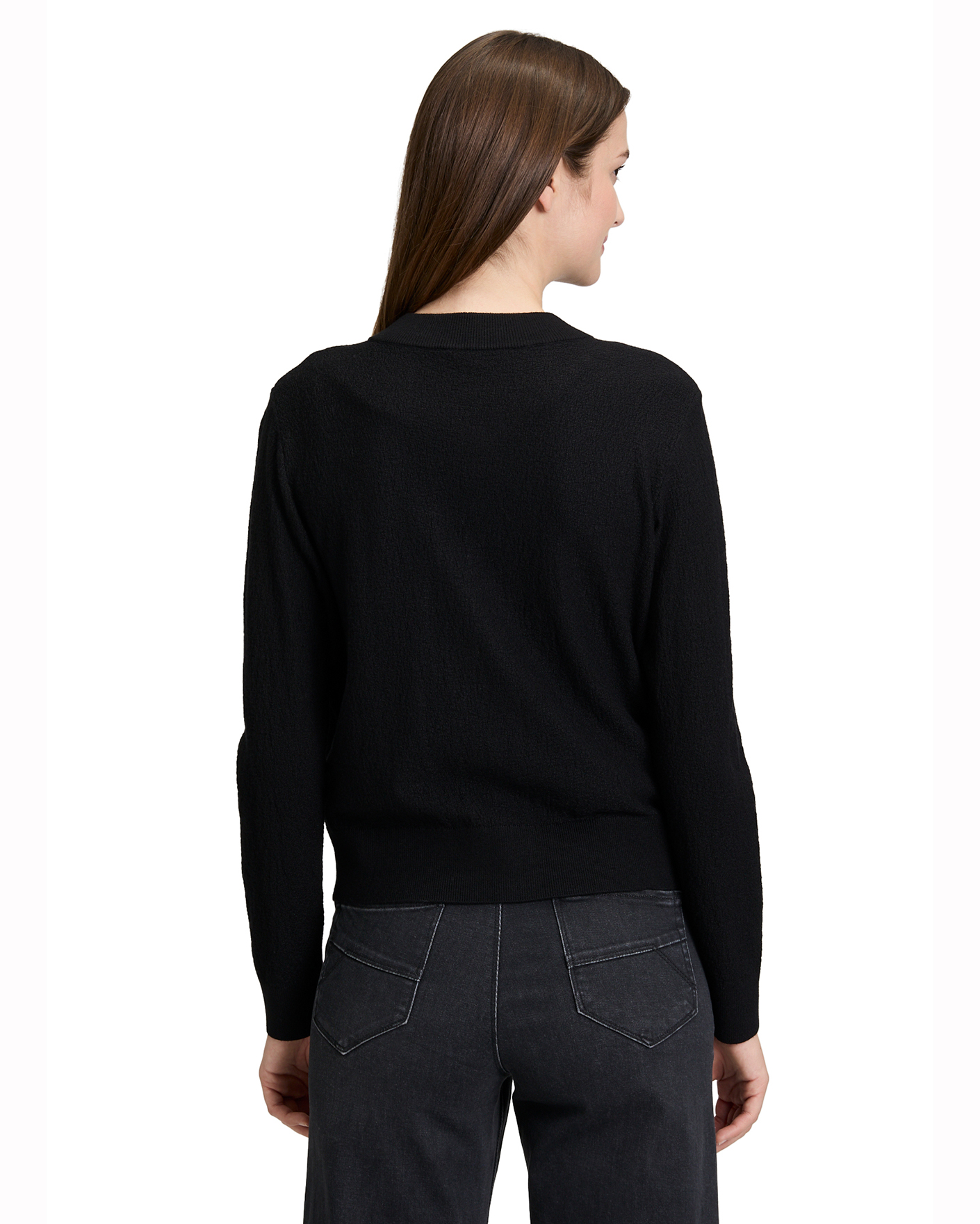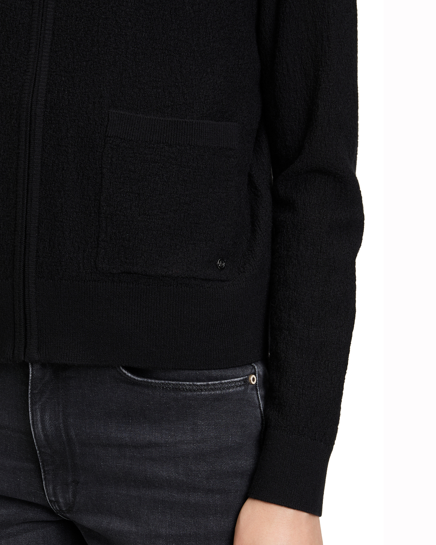 Базовый кардиган-бомбер Betty&Co черного цвета. Модель с круглым вырезом, застежка на молнию, имеются накладные карманы по бокам. Кардиган отлично впишется в ваш гардероб.