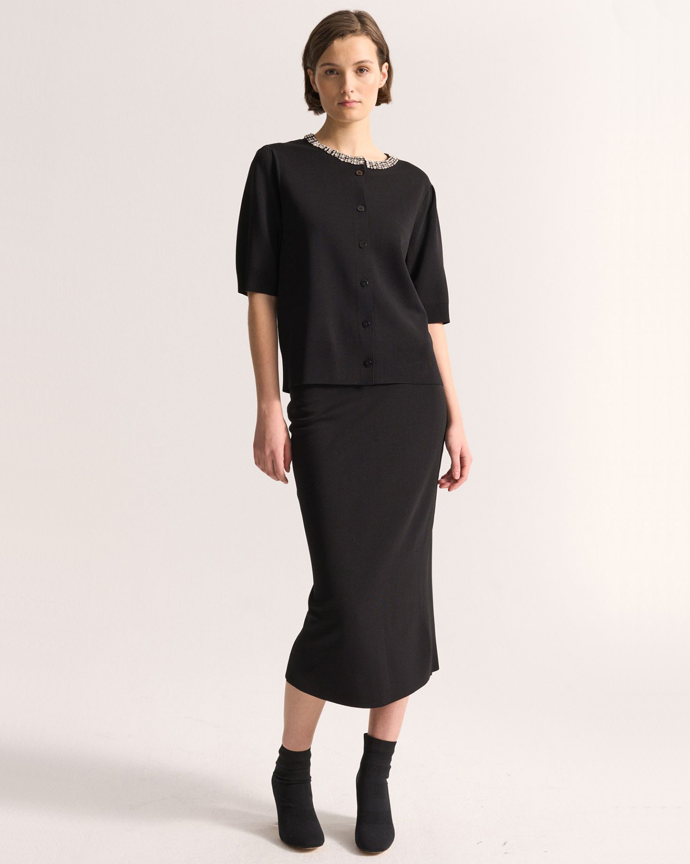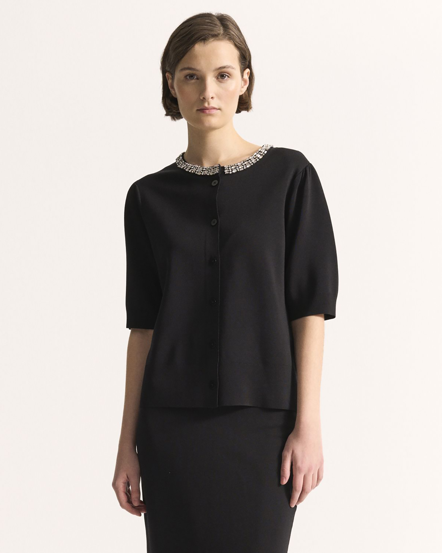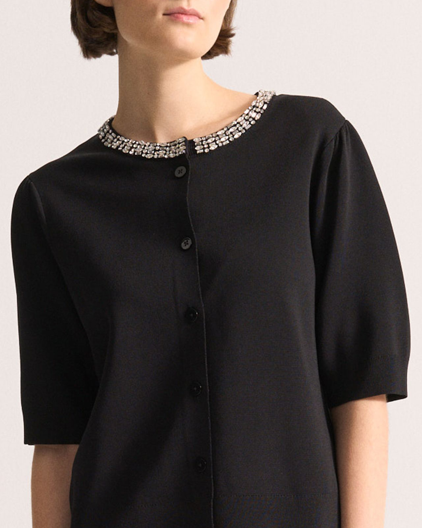 Полуприталенный кардиган UNQ черного цвета. Модель с круглым вырезом, декорированным крупными камнями, застежка на пуговицы в тон, короткие рукава, присборенные у плеча. Кардиган станет идеальной альтернативой джемперу или рубашке.
