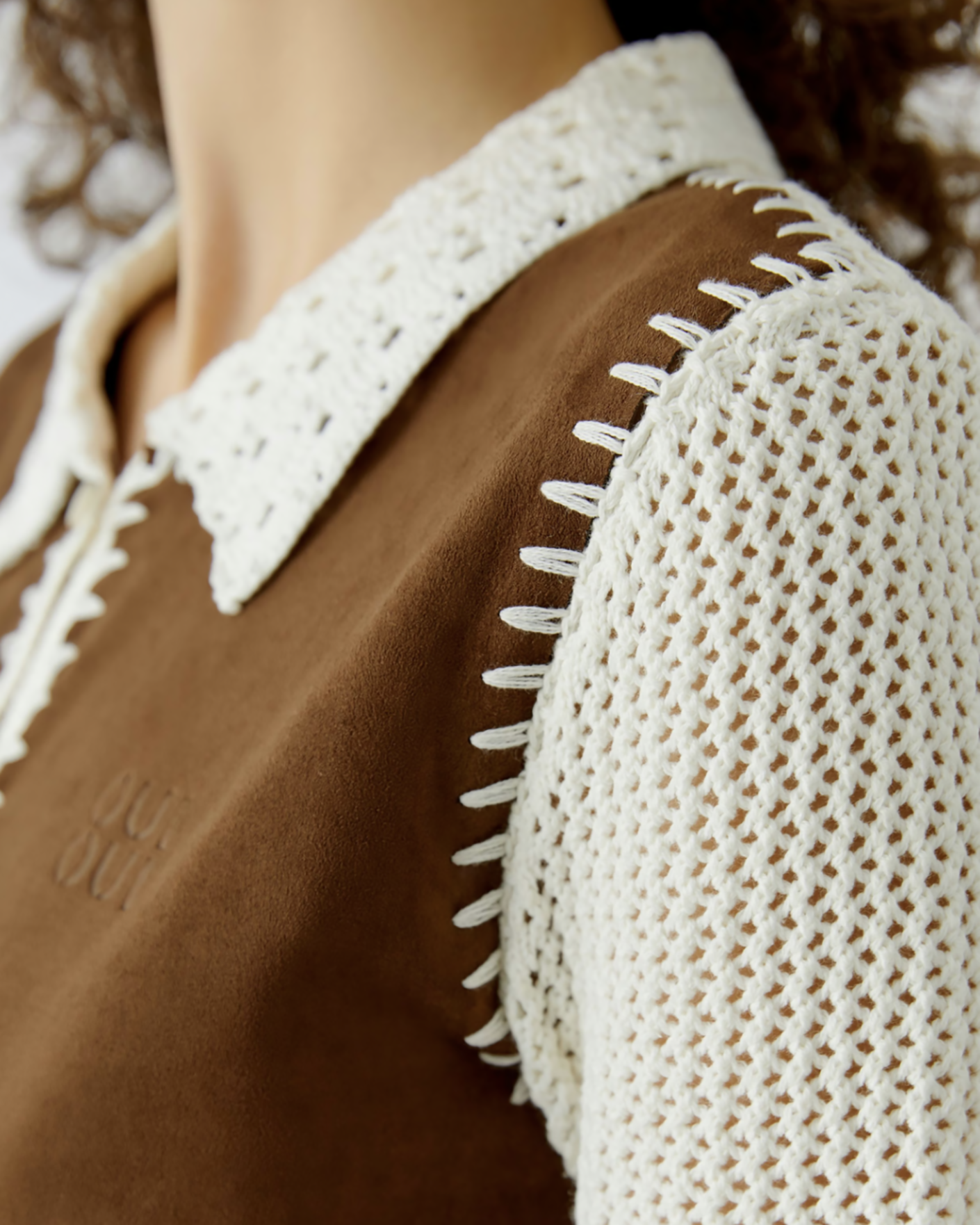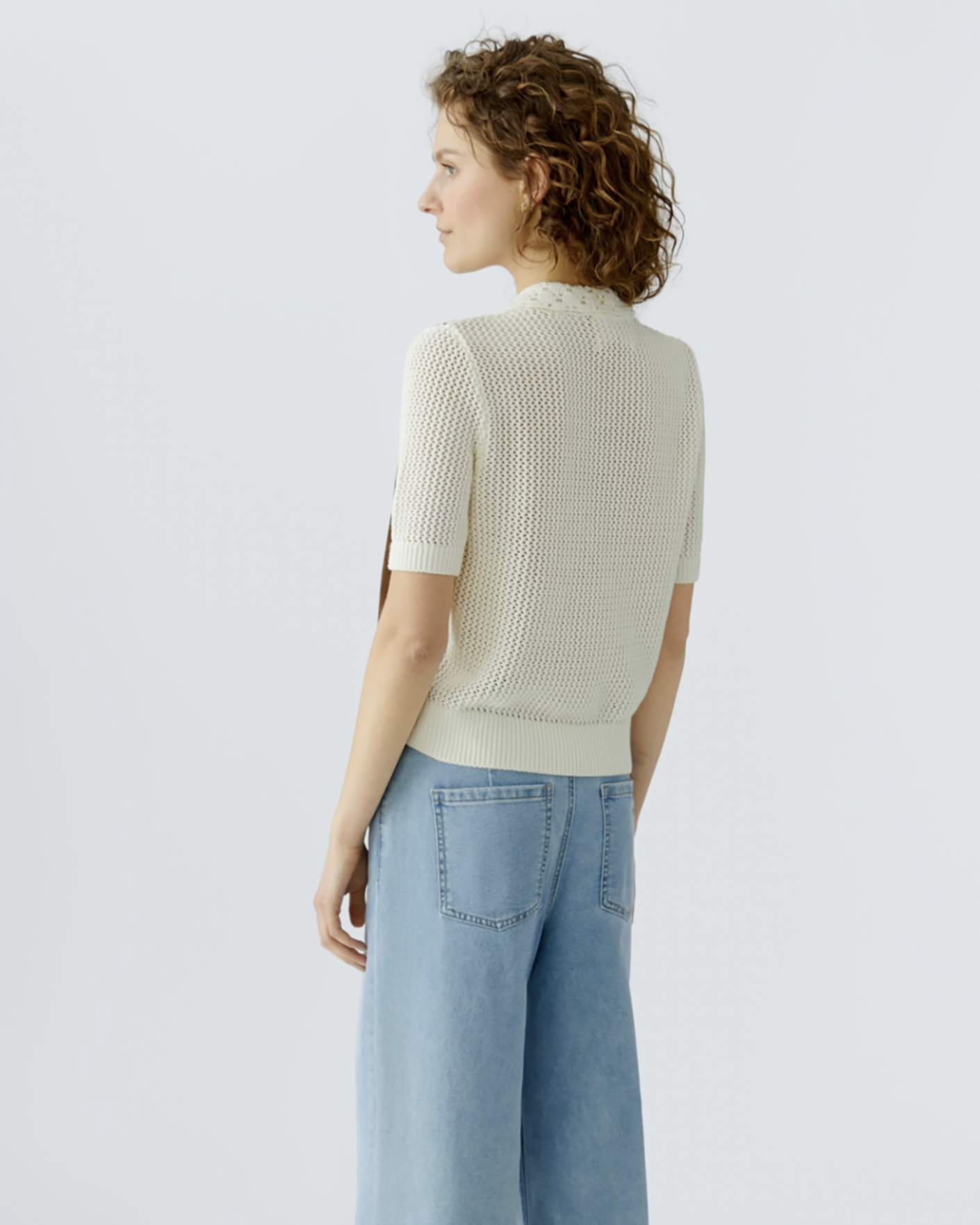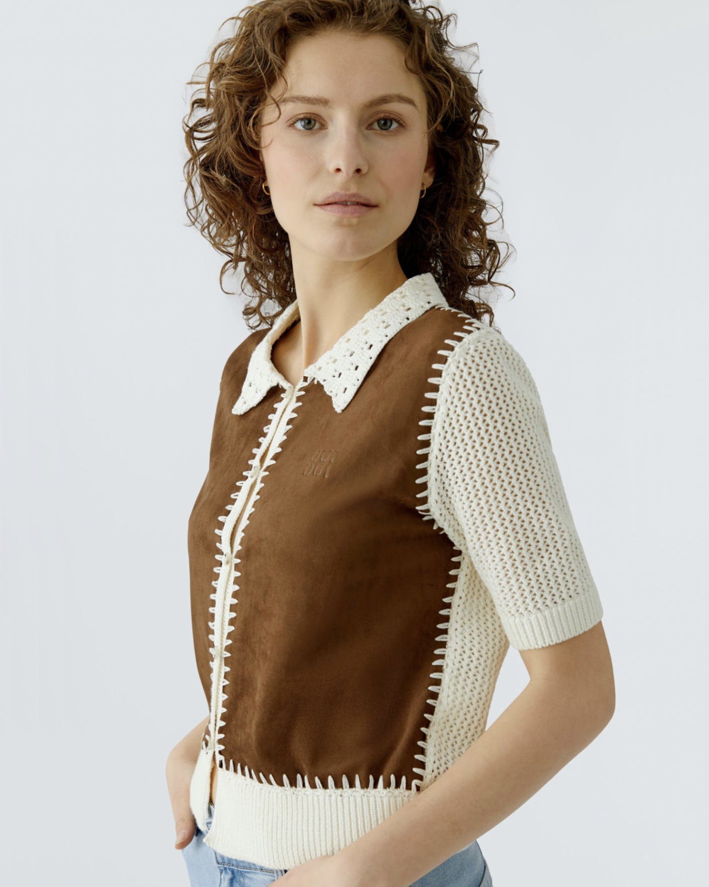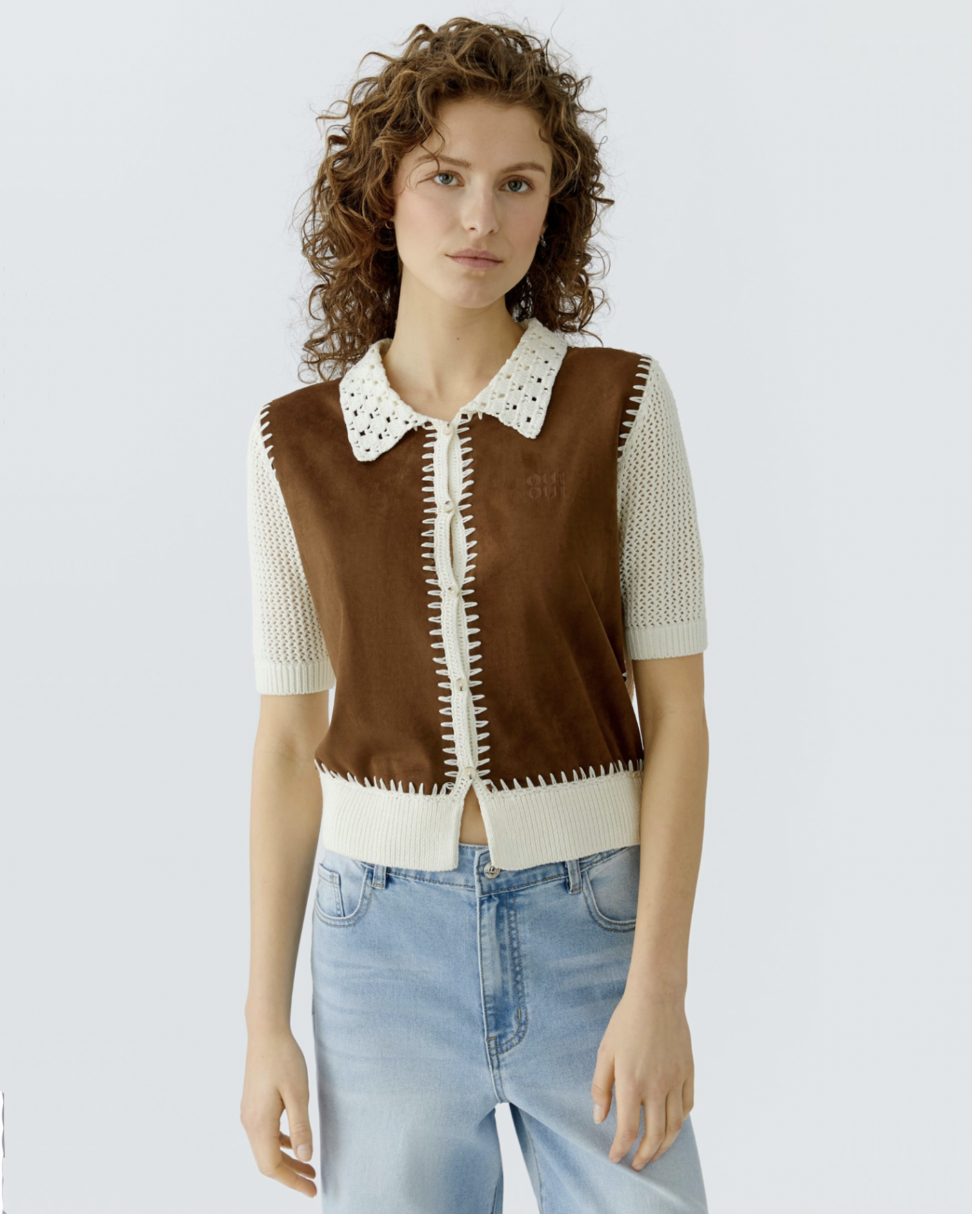Кардиган OUI бело-коричневого цвета. Комбинированная модель с отложным воротником, спинкой и короткими рукавами в вывязанный рисунок. Застежка на мелкий пуговицы в тон, манжеты и низ на ребристой резинке. Стильный кардиган для ваших незабываемых образов.