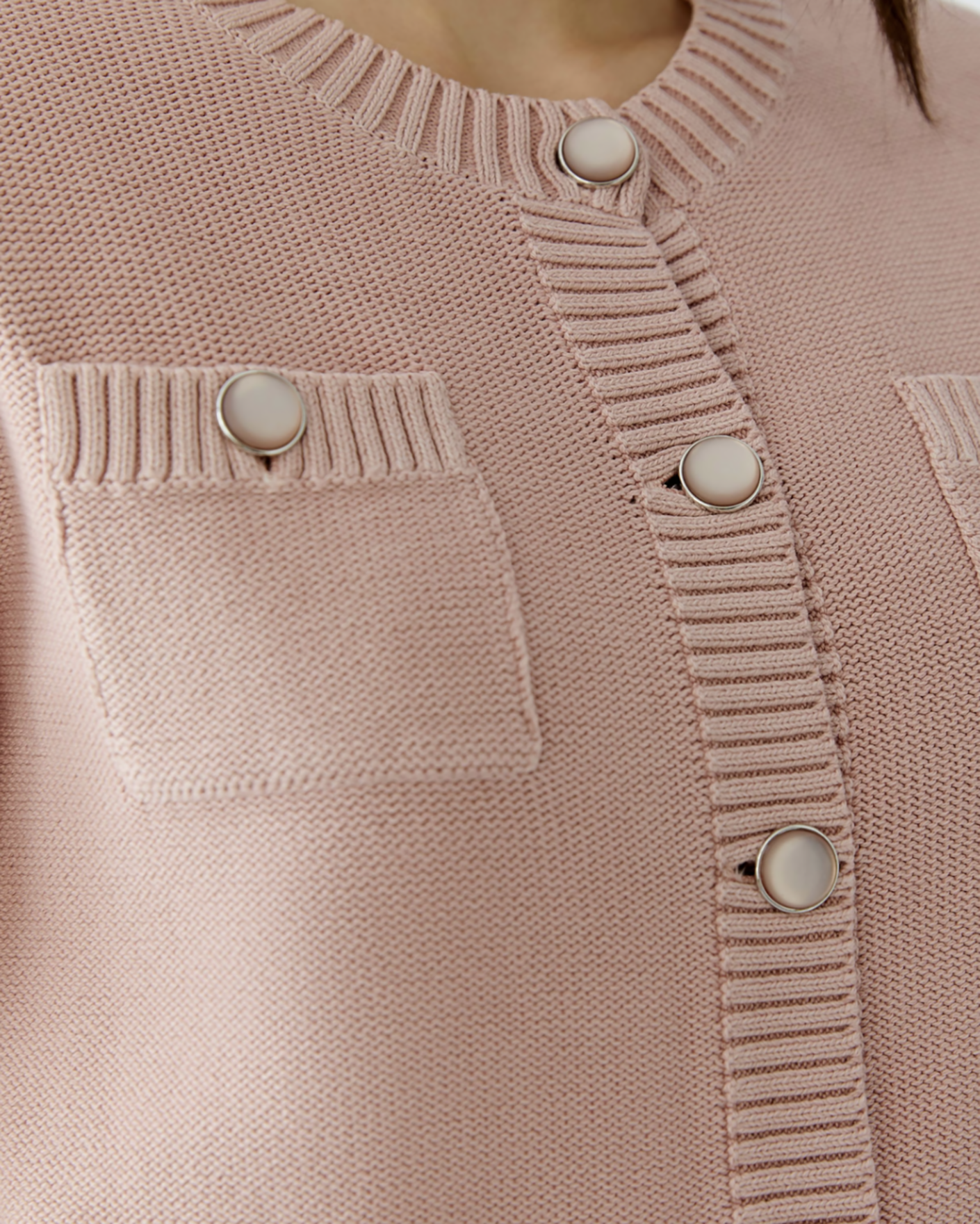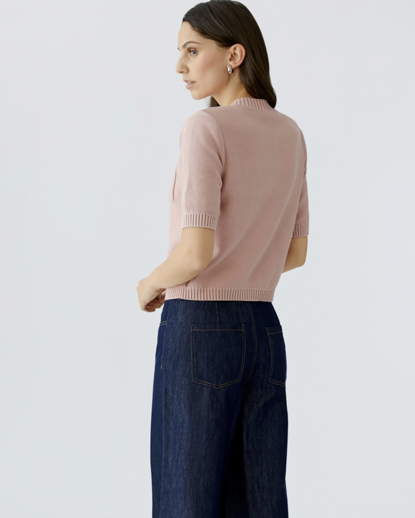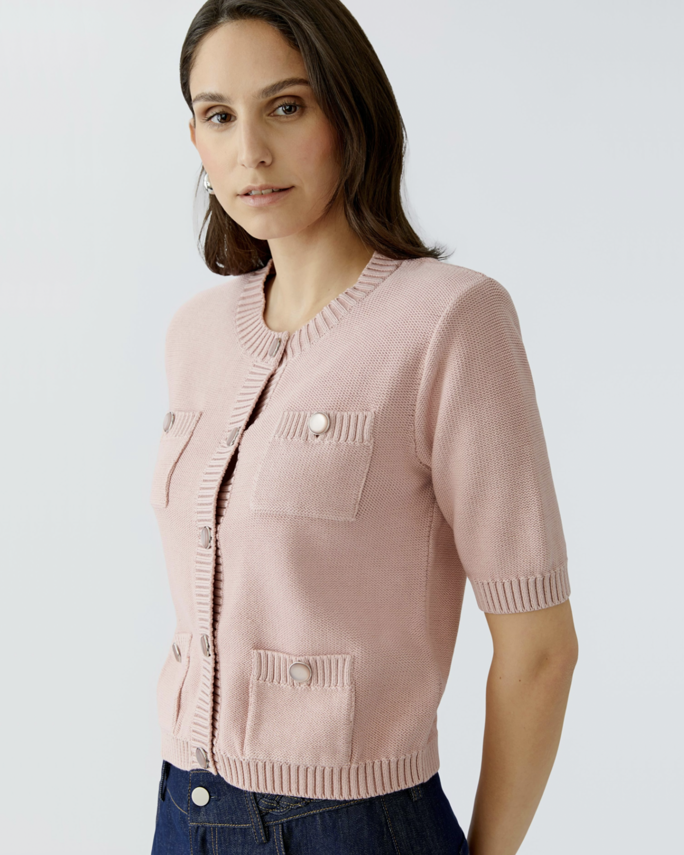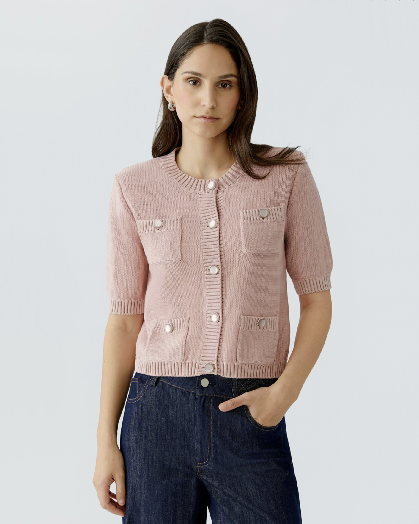 Кардиган OUI розового цвета. Хлопковая модель с круглым вырезом, застежка на пуговицы, короткие рукава, имеются четыре накладных кармана. Все края на вывязанной широкой резинке. Кардиган отлично впишется в ваш гардероб.