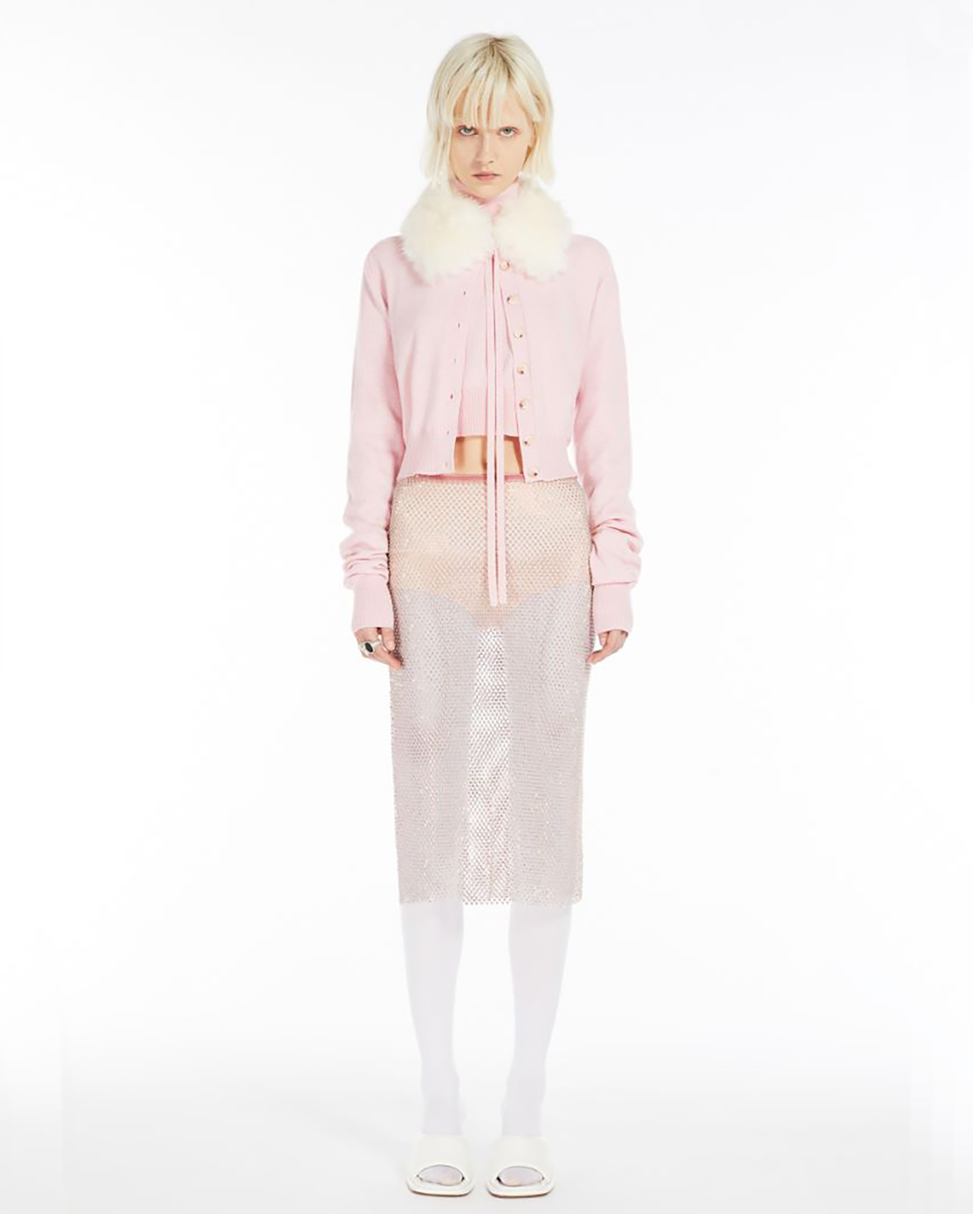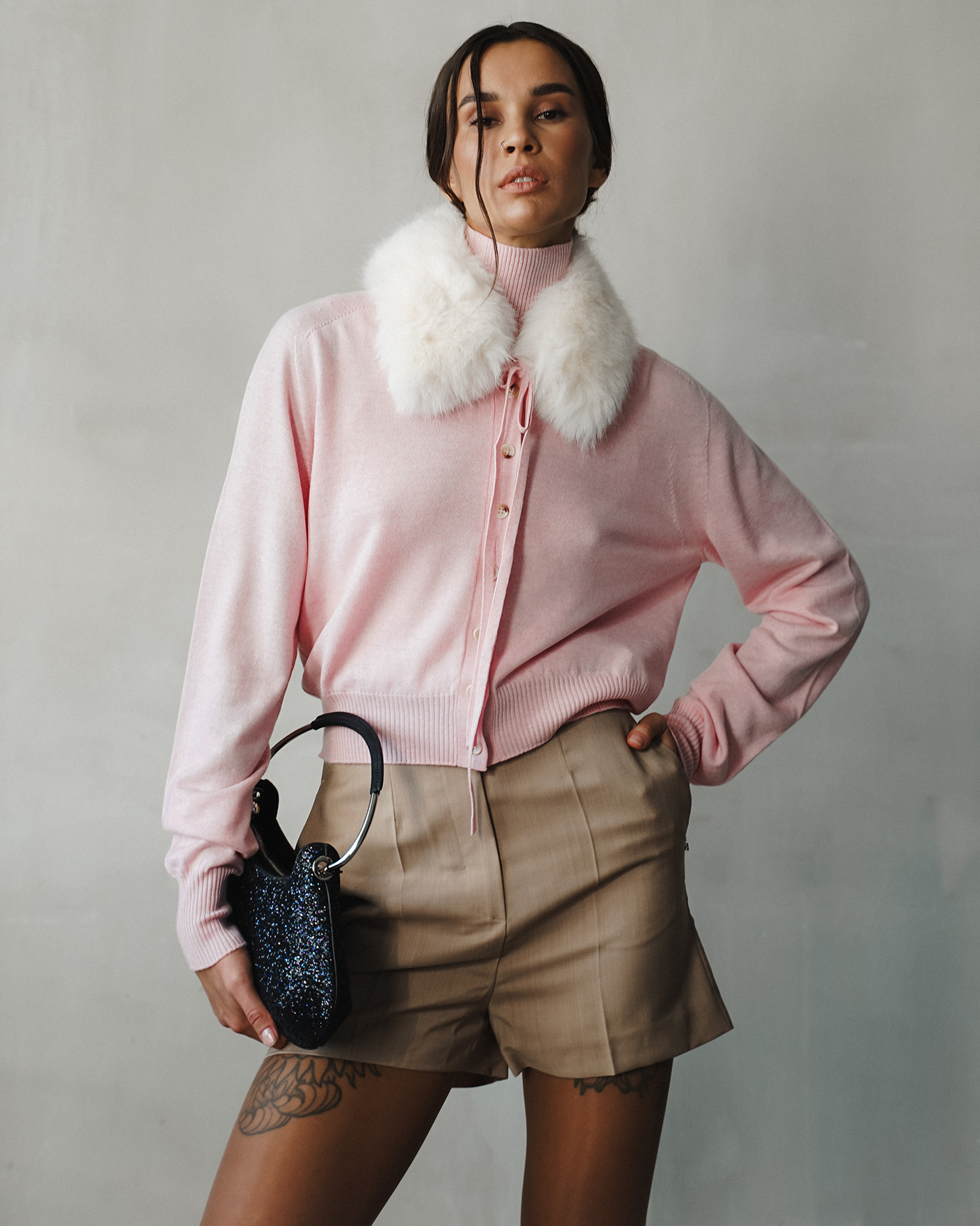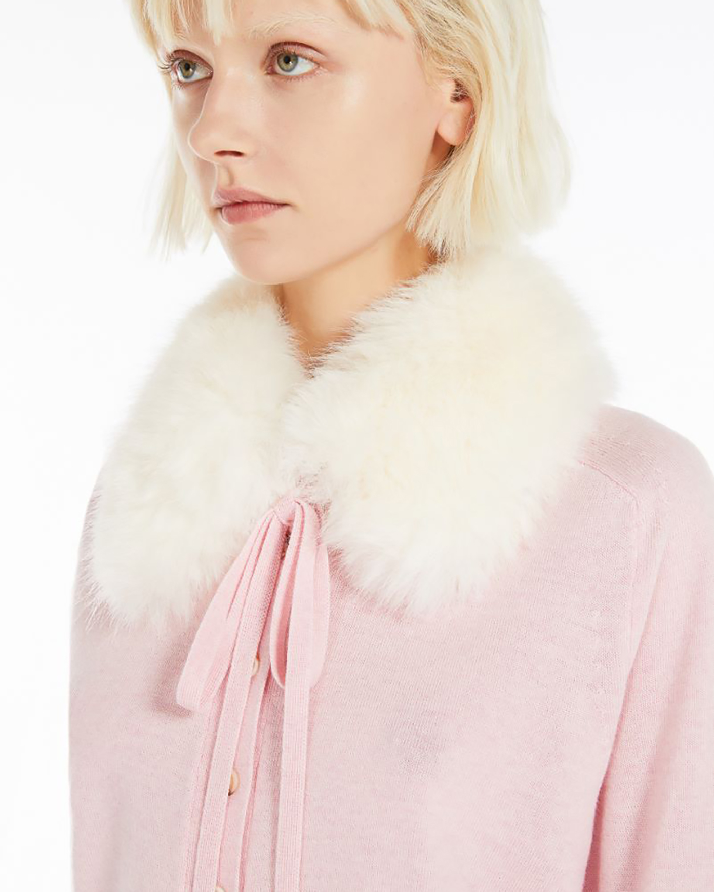 Кардиган Sportmax розового цвета в строчный рисунок. Модель из 100% шерсти, отложной воротник, застежка на пуговицы, манжеты и низ на тонкой ребристой резинке. Изюминка изделия - съемный меховой воротничок. Стильный кардиган станет любимым выбором к повседневному образу.