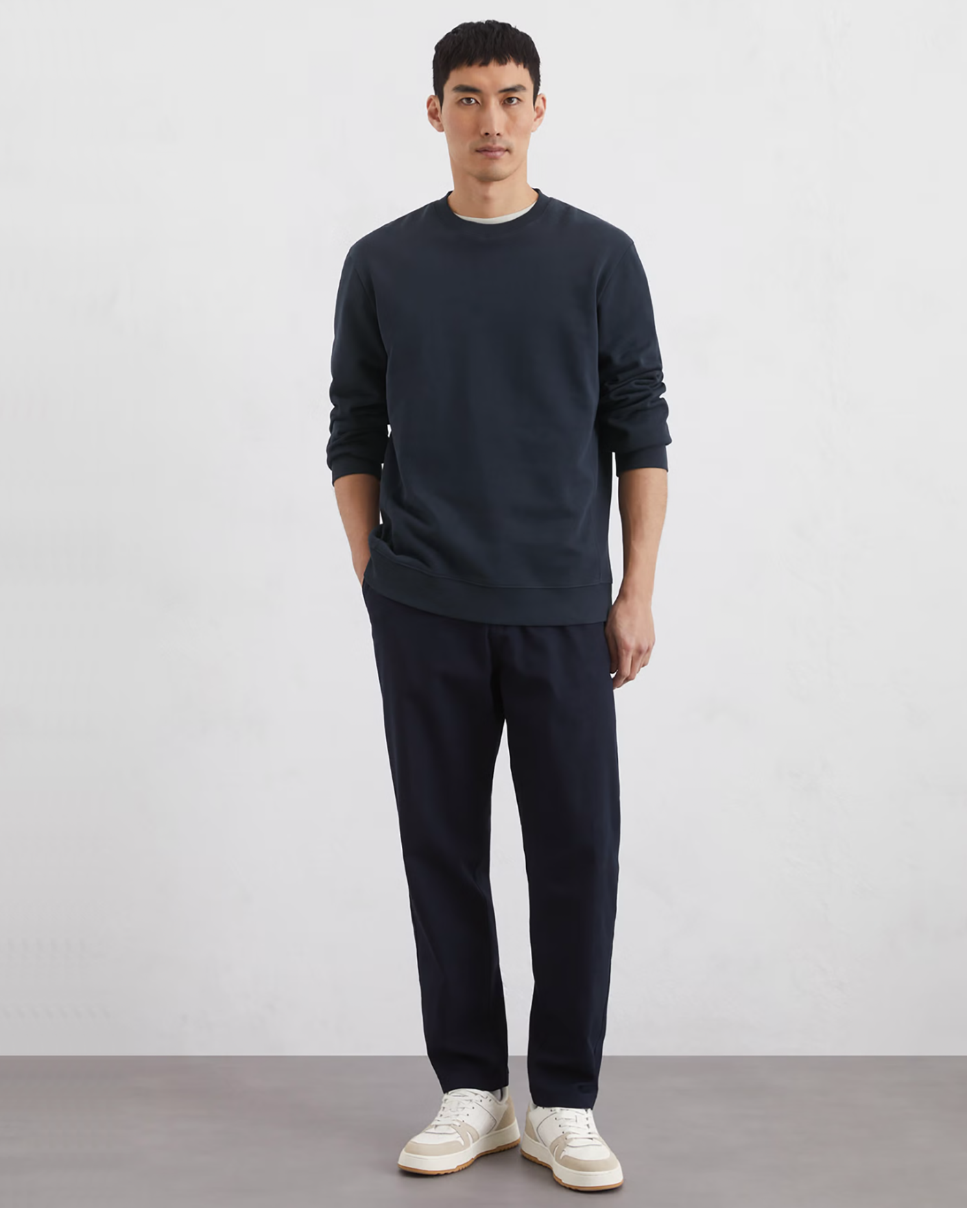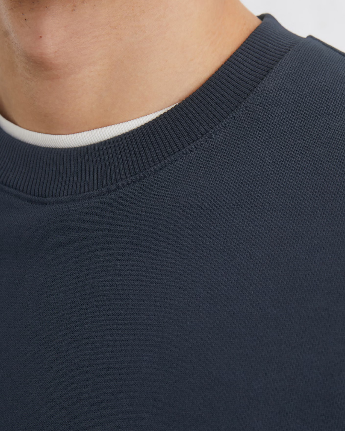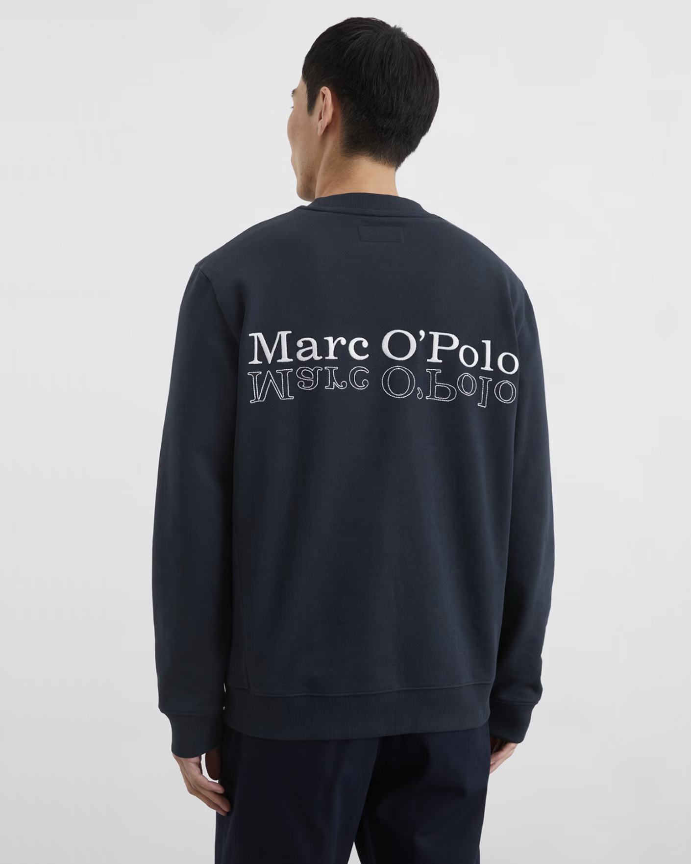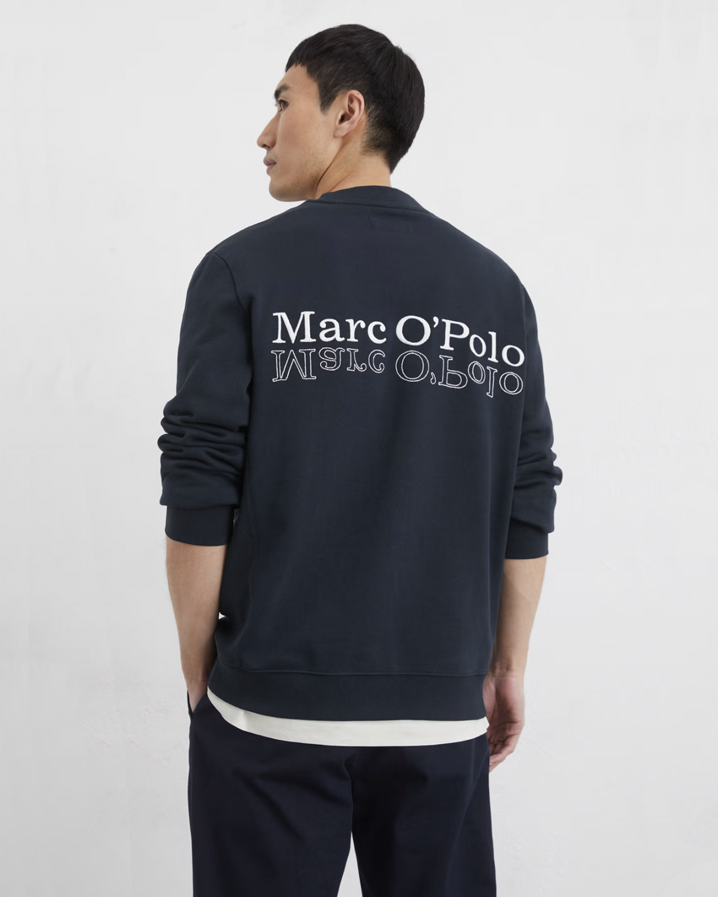 Толстовка Marc O'Polo темно-синего цвета в строчный рисунок и вышивкой логотипа на спинке. Модель из 100% хлопка, круглый вырез, манжеты и низ на резинке. Толстовка отлично впишется в повседневный гардероб.