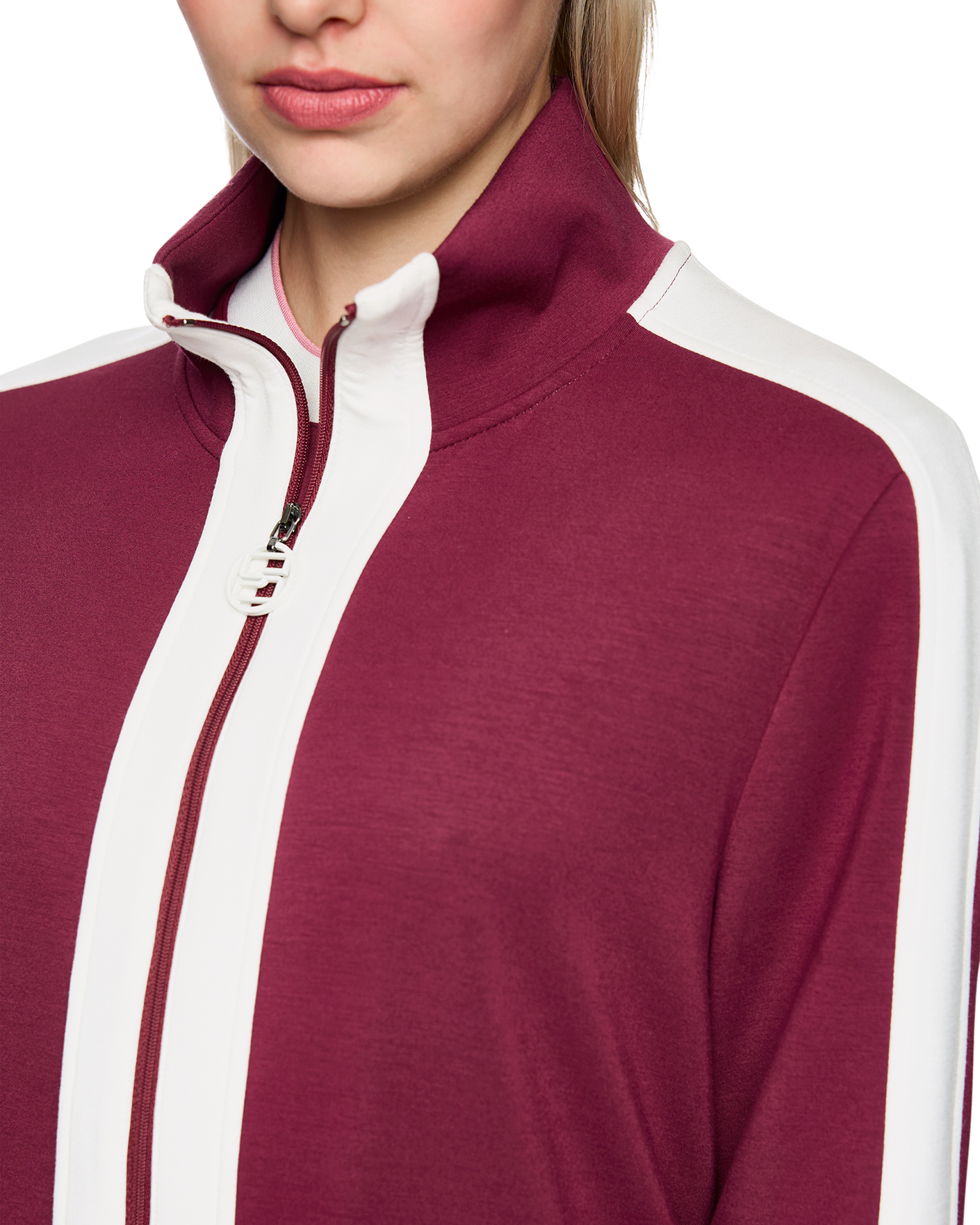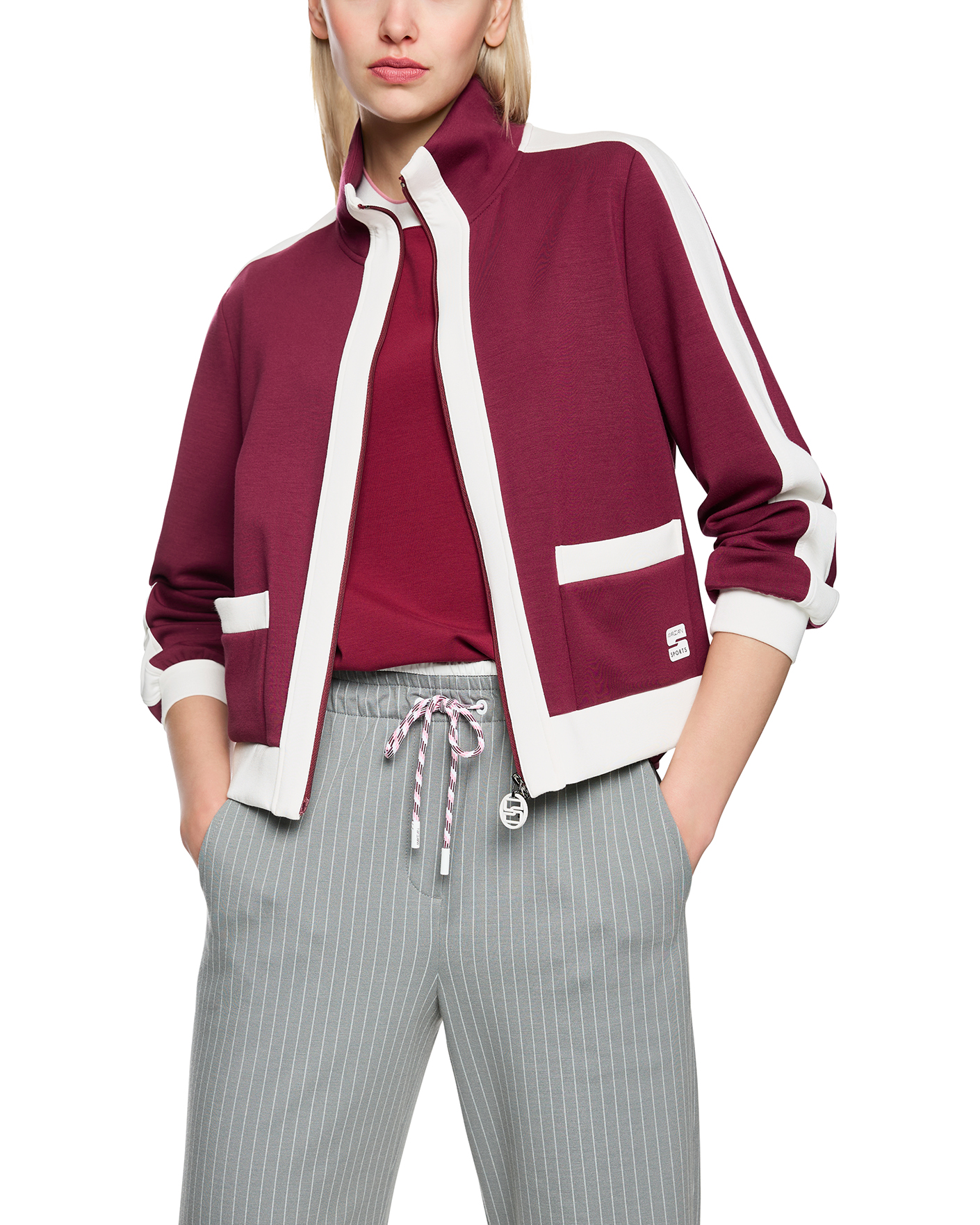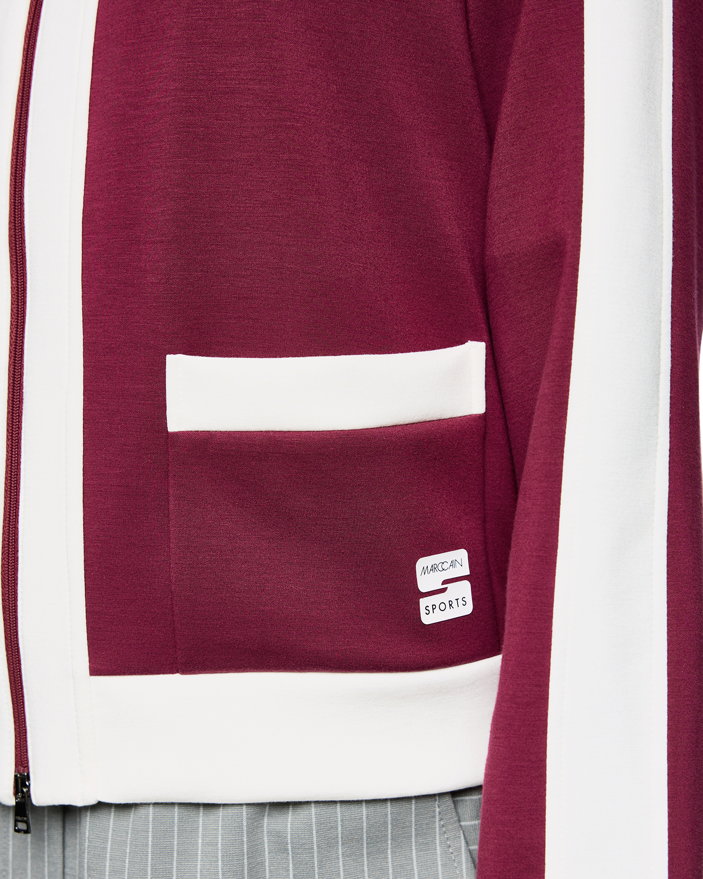 Толстовка Marc Cain Sport вишневого цвета с широкими лампасами. Модель с воротником-стойка, застежка на контрастную молнию, имеются накладные карманы по бокам, а также манжеты на резинке. Толстовка отлично впишется в гардероб в спортивном стиле.