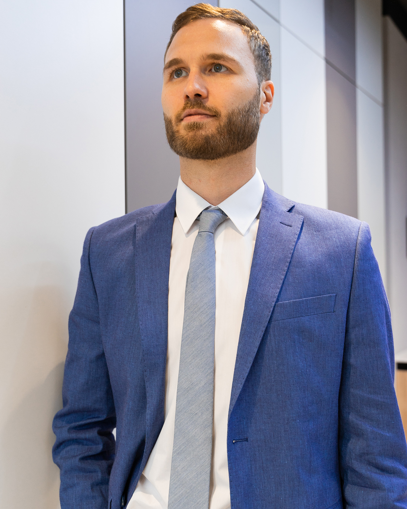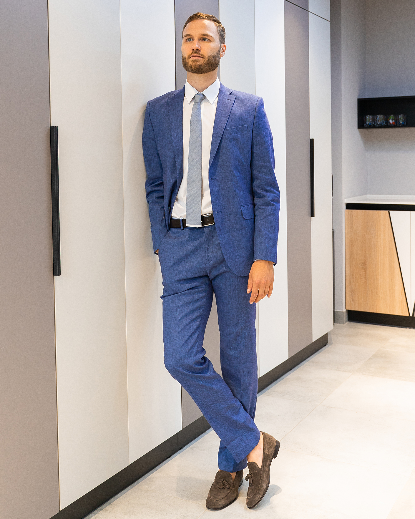Костюм Truvor сиренево-синего цвета. Пиджак с лацканами, застежка на пуговицы, имеются два боковых кармана с клапанами. Зауженные брюки со стрелками.