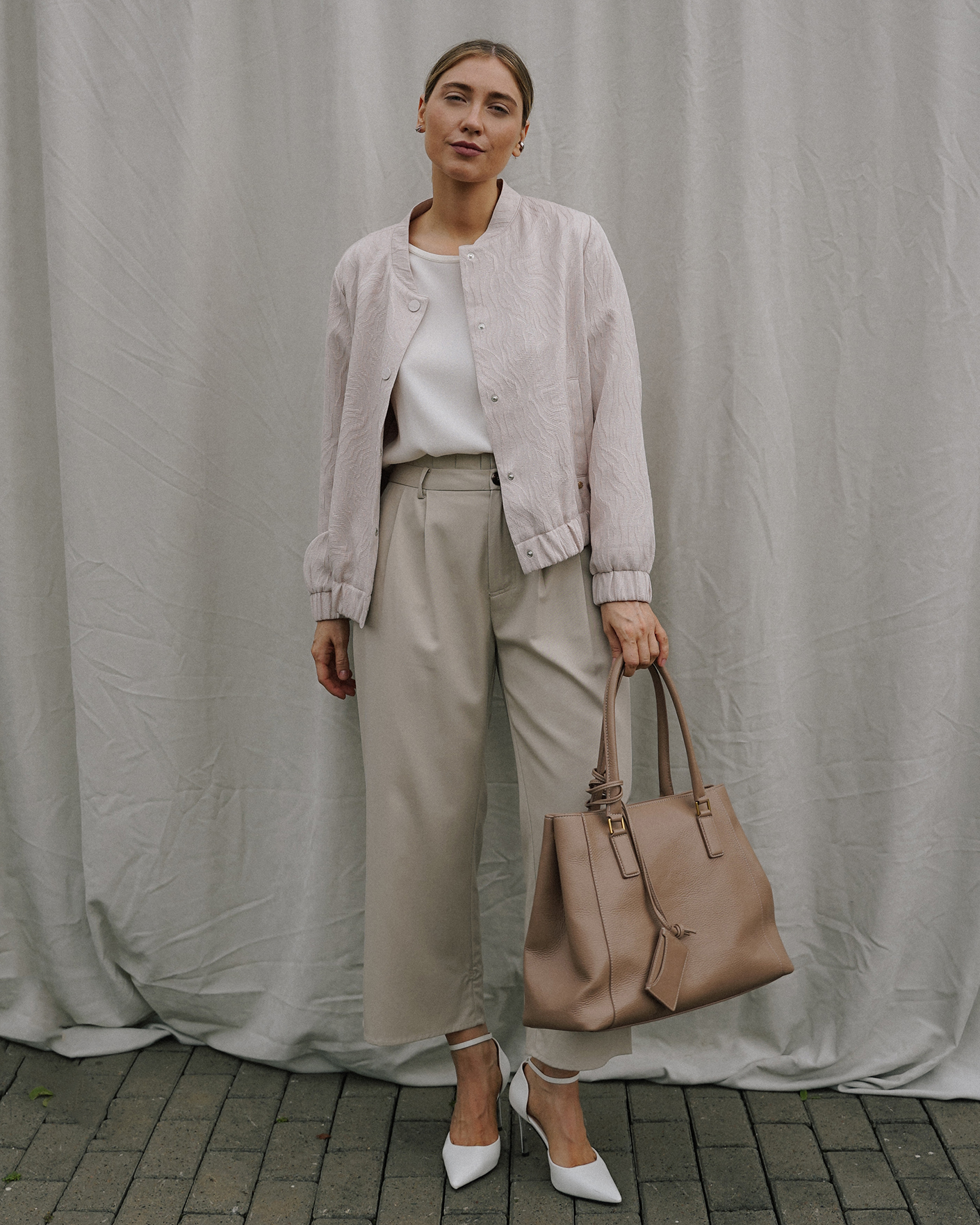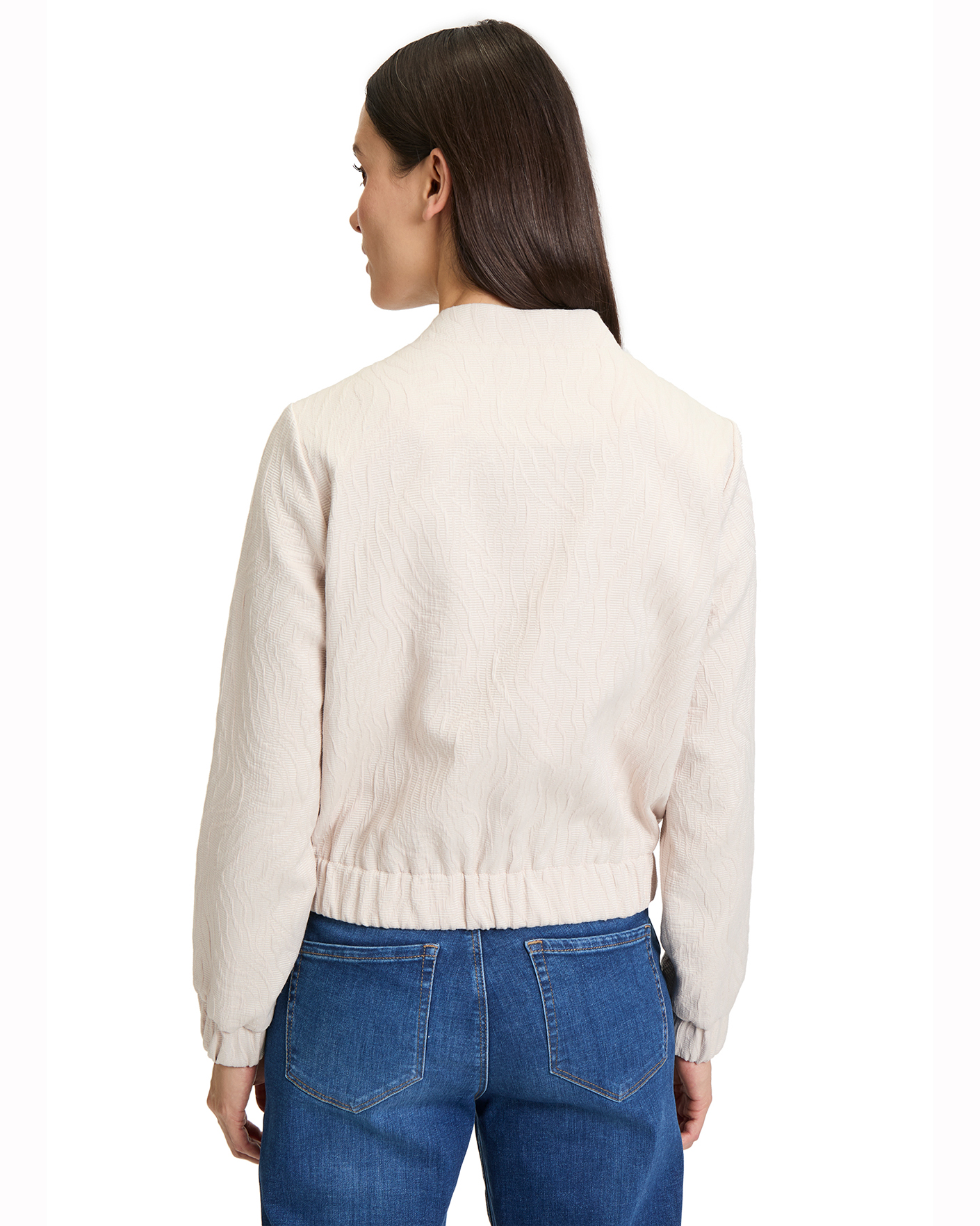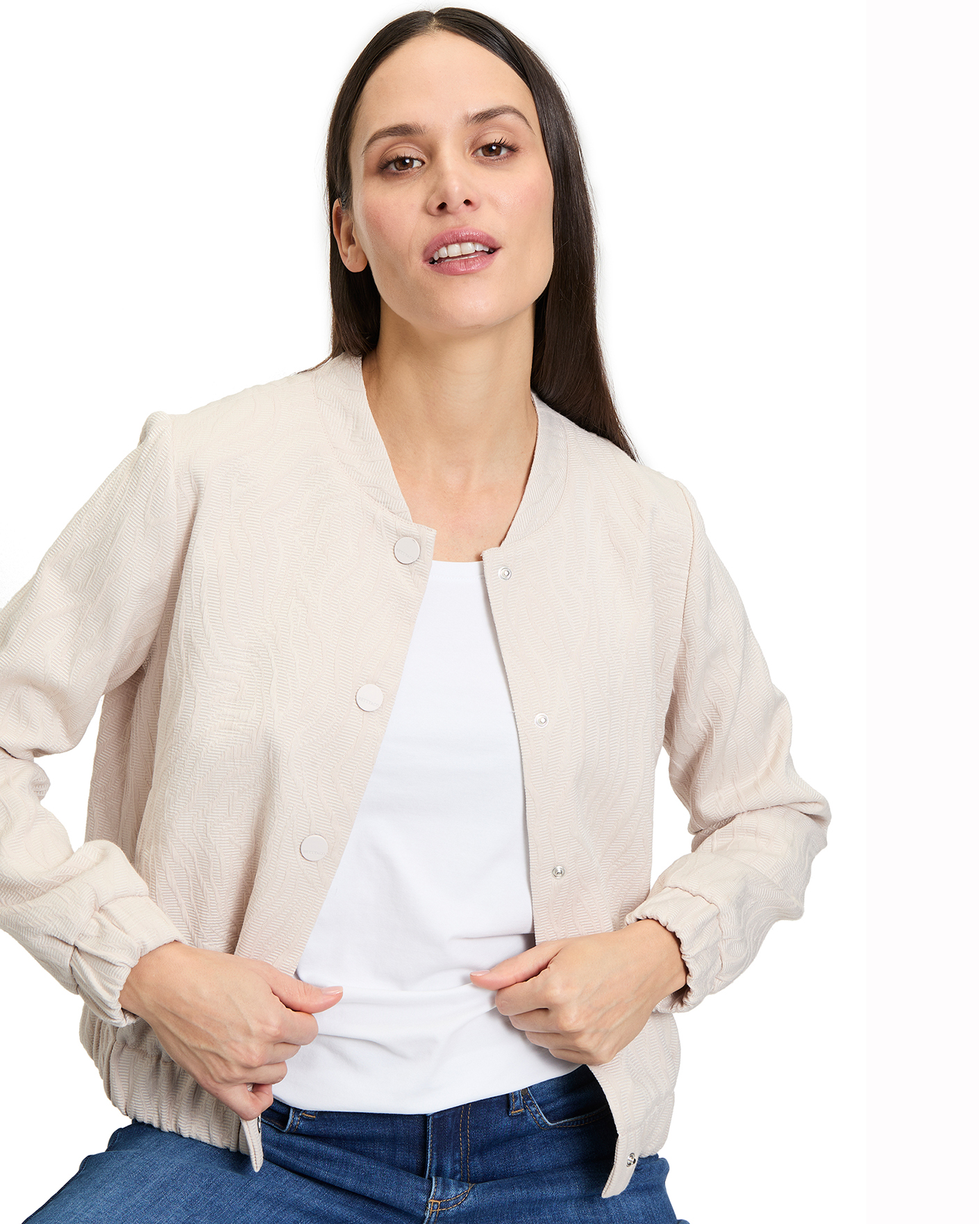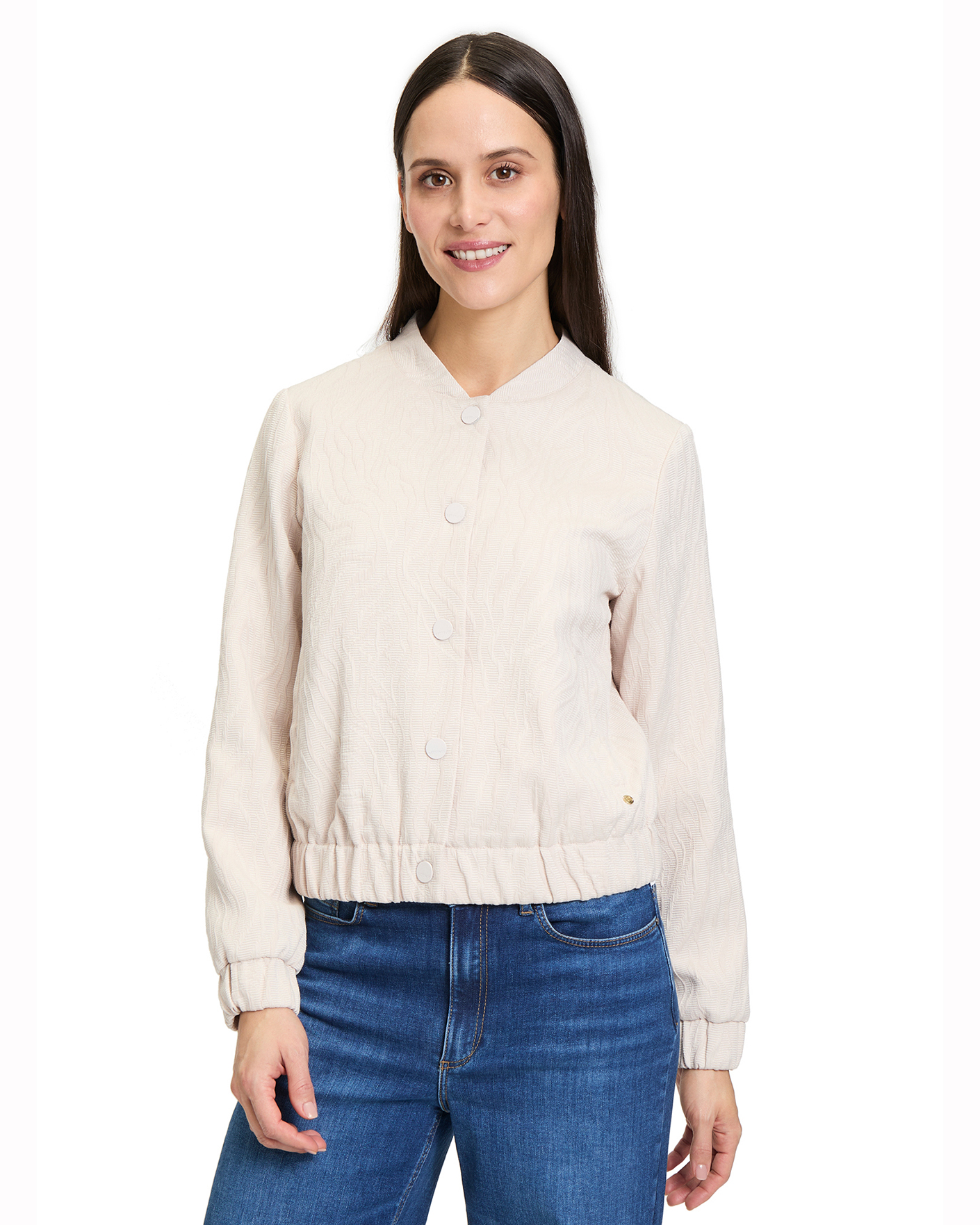 Свободная куртка-бомбер Betty&Co светло-бежевого цвета в текстурный рисунок. Модель с небольшим воротником-стойка, застежка на кнопки, врезные карманы по бокам. Манжеты и низ на вставной резинке в складку. Стильный бомбер отлично впишется в повседневный гардероб.