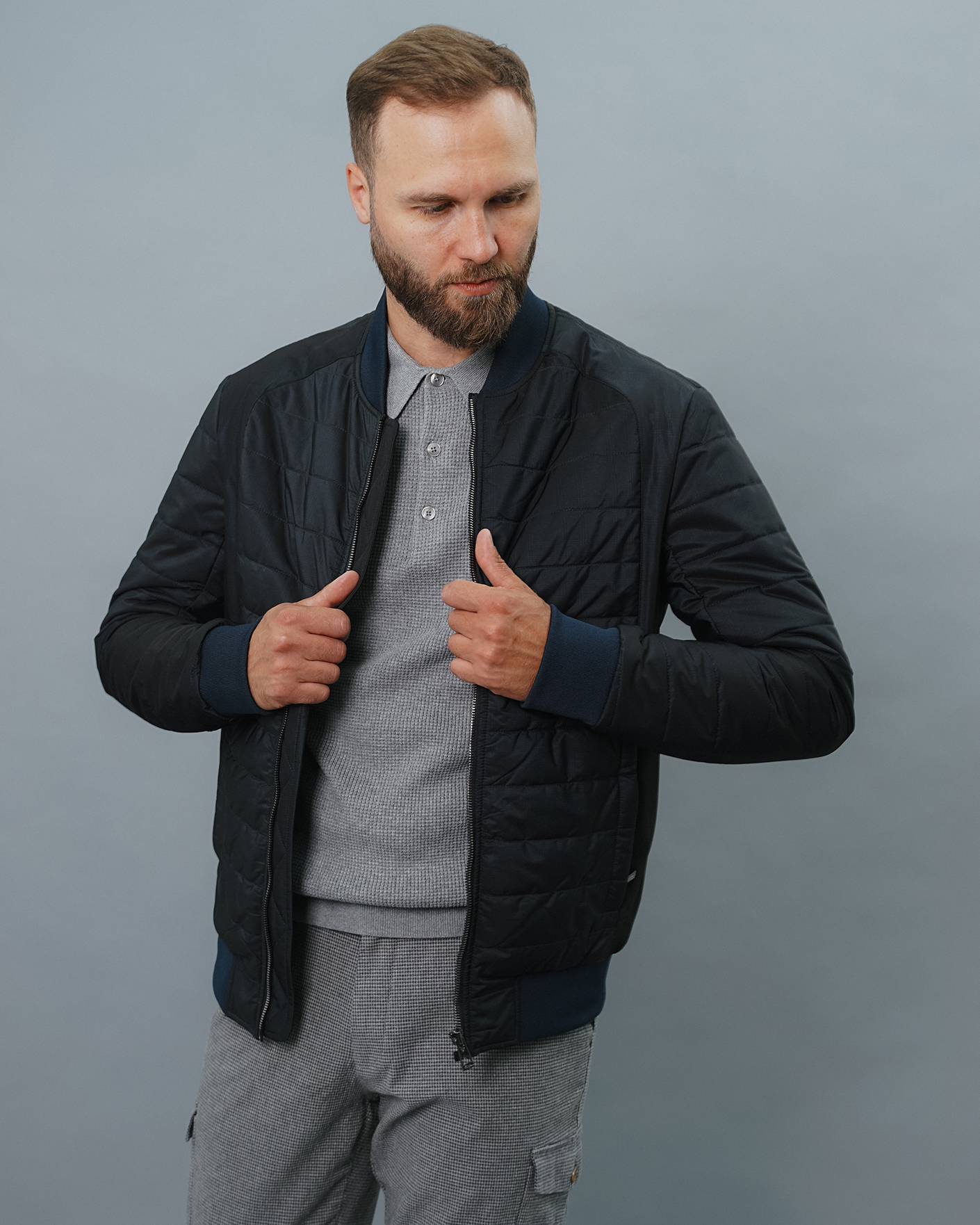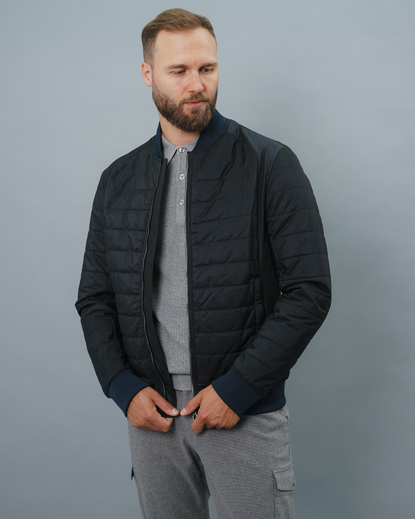 Утепленная куртка-бомбер Aero Giacca черно-синего цвета в горизонтальную стежку. Удлиненный ворот, манжеты и низ на тонкой резинке синего цвета. Застежка и боковые карманы на молниях. Куртка-бомбер станет идеальным дополнением вашему гардеробу в стиле casual.