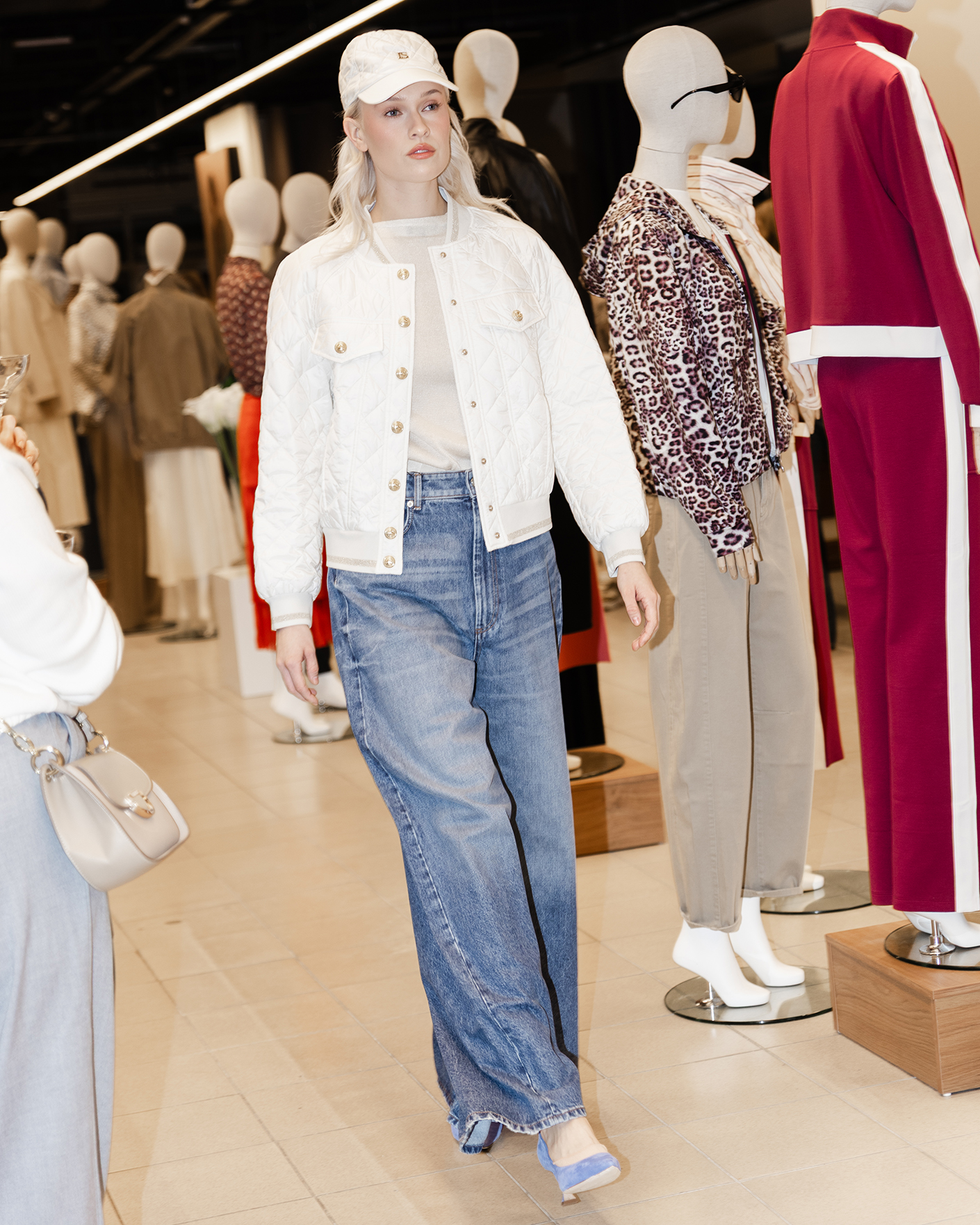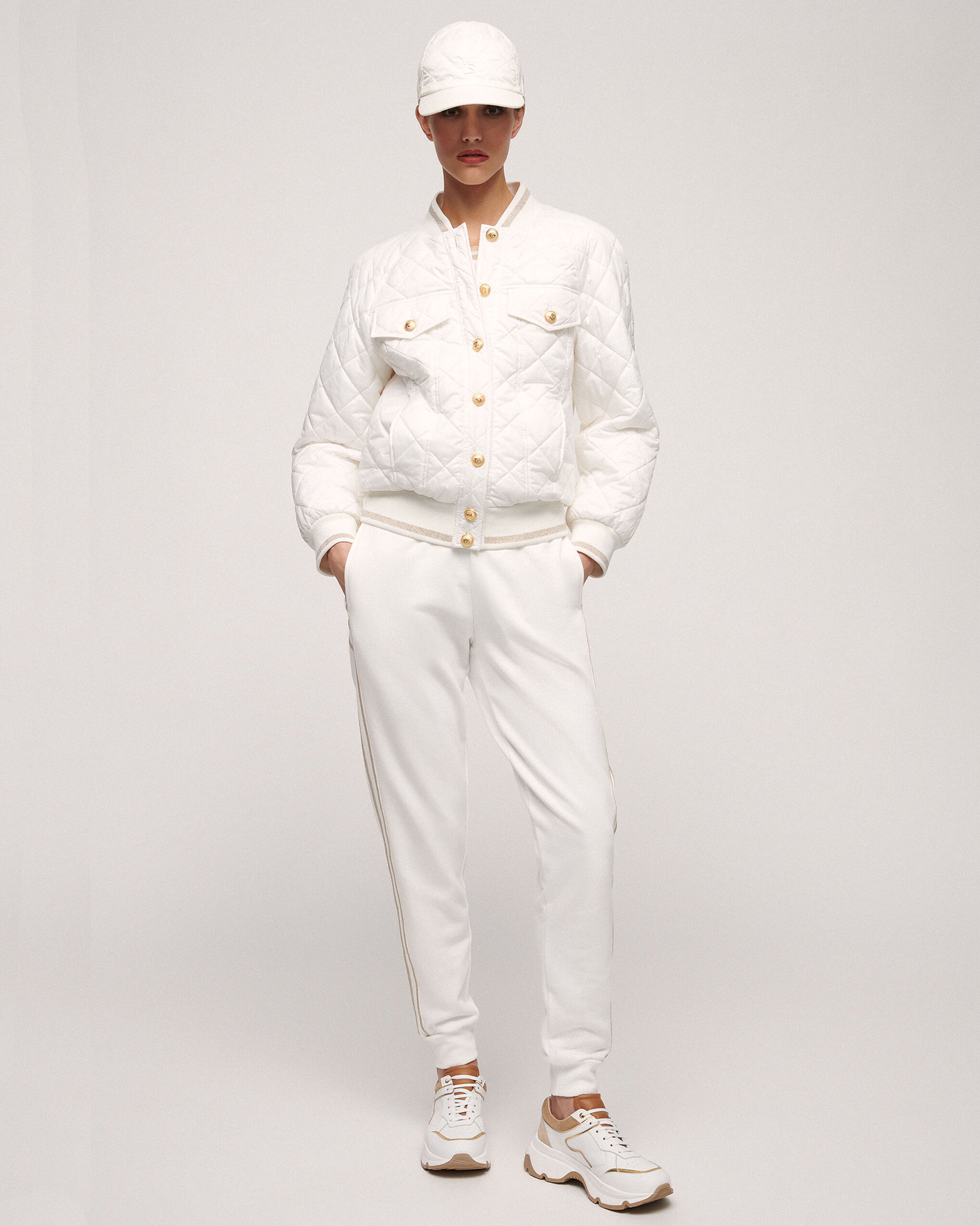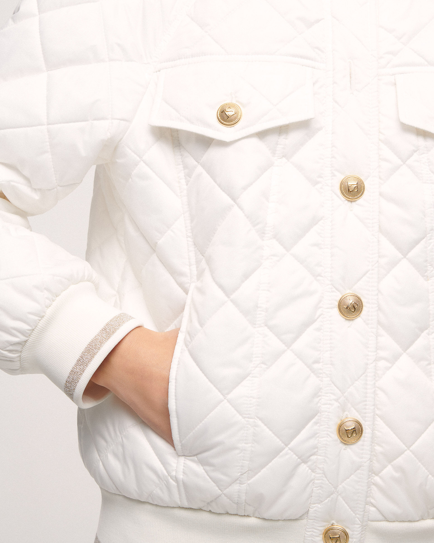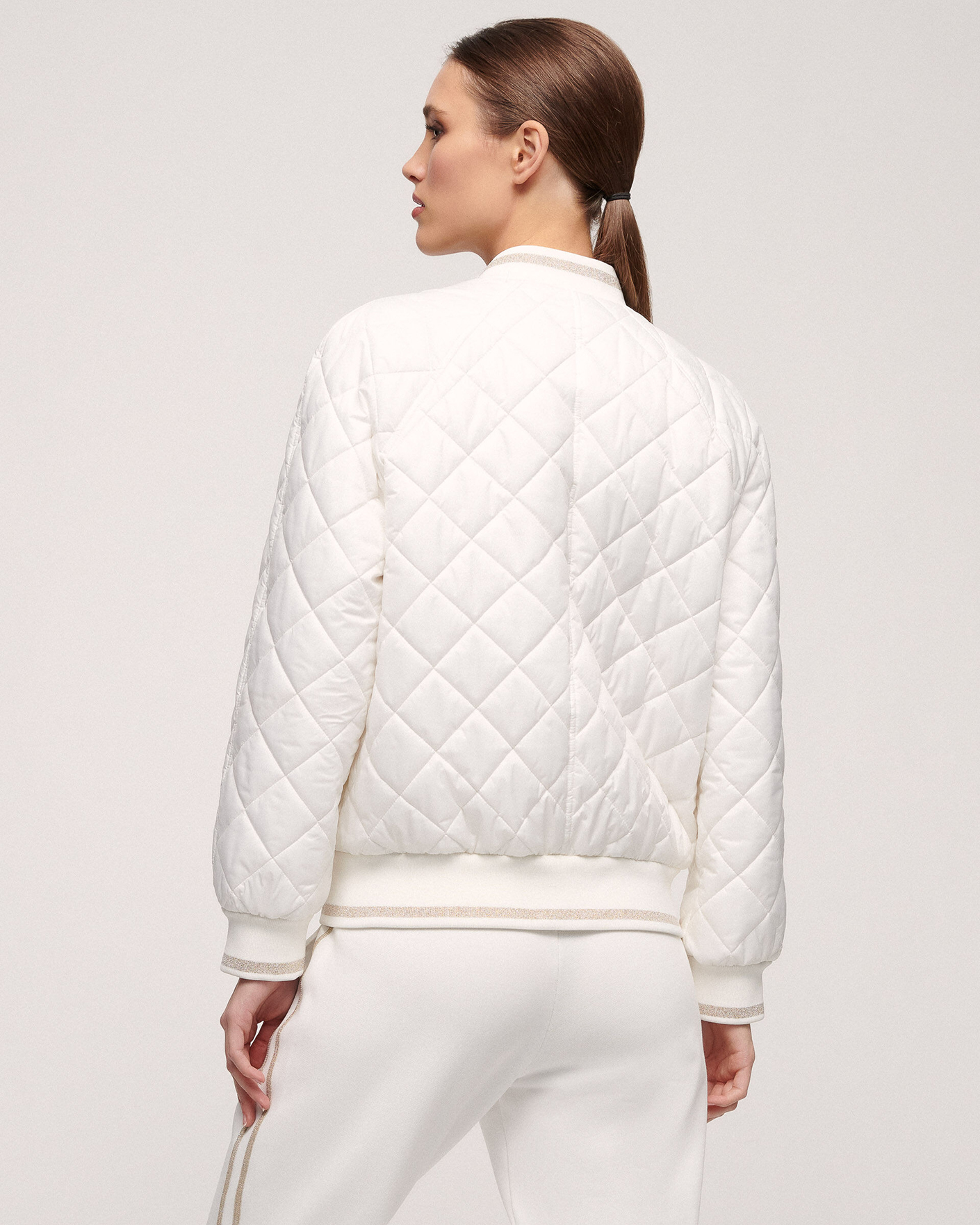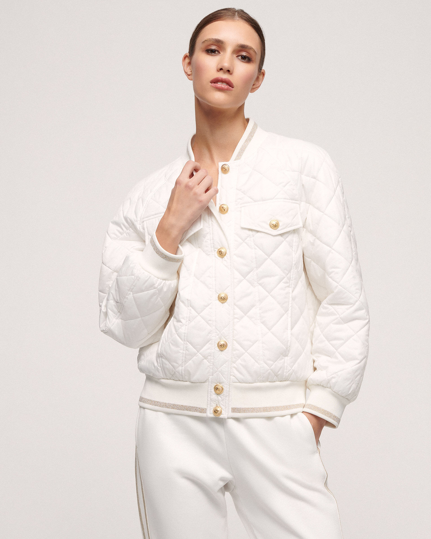 Утепленная куртка-бомбер Luisa Spagnoli белого цвета в ромбическую стежку. Модель с круглым воротом, манжетами и низом на тонкой резинке с полосой люрексом. Застежка на пуговицы в золотом цвете, имеются врезные карманы по бокам и нагруднными клапанами. Стильная куртка-бомбер станет незаменимой вещью в прохладную погоду.