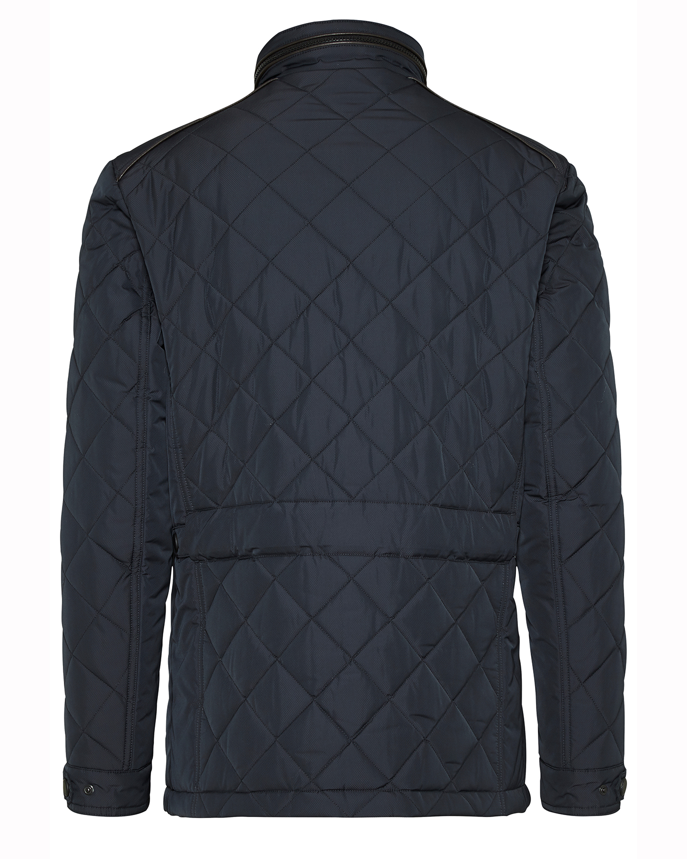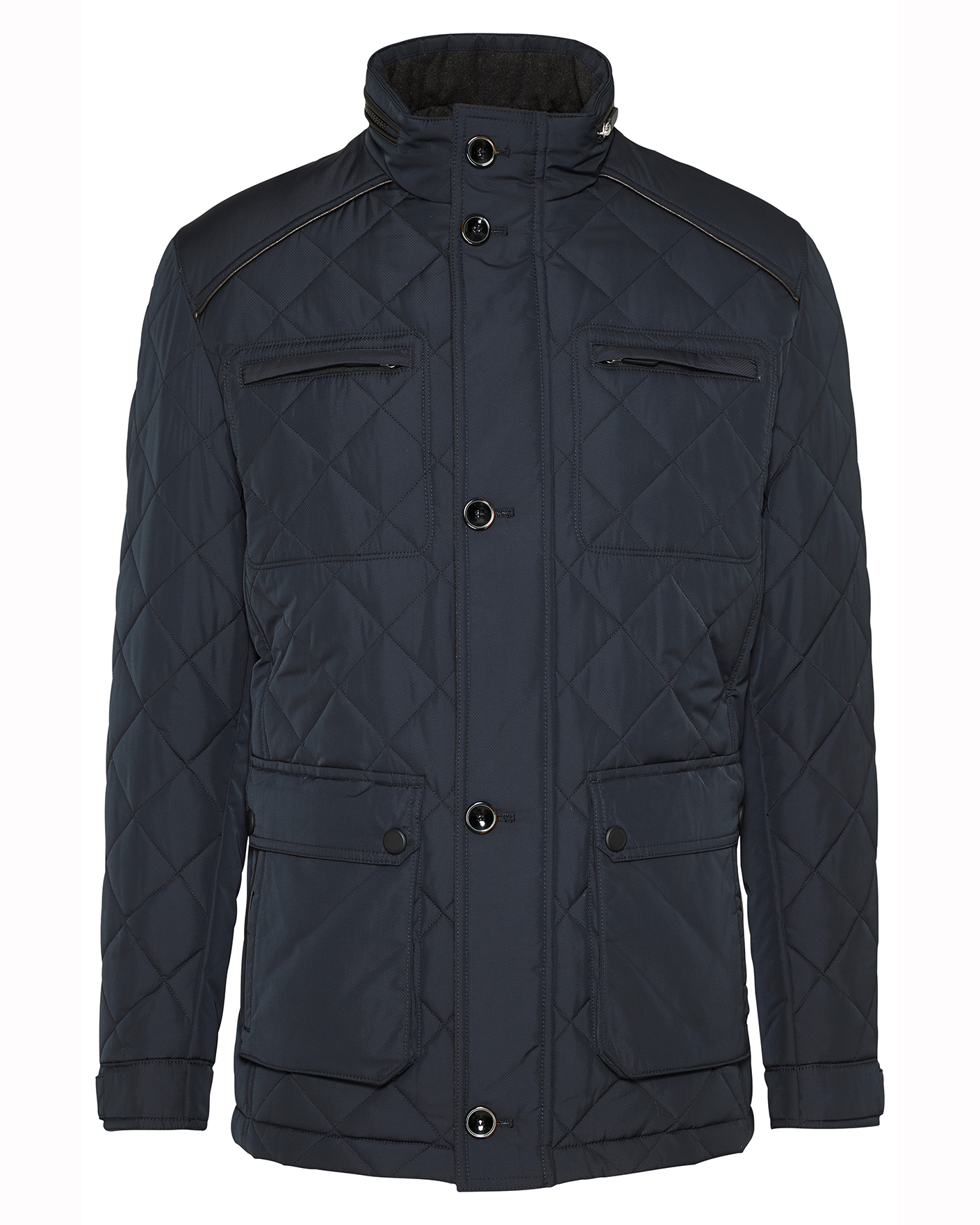 Утепленная куртка Bugatti черно-синего цвета в геометрическую стежку. Модель с воротником-стойка, застежка на скрытую молнию и планку на пуговицы, имеются четыре накладных кармана. Куртка - универсальная вещь в прохладную погоду.