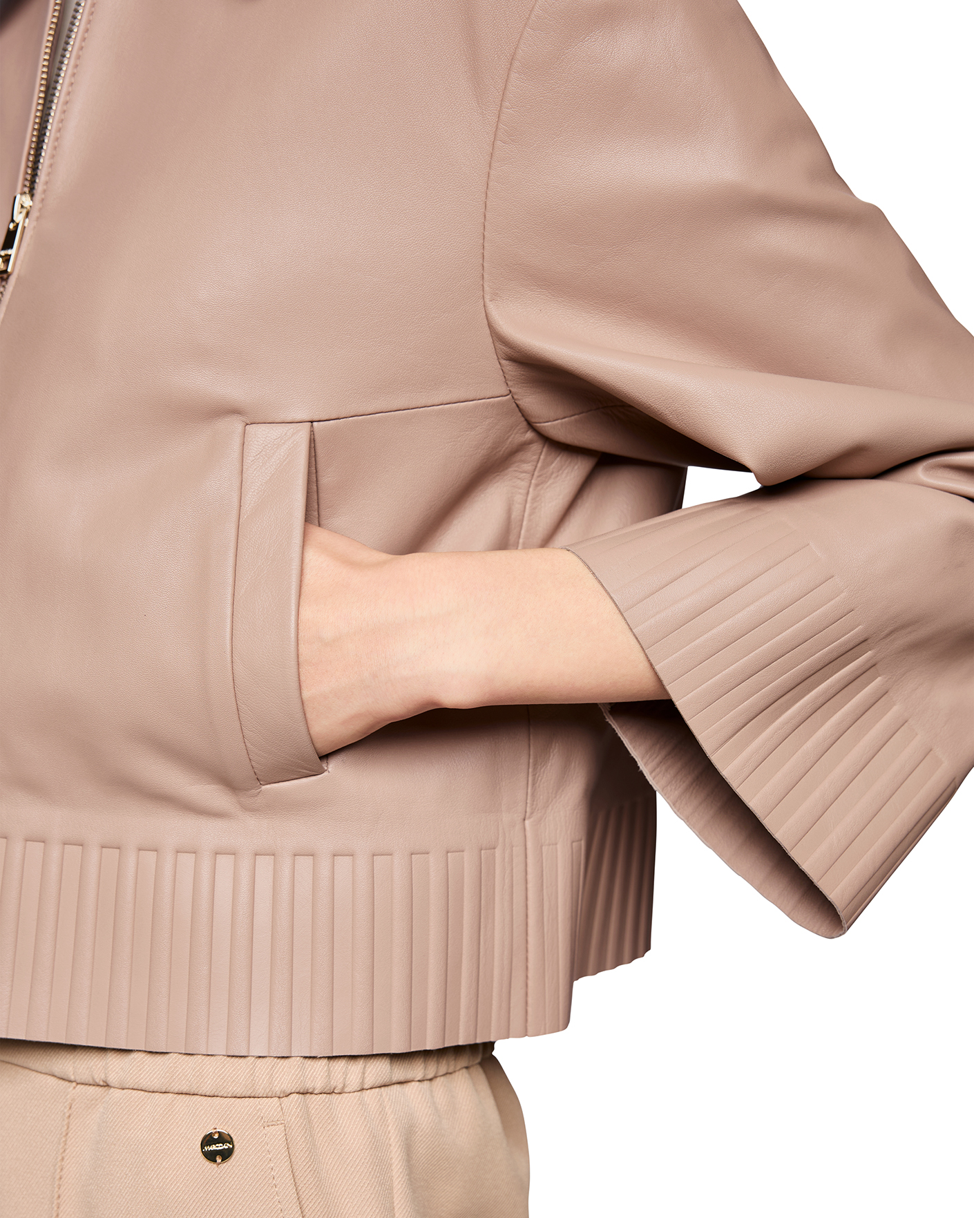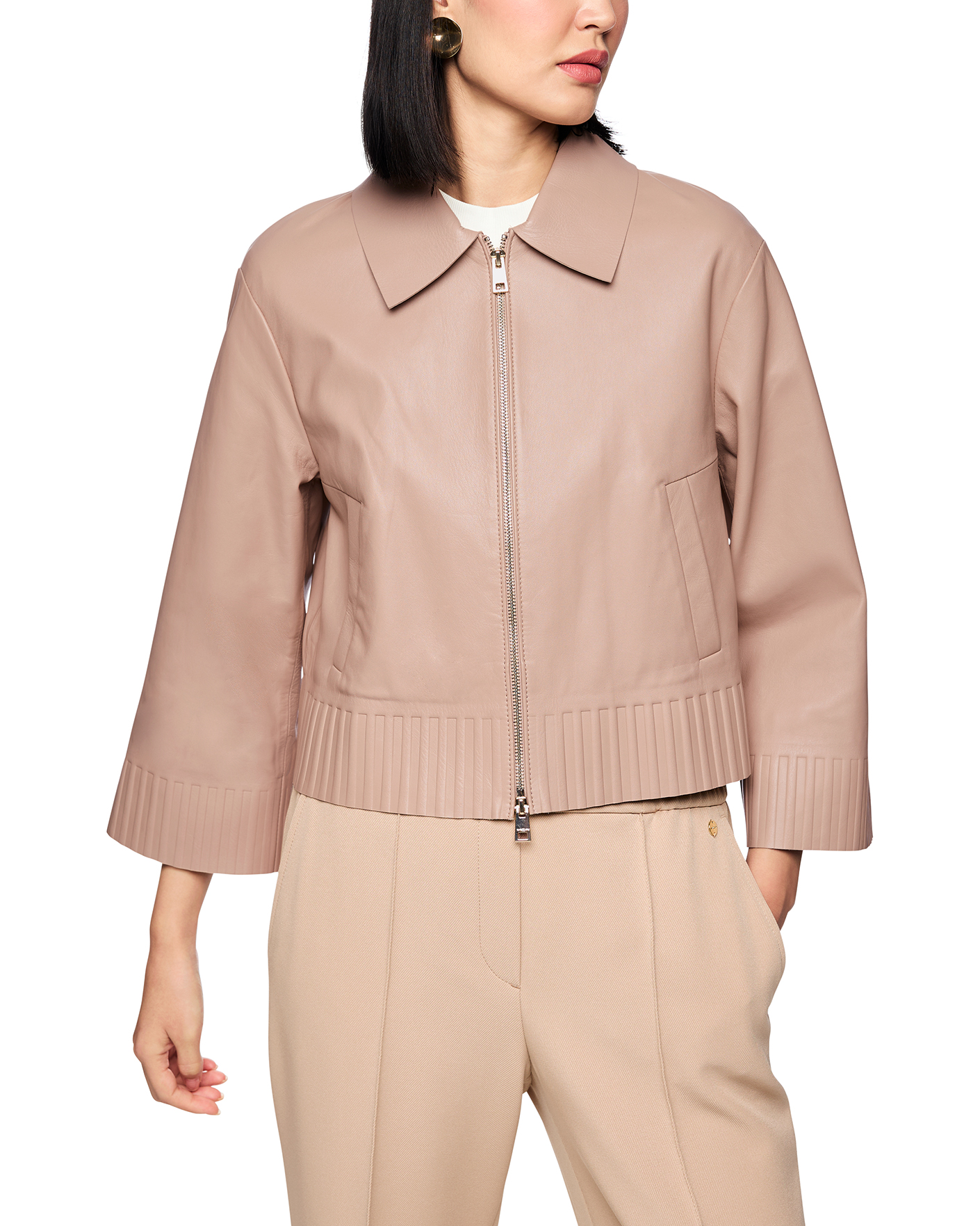 Куртка Marc Cain Collection бежевого цвета с покрытием. Модель с отложным воротником, застежка на молнию, врезные карманы по бокам. А также манжеты и низ в рельефную отделку. Куртка - универсальная вещь на каждый день.