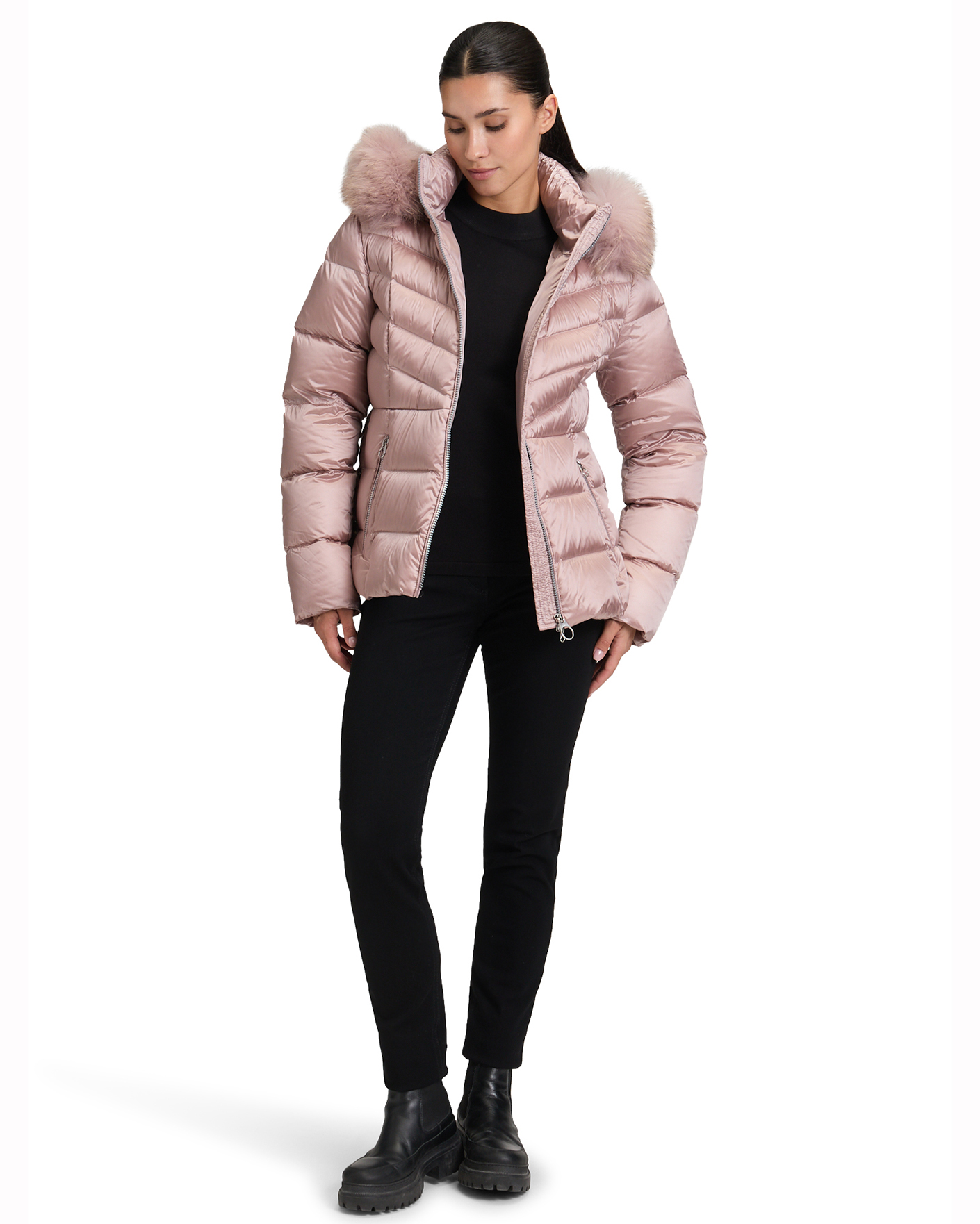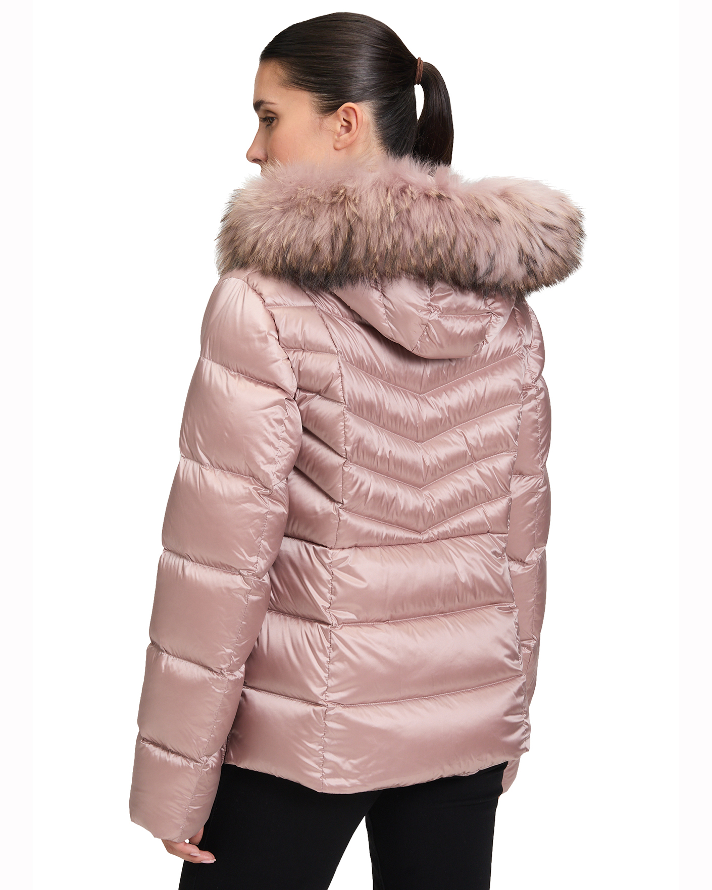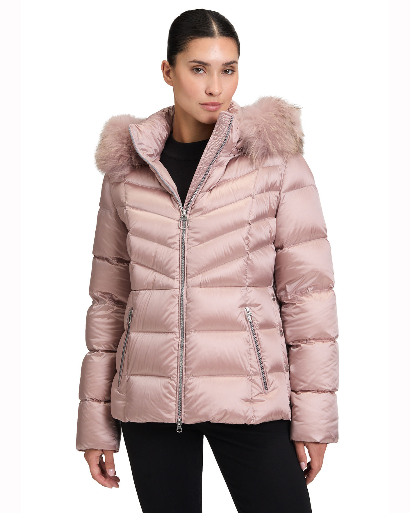 Теплая куртка Betty Barclay серо-розового цвета в горизонтальную стежку. Модель с воротником-стойка, съемный капюшон с меховой отделкой, застежка и боковые карманы на молнии. Куртка отлично впишется в ваш повседневный гардероб.